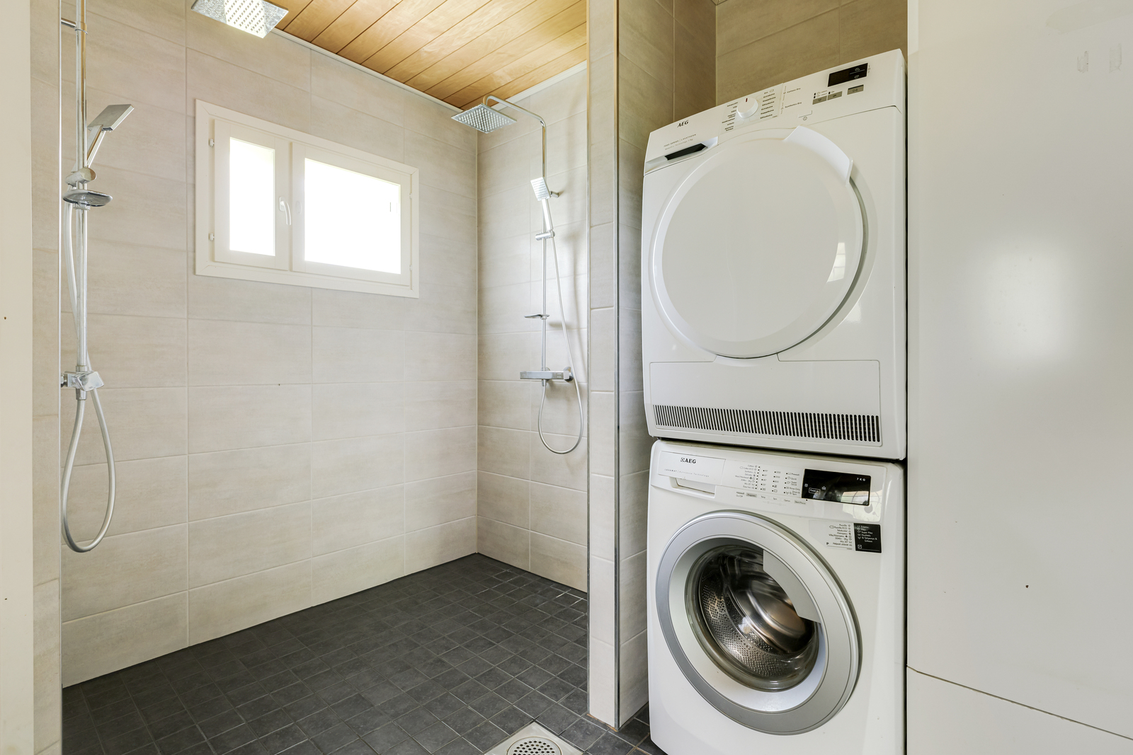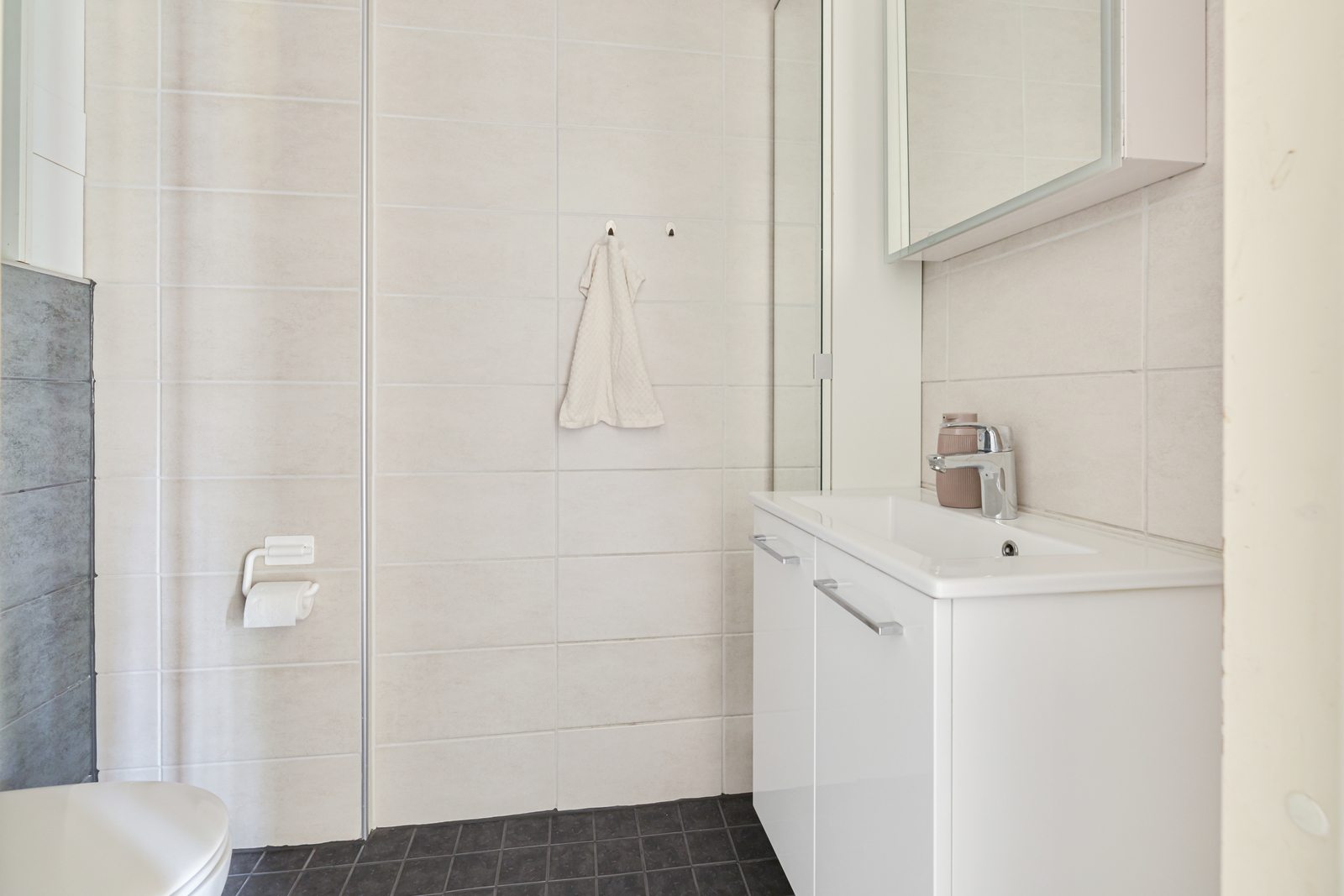 Suihku, peili, lattialämmitys, pesukoneliitäntä ja kiinteät valaisimet, seinät (kaakeli) |