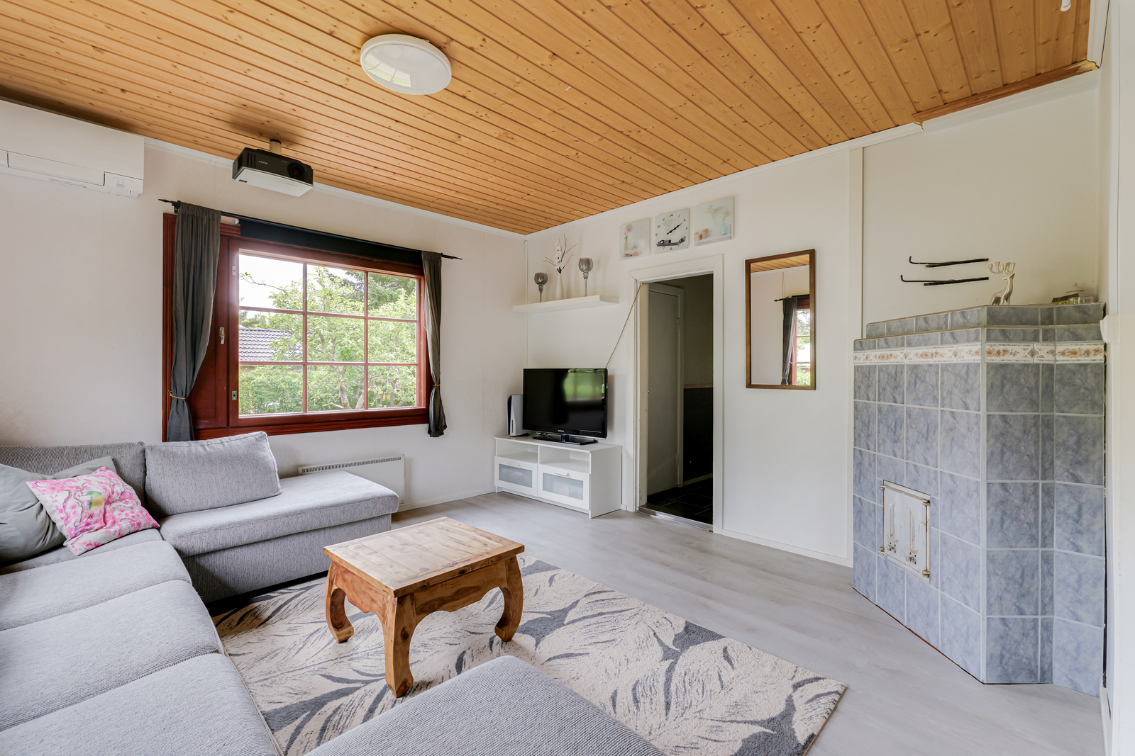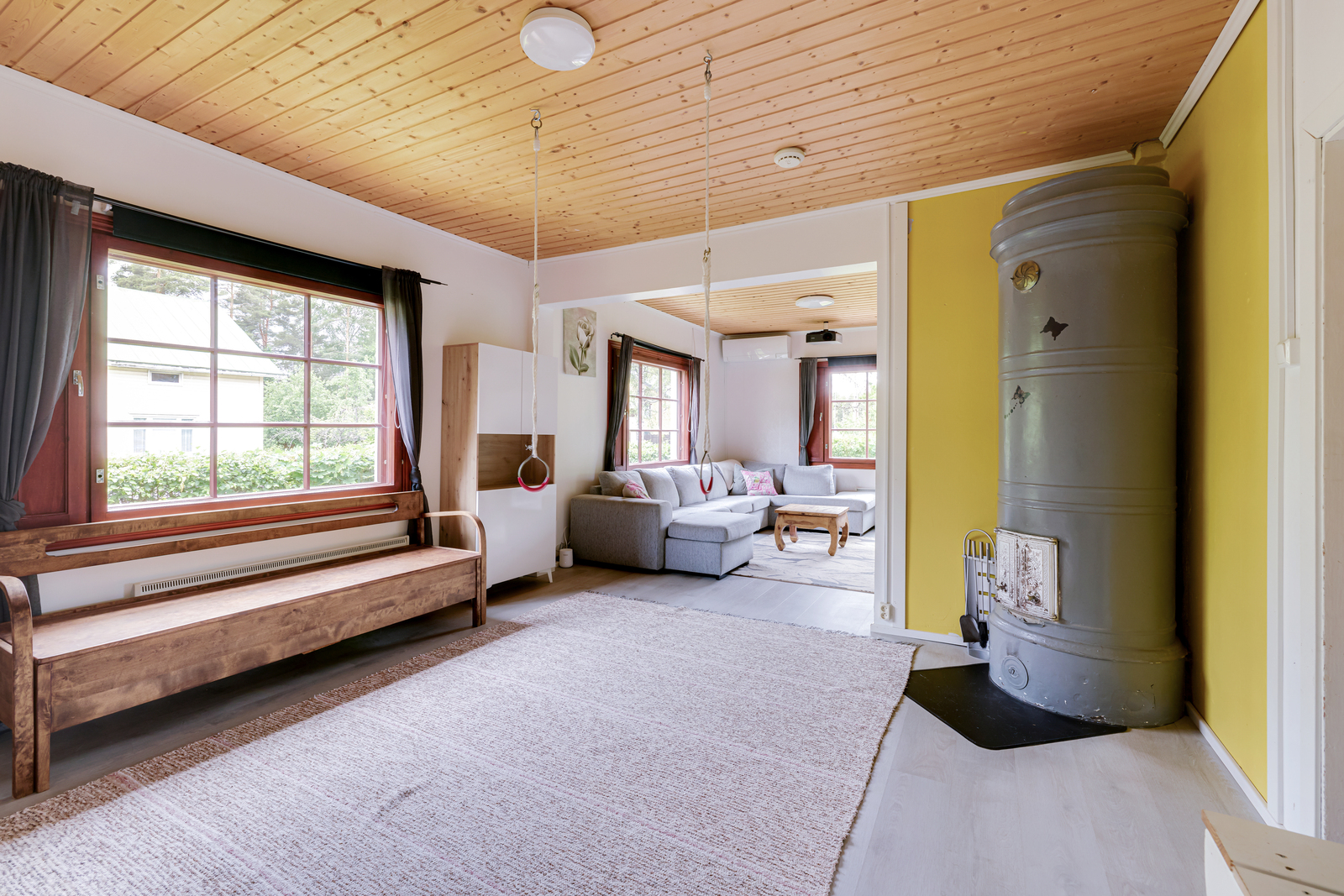 Avara olohuone, pönttöuuni ja leivinuuni luo lämpöä ja tunnelmaa kylminä iltoina.