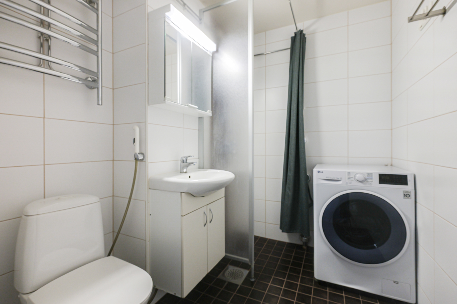 WC-istuin, peilikaappi, suihkuseinä, pesukoneliitäntä, suihku ja kiinteät valaisimet, seinät (kaakeli), lattiat (laatta) |