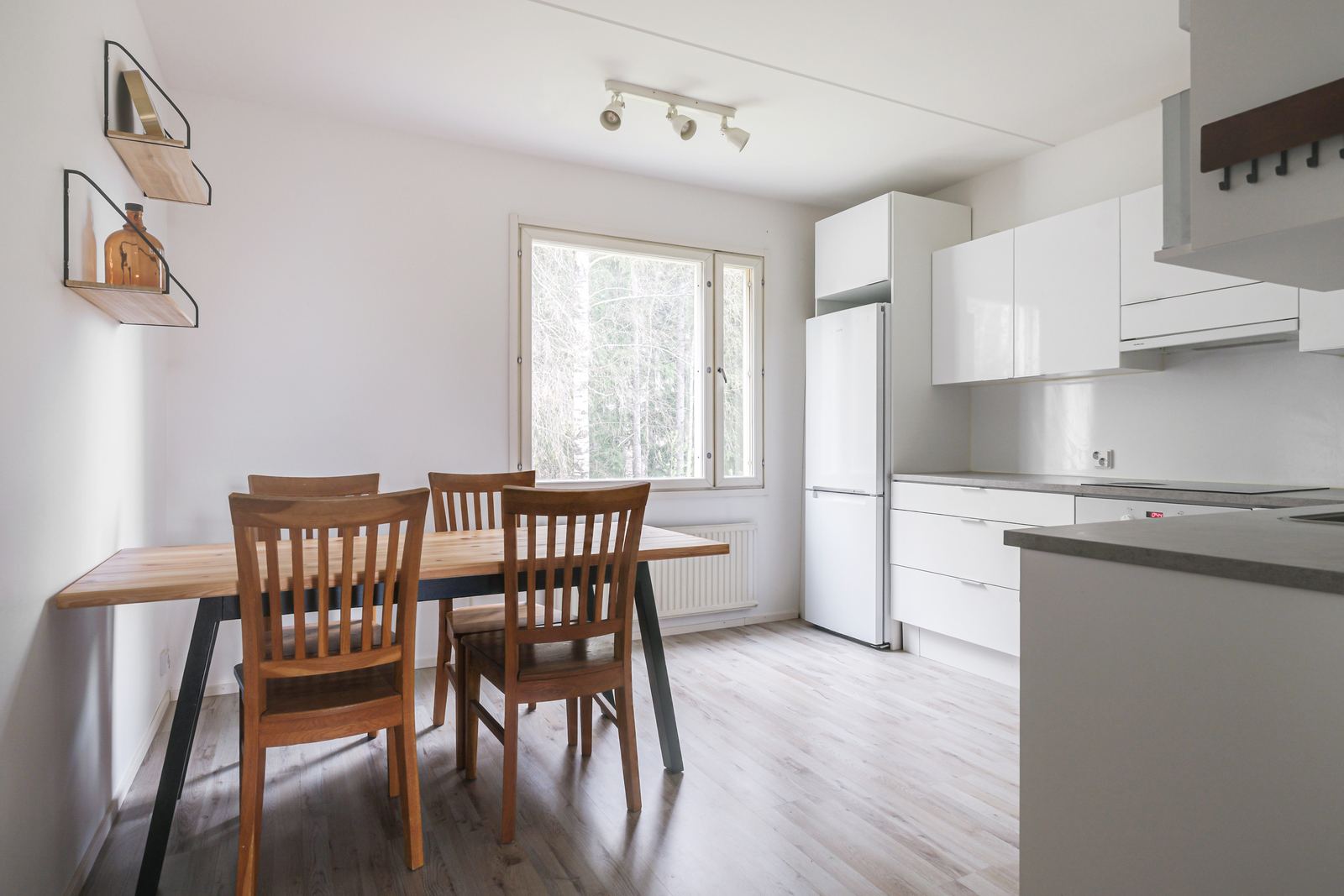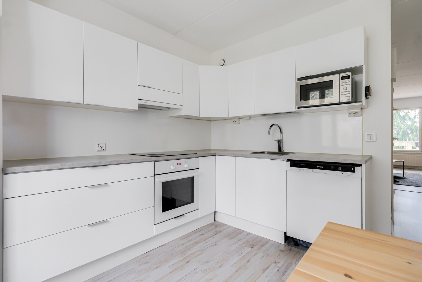 Lattiat (laminaatti), jääkaappipakastin (v. 2018), liesituuletin (v. 2018), astianpesukone (v. 2018, luukun jarrumekanismi ei toimi), erillisuuni (kiertoilma, v. 2018) ja liesitaso (induktio, v. 2018) |
