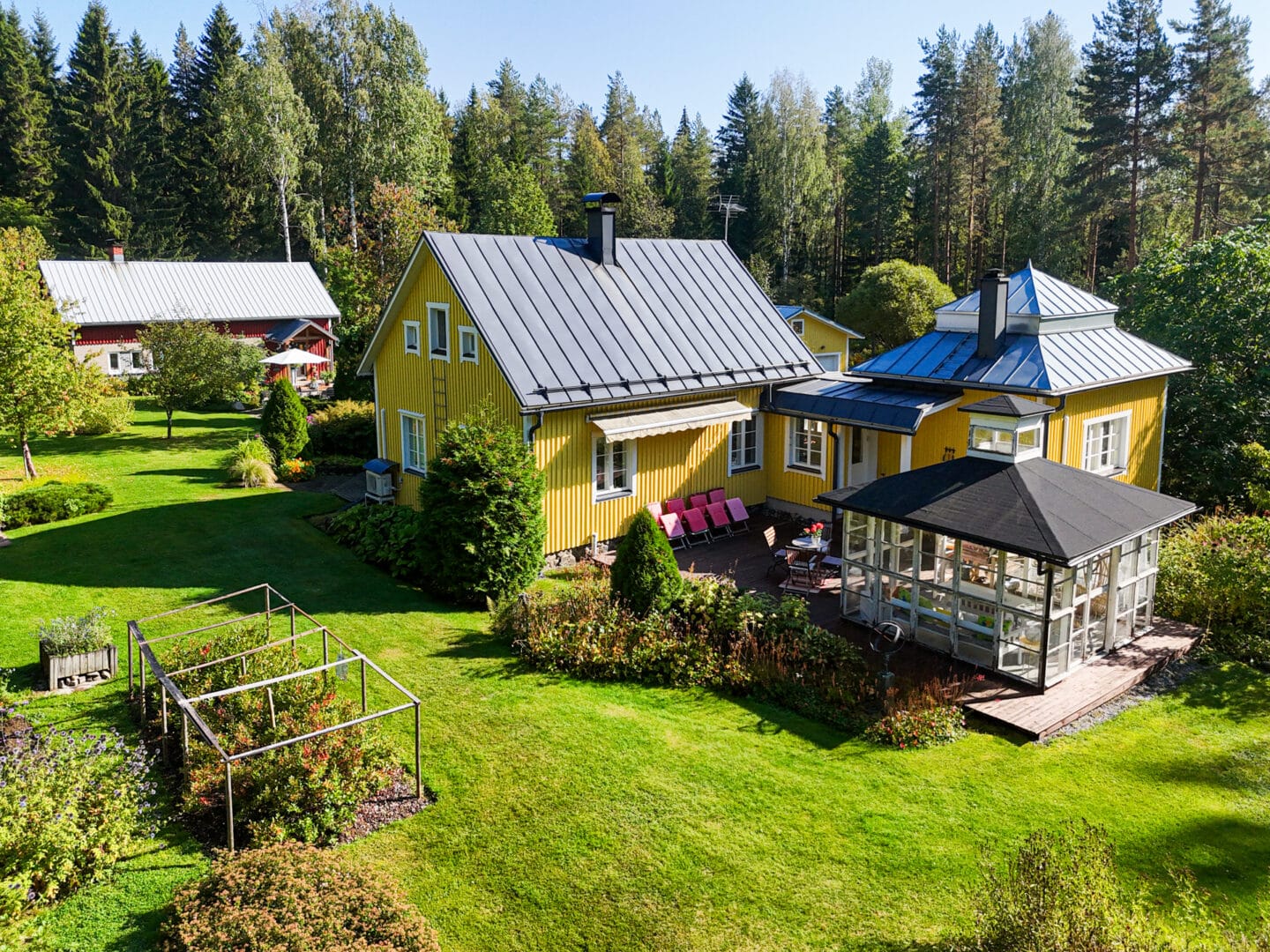 | Muut rakennukset | Vanha navettarakennus jonka muutos saunaksi ja takkahuoneeksi 1985, yläkerran huone valmistunut 2008 vuonna, kylpyhuone ja takkahuone uudistettu 2018 vuonna. Rakennuksessa myös varastotiloja, sekä ulkokautta portaat ullakolle. Navettarakennus; lämpimät käyttötilat (sauna, pesuhuone, takkahuone ja makuu- ja oleskeluhuone) n.63 m2, muut rakennuksen puolilämpimät ja kylmät varastotilat n.75 m2 Autotallirakennus kahdelle autolle, rakennuksessa myös lämmin verstastila, kylmä n.39 m2, lämmin verstashuone n.7 m2. Talon suurella terassilla on lasitettu huvimaja ja suuri markiisi, lisäksi pihapiirissä on ulkokeittiö, sekä vanha kunnostamaton savusauna, puucee, puuvarastoja, kasvihuone ja varasto puutarhavälineille. |