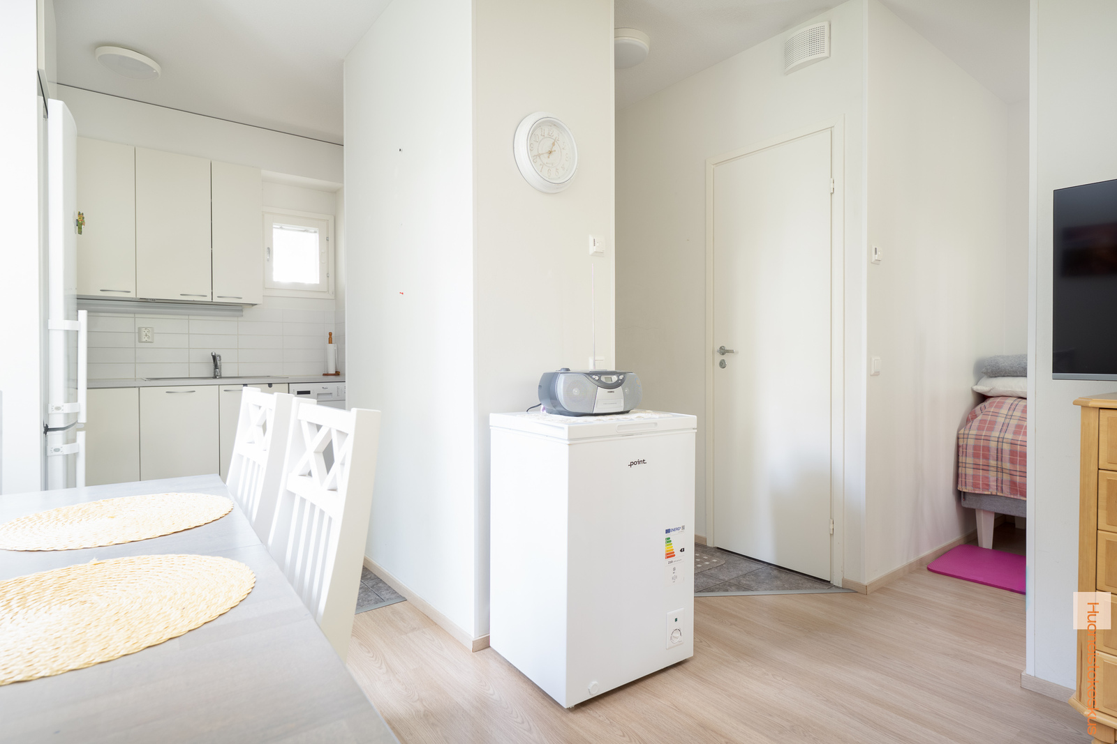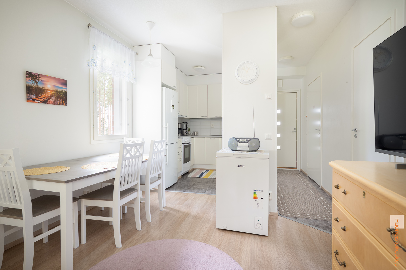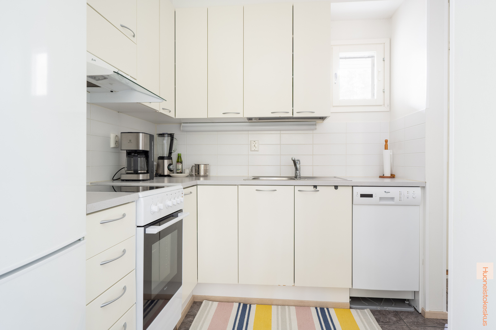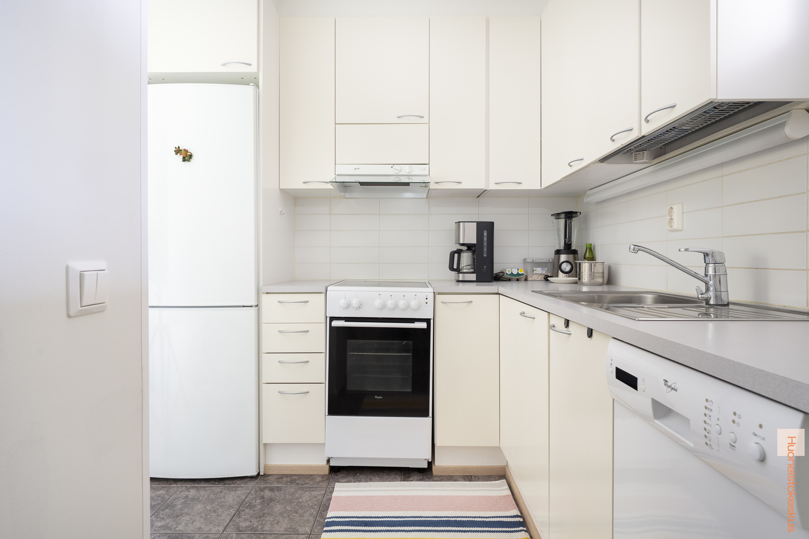 | Keittiön kuvaus | Liesi (sähköliesi), työtasot (laminaatti), seinät (maali), lattiat (laatta), liesituuletin, liesi, astianpesukone ja jääkaappipakastin |