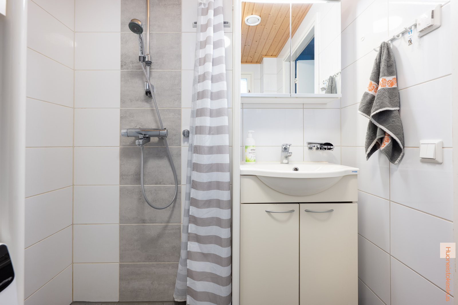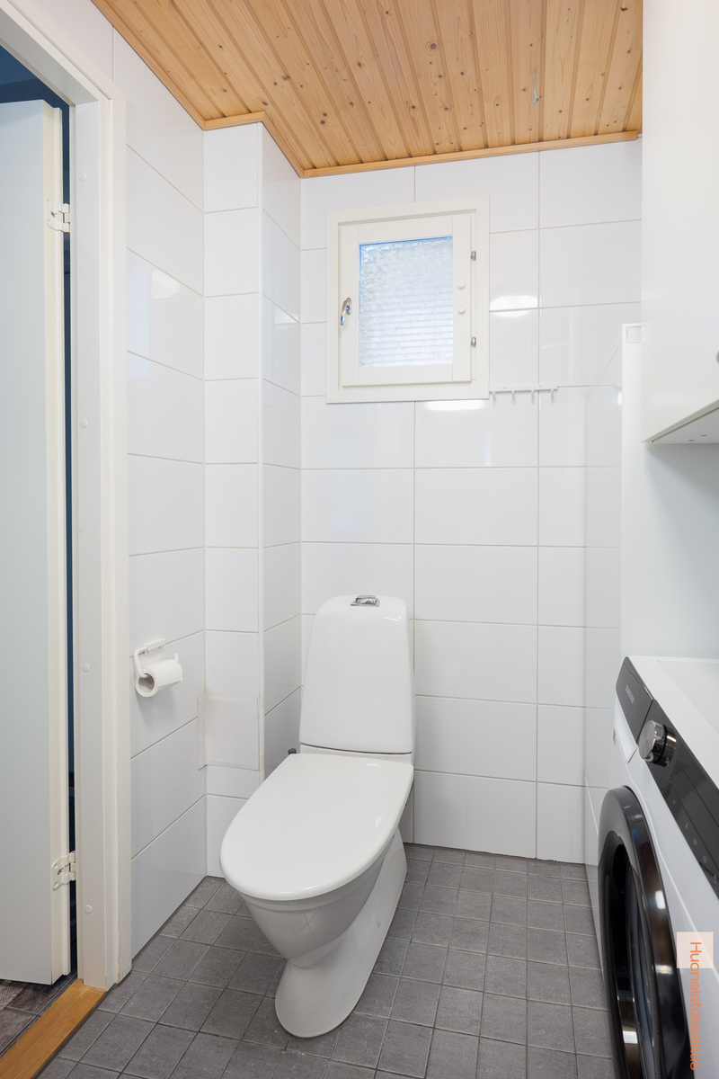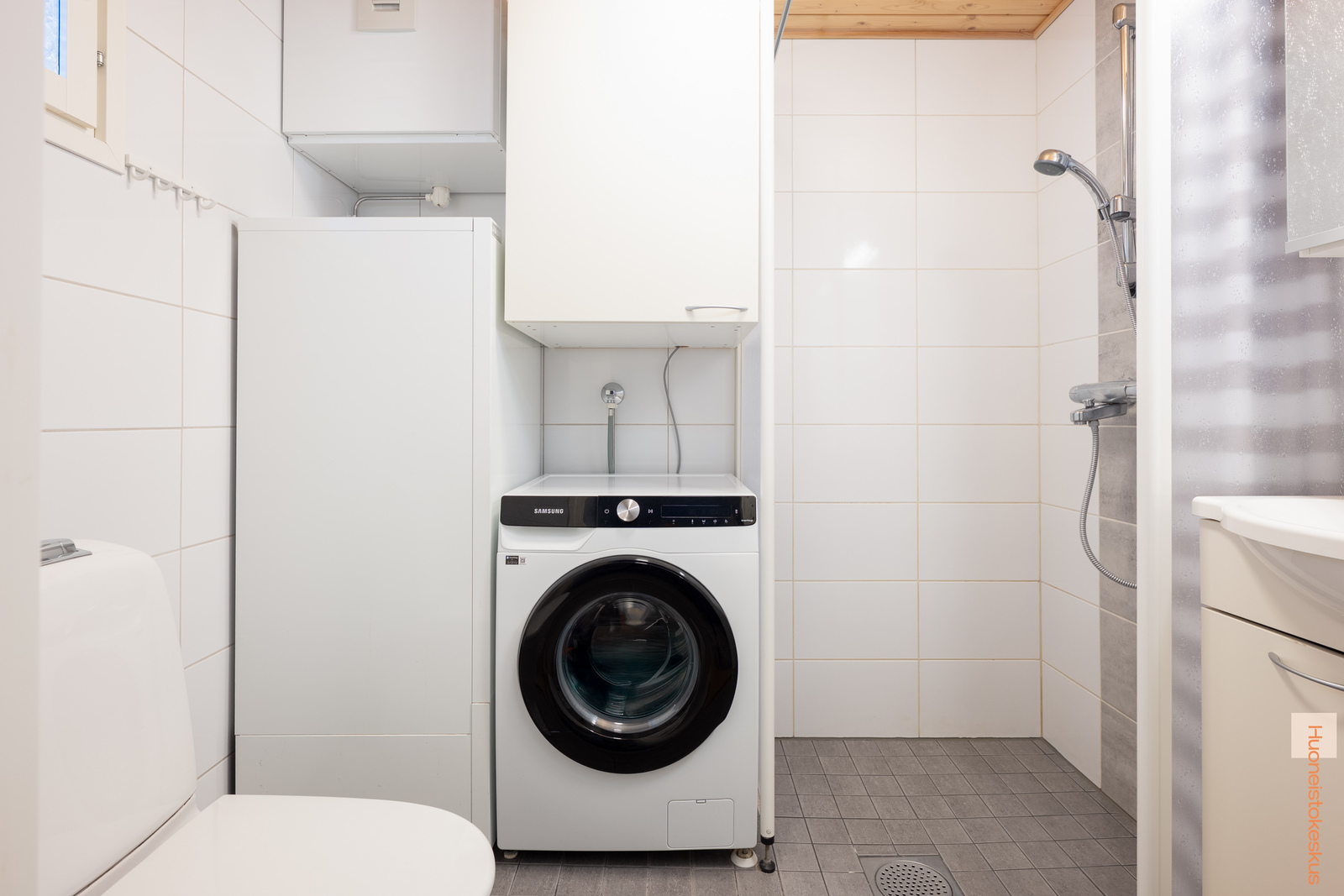 | Kylpyhuoneen kuvaus | Suihku, wc-istuin, lattialämmitys, peilikaappi, pesukoneliitäntä, suihkuseinä ja kiinteät valaisimet, seinät (kaakeli), lattiat (laatta) |