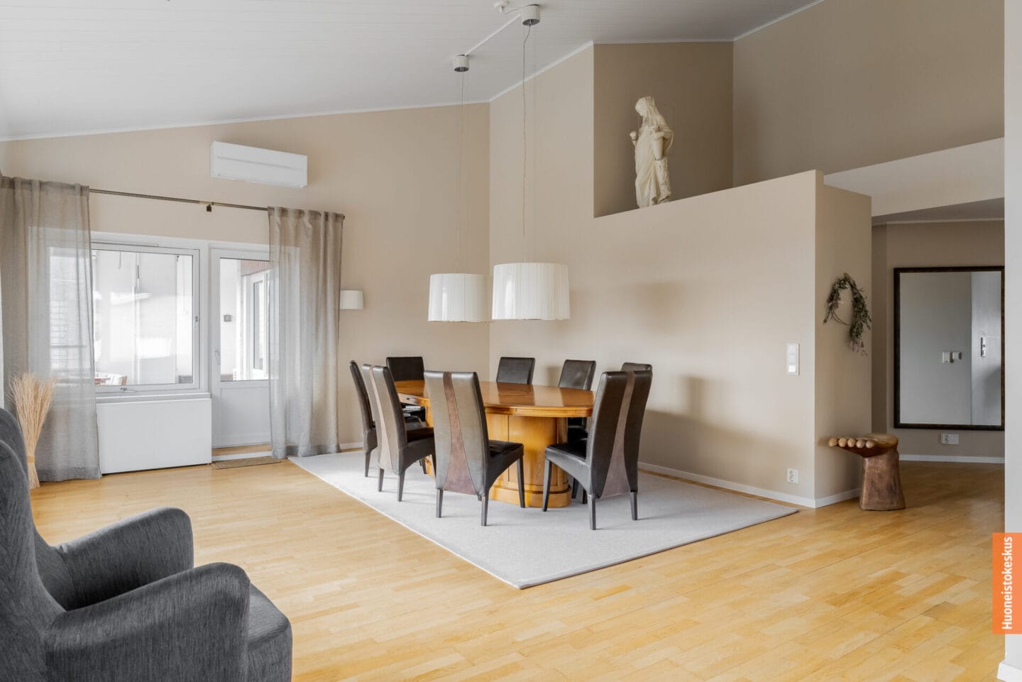 Tämä 132 m² ullakkohuoneisto tarjoaa harvinaista tilan tuntua ja muunneltavuutta. Olohuone on avara ja monikäyttöinen – nykyisellään siellä on suuri ruokapöytä sekä syvennyksessä tv:n katselupaikka, mutta tila elää helposti tarpeidesi mukaan. Tila on sen verran suuri, että voit sijoittaa ruokailuryhmän ikkunoiden ääreen maisemien äärelle ja rakentaa taakse viihtyisän oleskelutilan sohvineen. Syvennyksestä voi puolestaan luoda kolmannen makuuhuoneen tai pyhittää sen erilliseksi ruokailutilaksi.