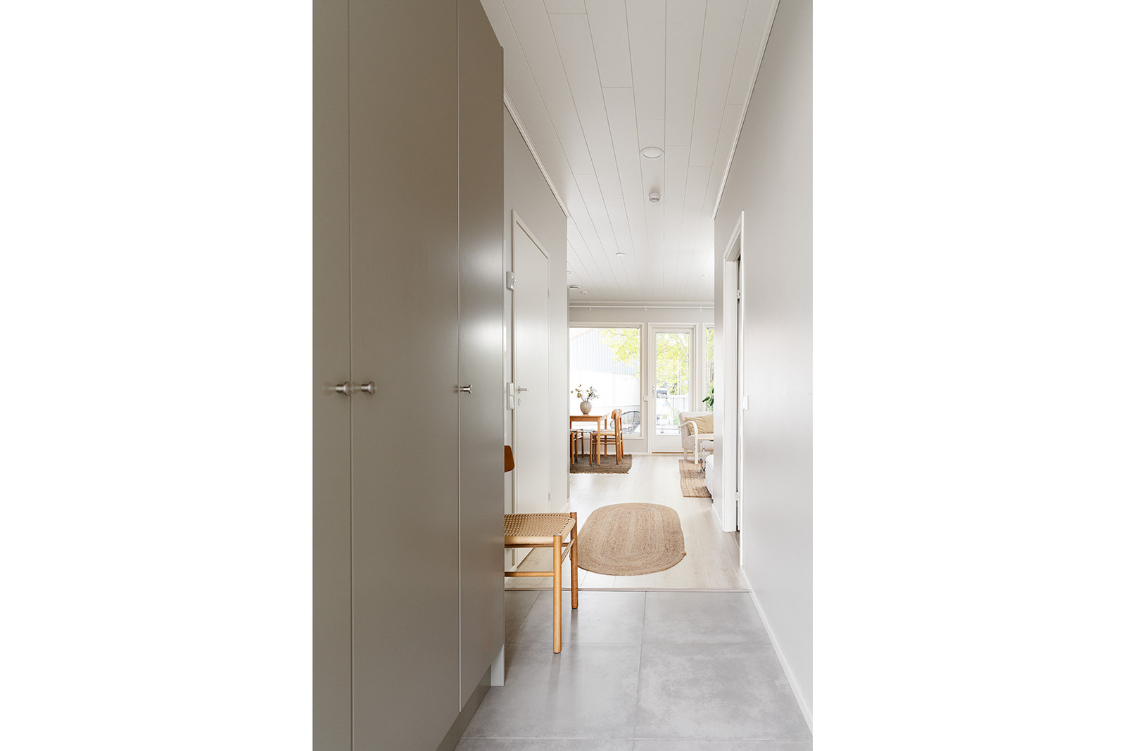 Säilytystilaa seinällinen kaapistoja makuuhuoneessa ja eteisessä lähes saman verran lisää. Lisäksi ulkovarasto heti sisäänkäynnin vieressä.