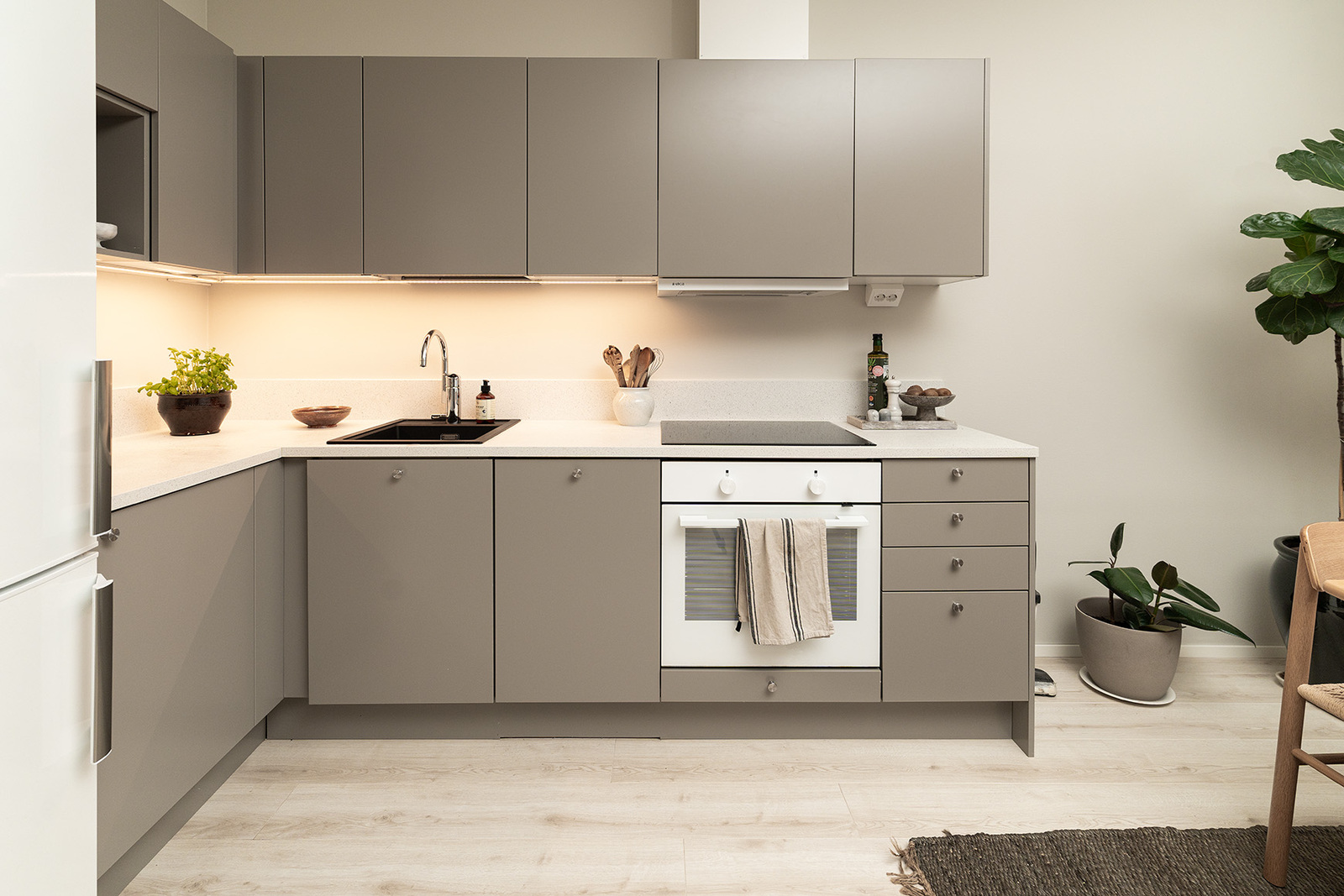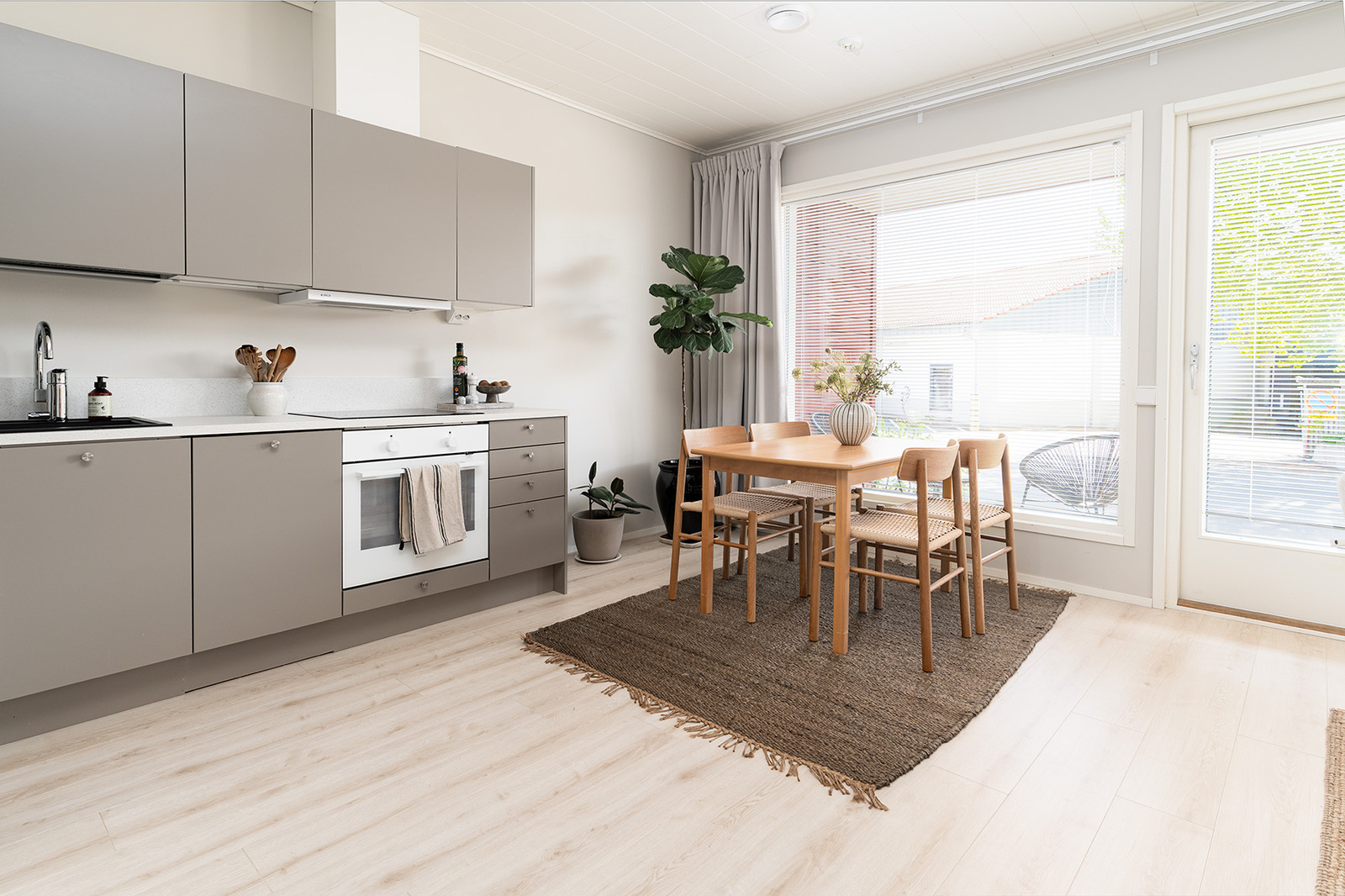 | Keittiön kuvaus | Liesi (Induktioliesi ja erillisuuni, liesitaso), seinät (maali), lattiat (laminaatti), liesi, jääkaappipakastin, erillisuuni, liesituuletin, astianpesukone ja kiinteät valaisimet, liesitaso |