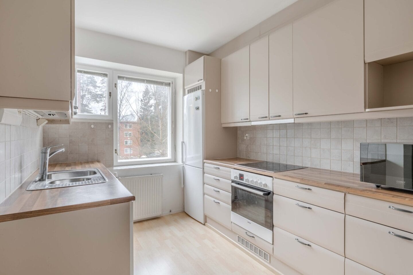 Keittiön kuvaus Liesi (Keraaminen liesi), seinät (maali), lattiat (laminaatti), jääkaappipakastin