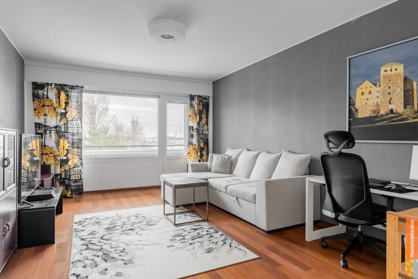 Makuuhuoneesta avautuu haitarioven kautta tilava olohuone, joka muuntautuu moneen: tänne mahtuu reilun oleskelutilan lisäksi myös työpiste etätyöhön. Olohuoneesta on käynti lasitetulle parvekkeelle, joka toimii lähes lisähuoneena suuren osan vuodesta. Parvekkeelta avautuvat pitkälle kantavat maisemat, ja näkymää elävöittävät aamuisin ja iltaisin ohi lipuvat risteilylaivat – harvinaista ja rauhoittavaa katseltavaa arjen keskellä.