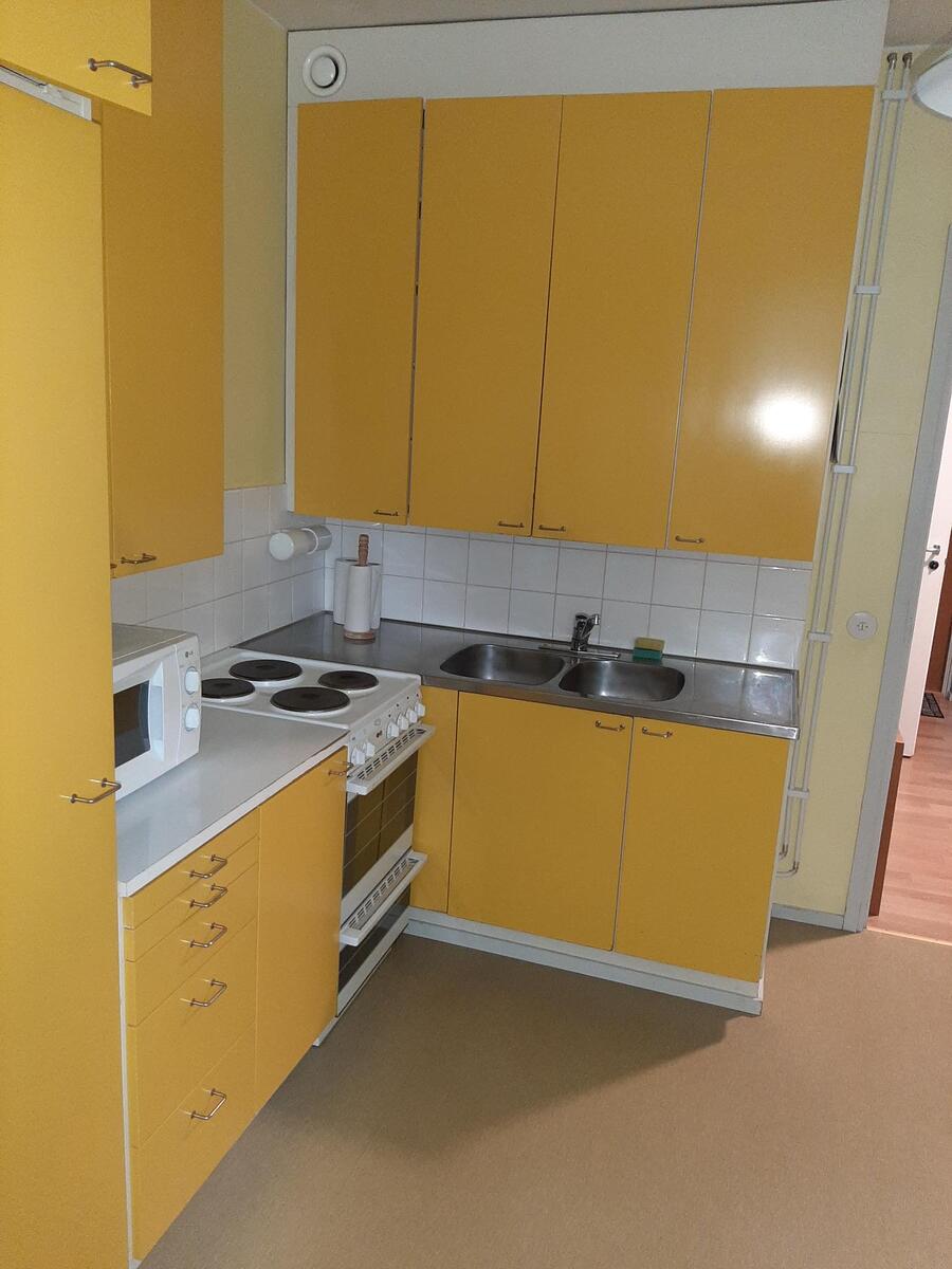 | Keittiön kuvaus | Liesi (sähköliesi), seinät (maali), lattiat (muovimatto), jääkaappi, liesi, erillinen pakastin ja kiinteät valaisimet |