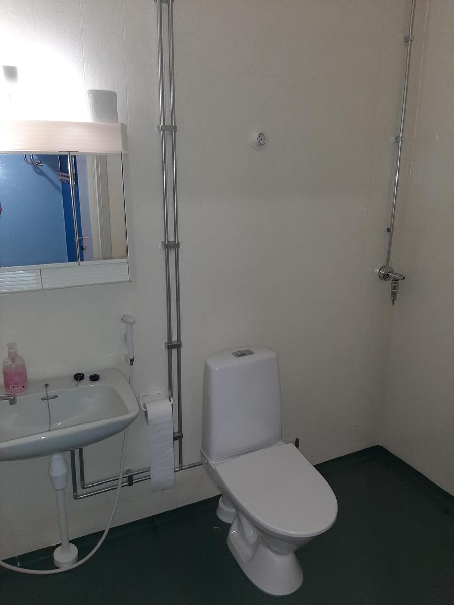 | Kylpyhuoneen kuvaus | Peilikaappi, suihku, pesukoneliitäntä, wc-istuin ja kiinteät valaisimet, seinät (muovimatto), lattiat (muovimatto) |