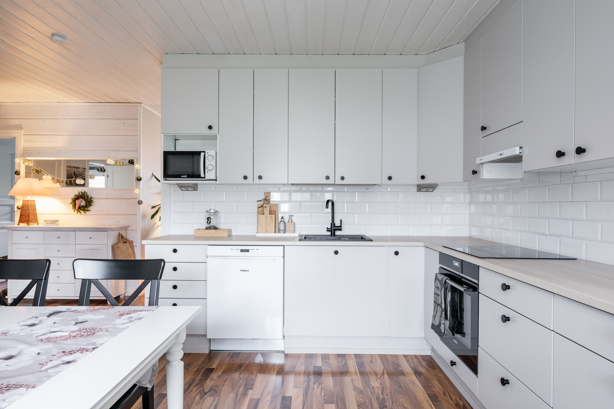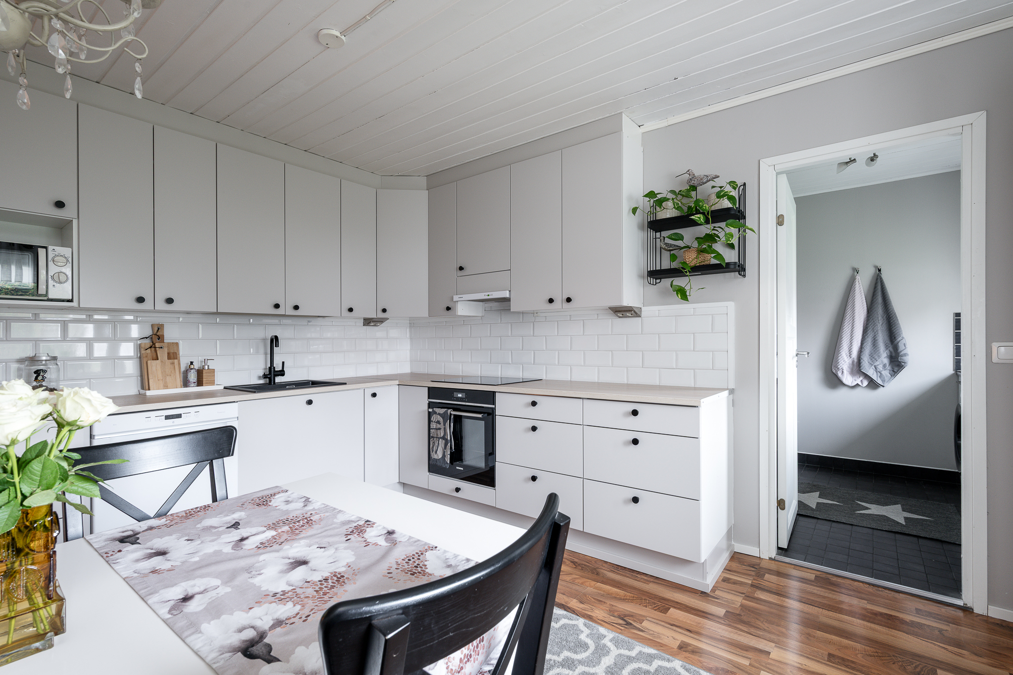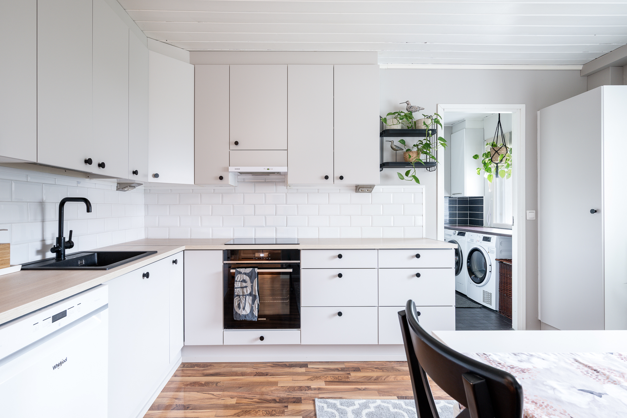 | Keittiön kuvaus | Liesi (Keraaminen liesi), työtasot (laminaatti), seinät (maali), lattiat (laminaatti), jääkaappi, erillinen pakastin ja astianpesukone |