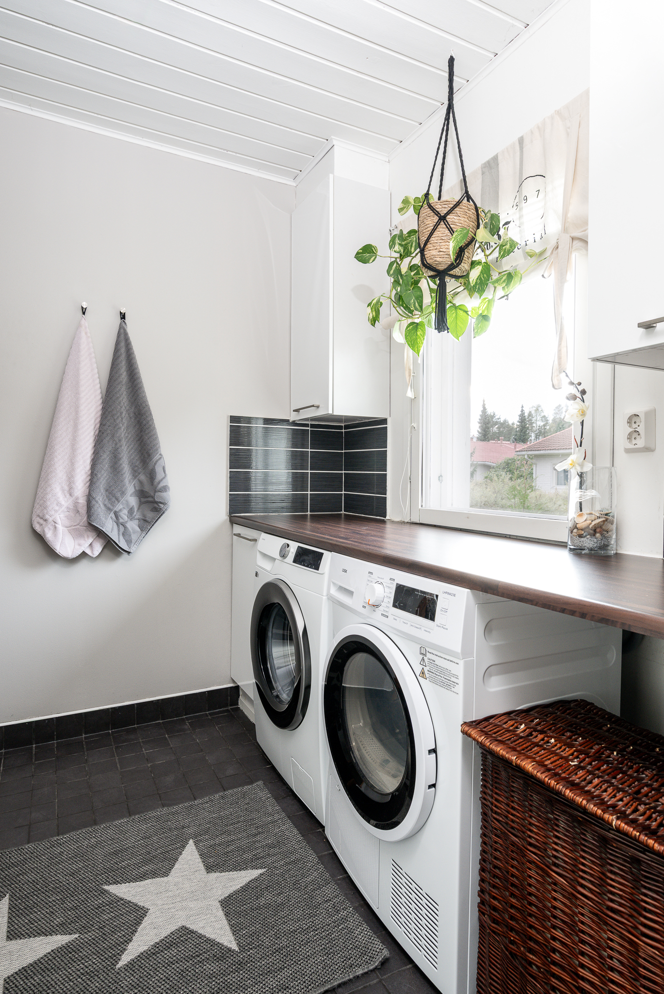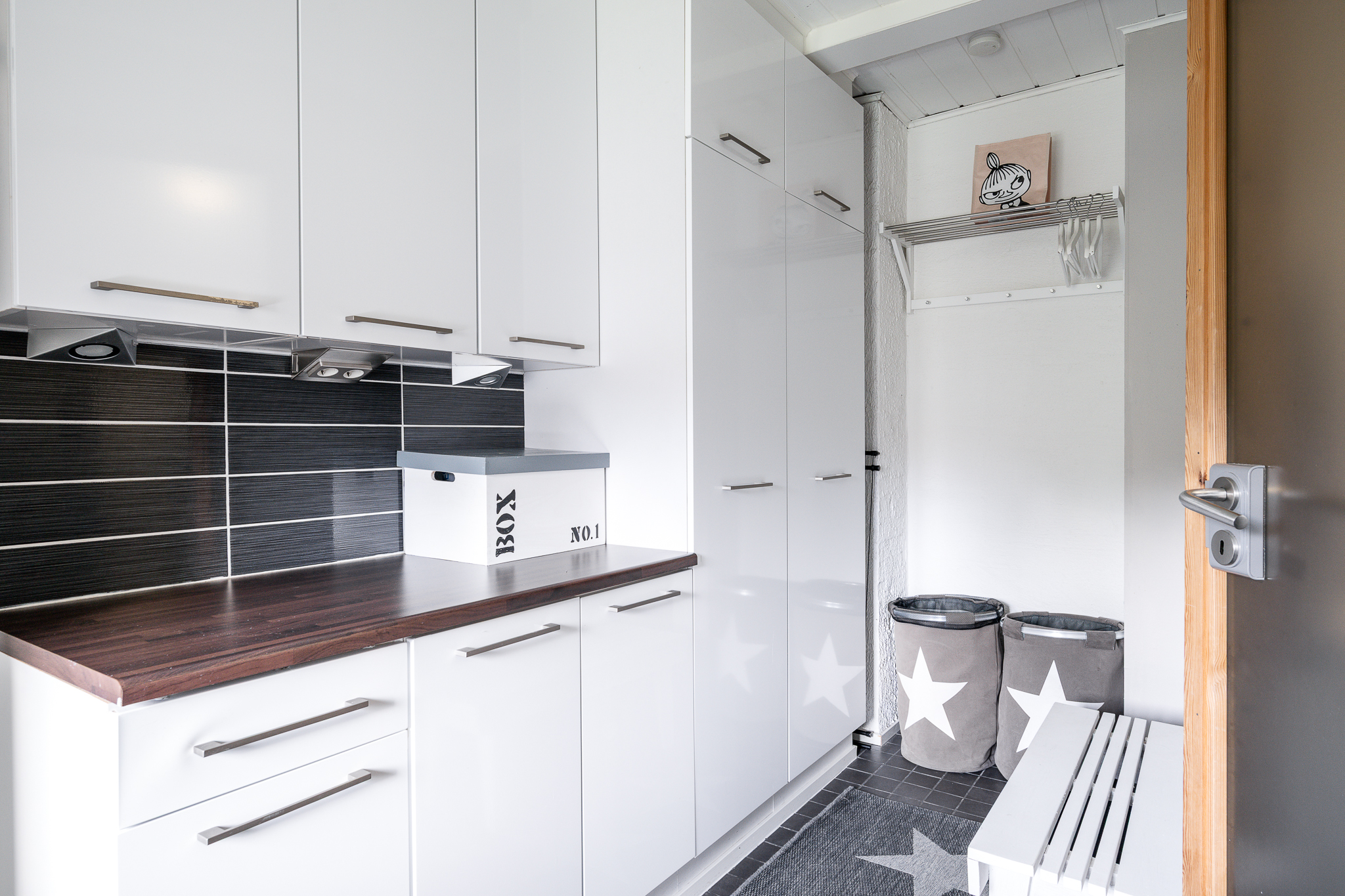 | Kodinhoitohuoneen kuvaus | Pesukoneliitäntä, lattialämmitys ja takkahuoneen kautta käynti ulos, lattiat (laatta), seinät (maali) |