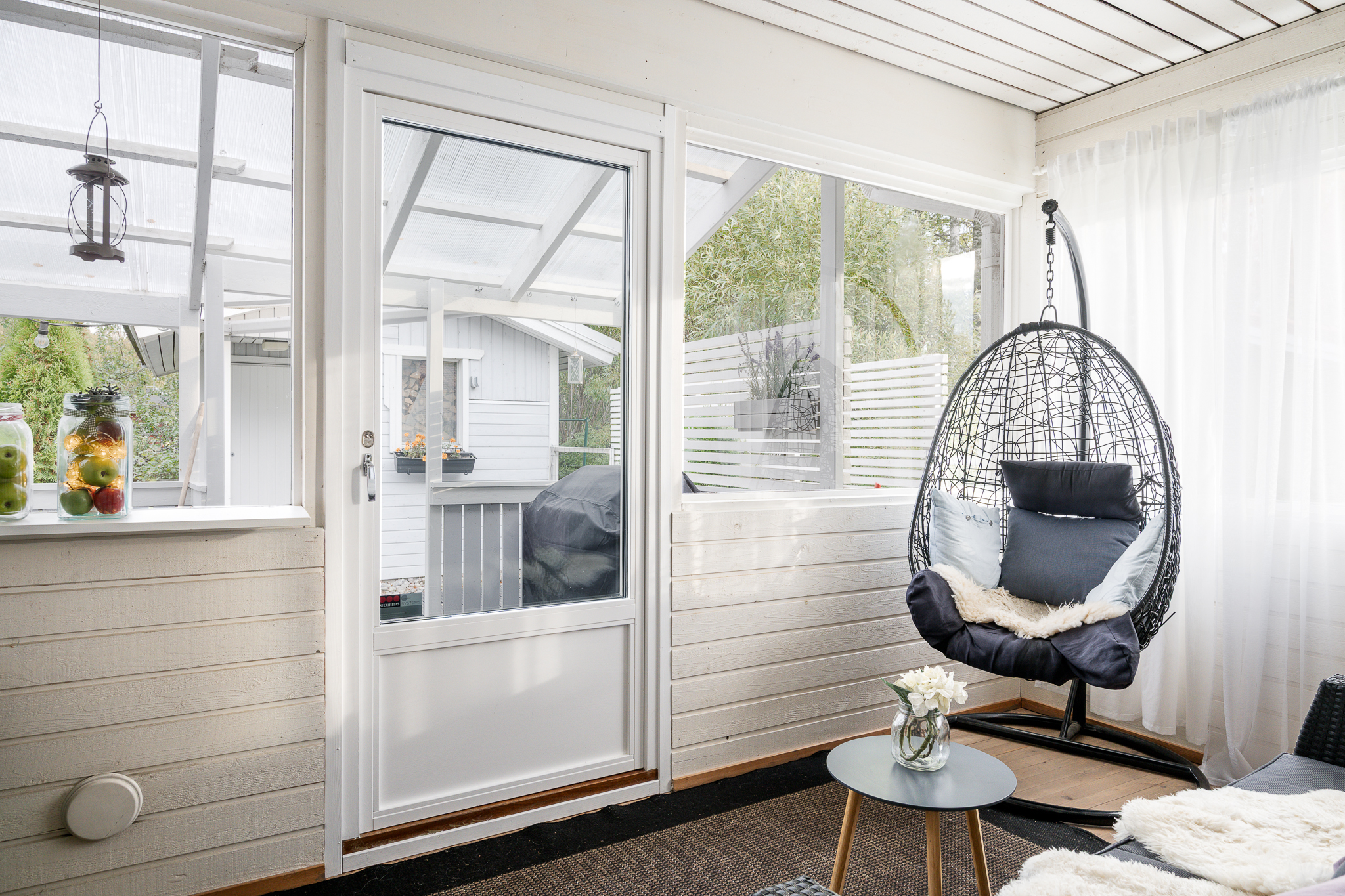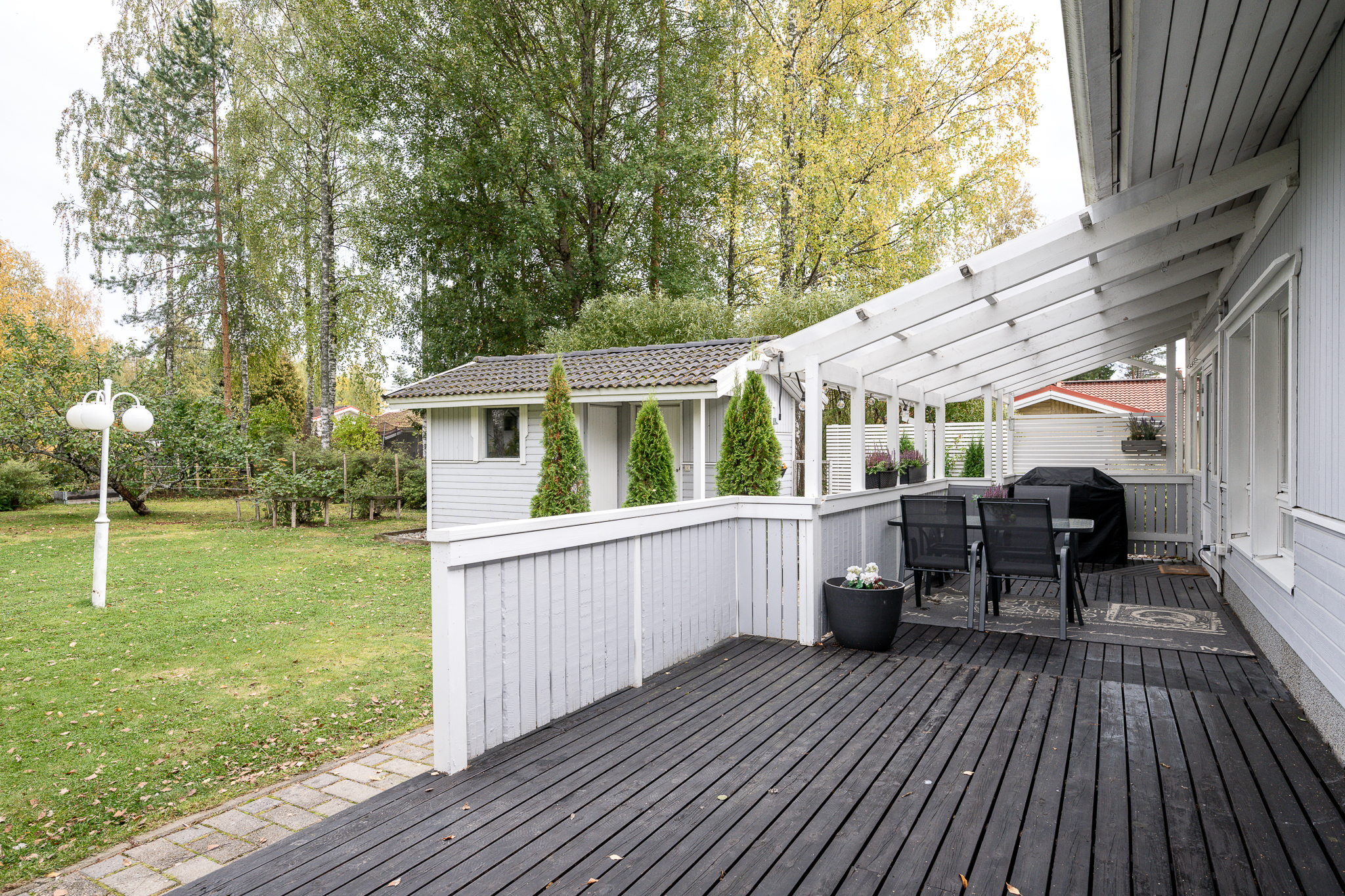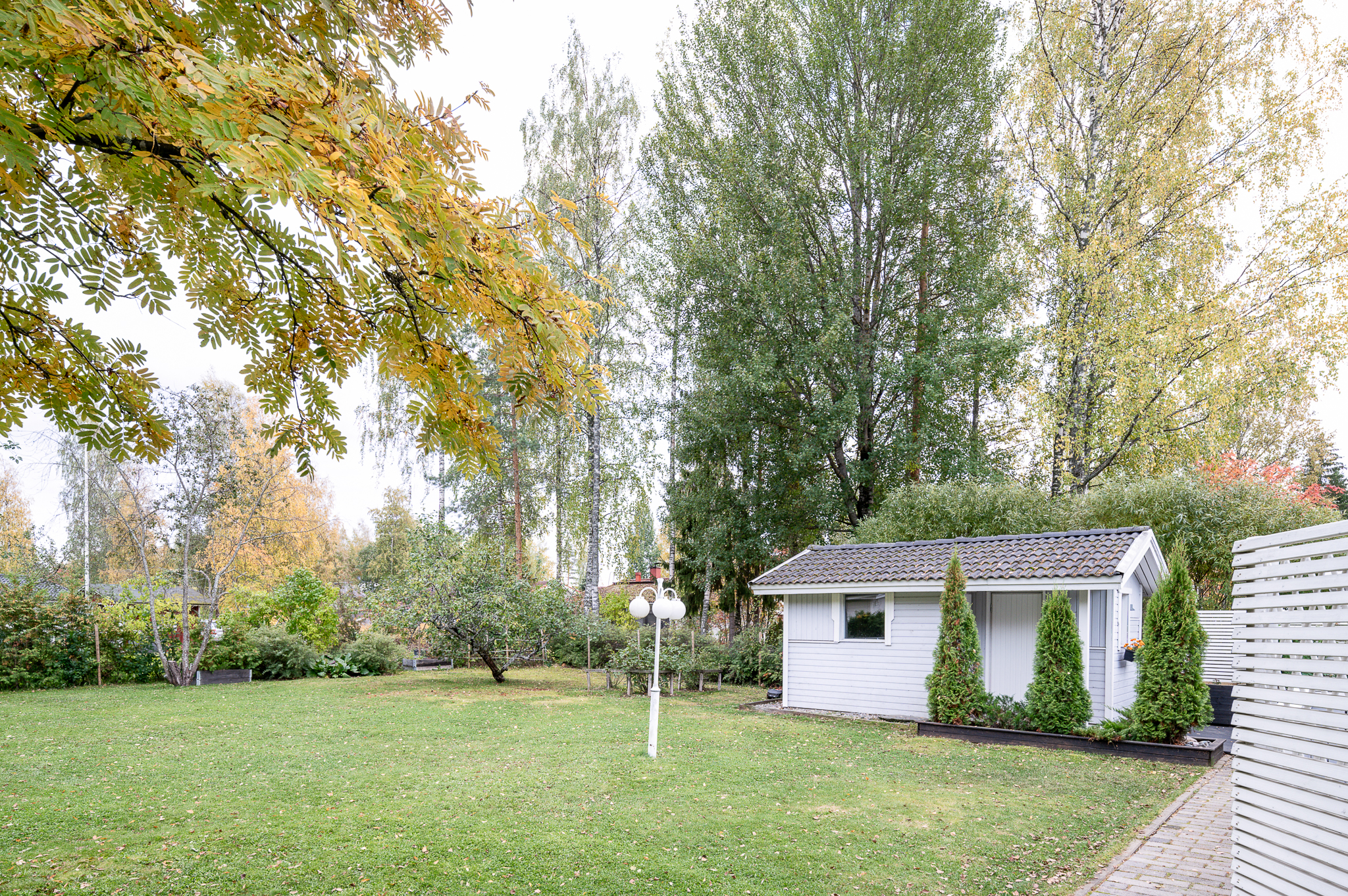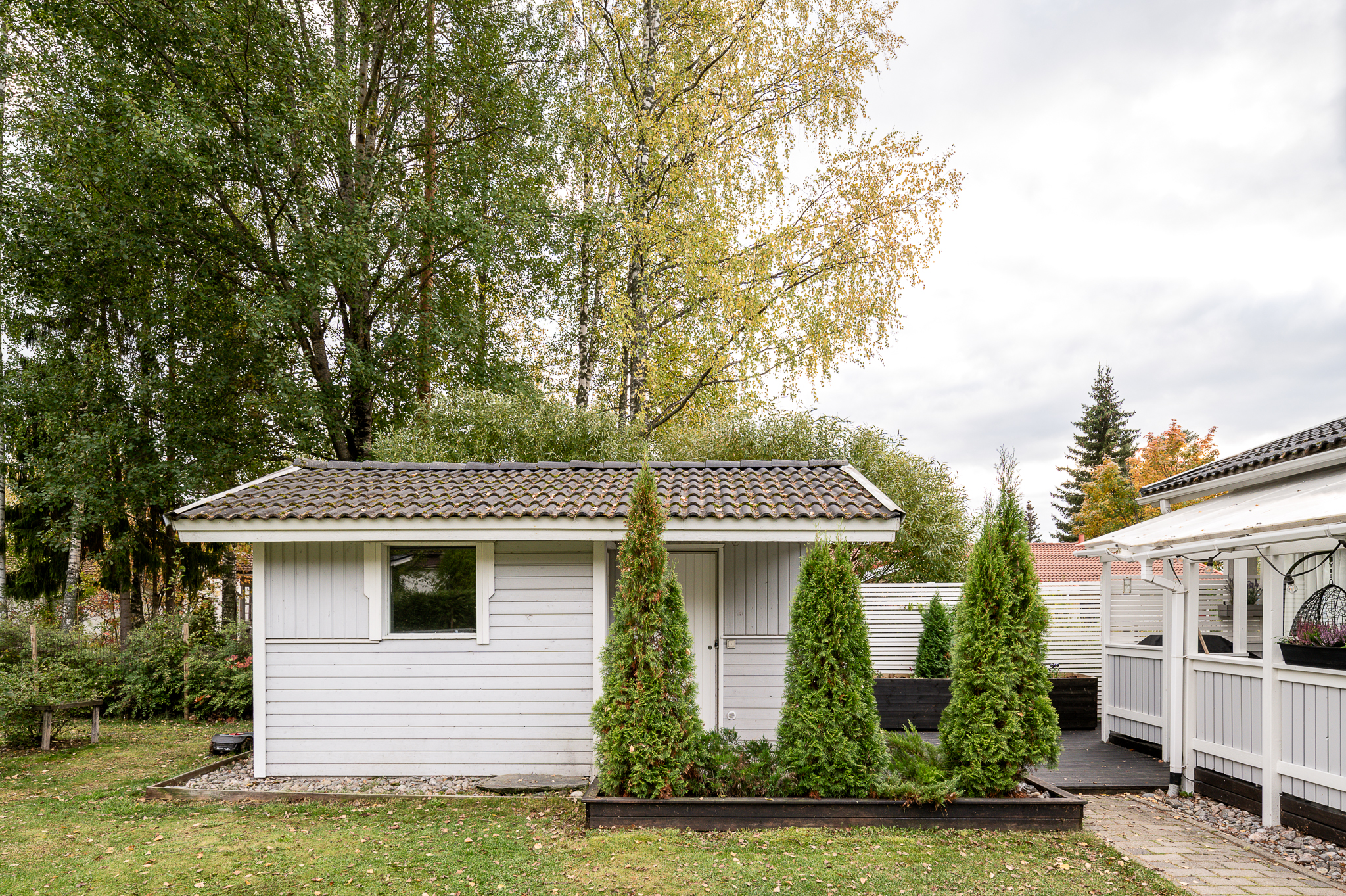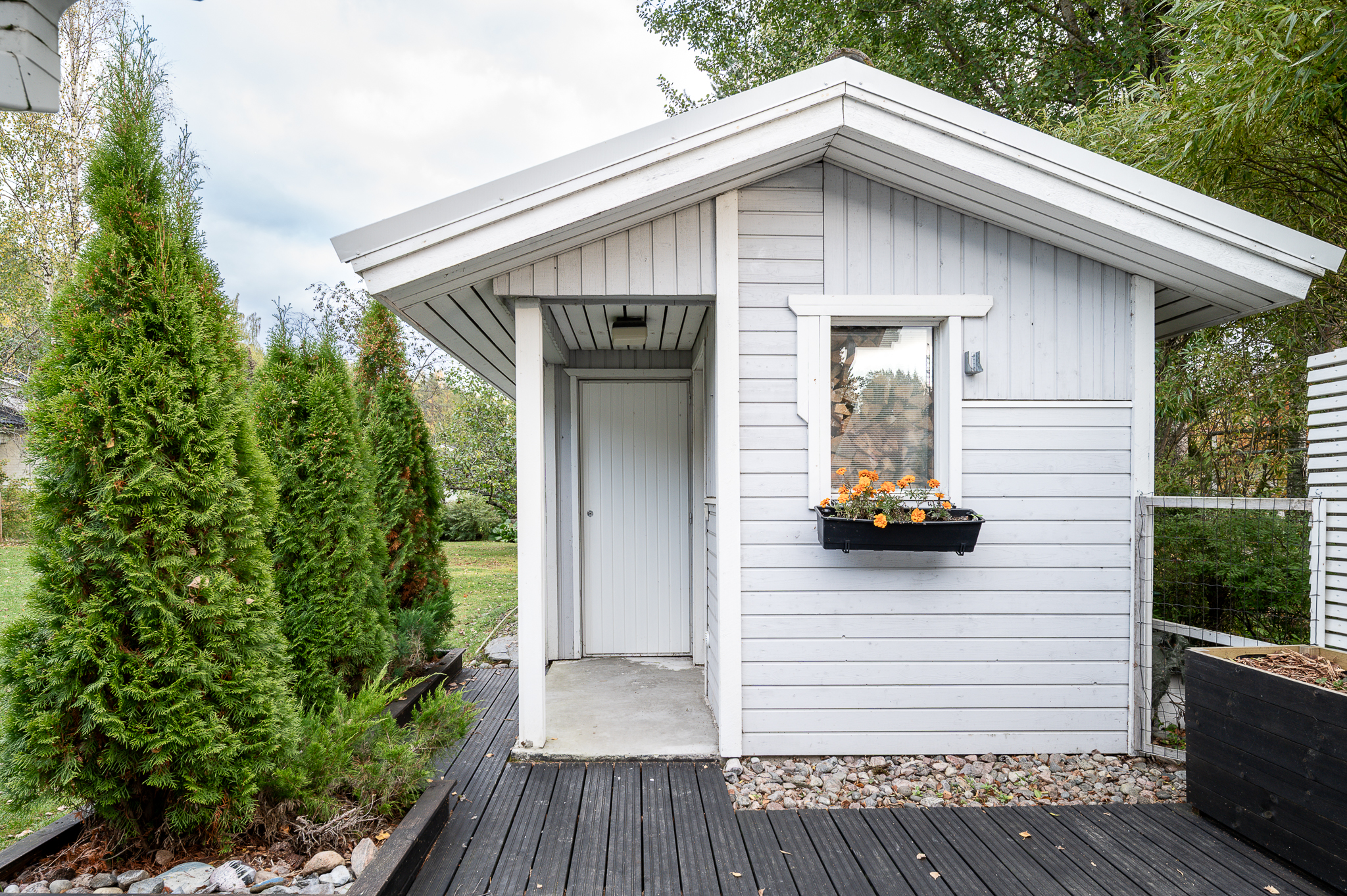 Pihalta löytyy erillinen piha-aitta/varasto, joka taipuu moneksi: harrastetilaksi, vierasmajaksi tai vaikka kesäisin nuorison omaksi sopiksi.
