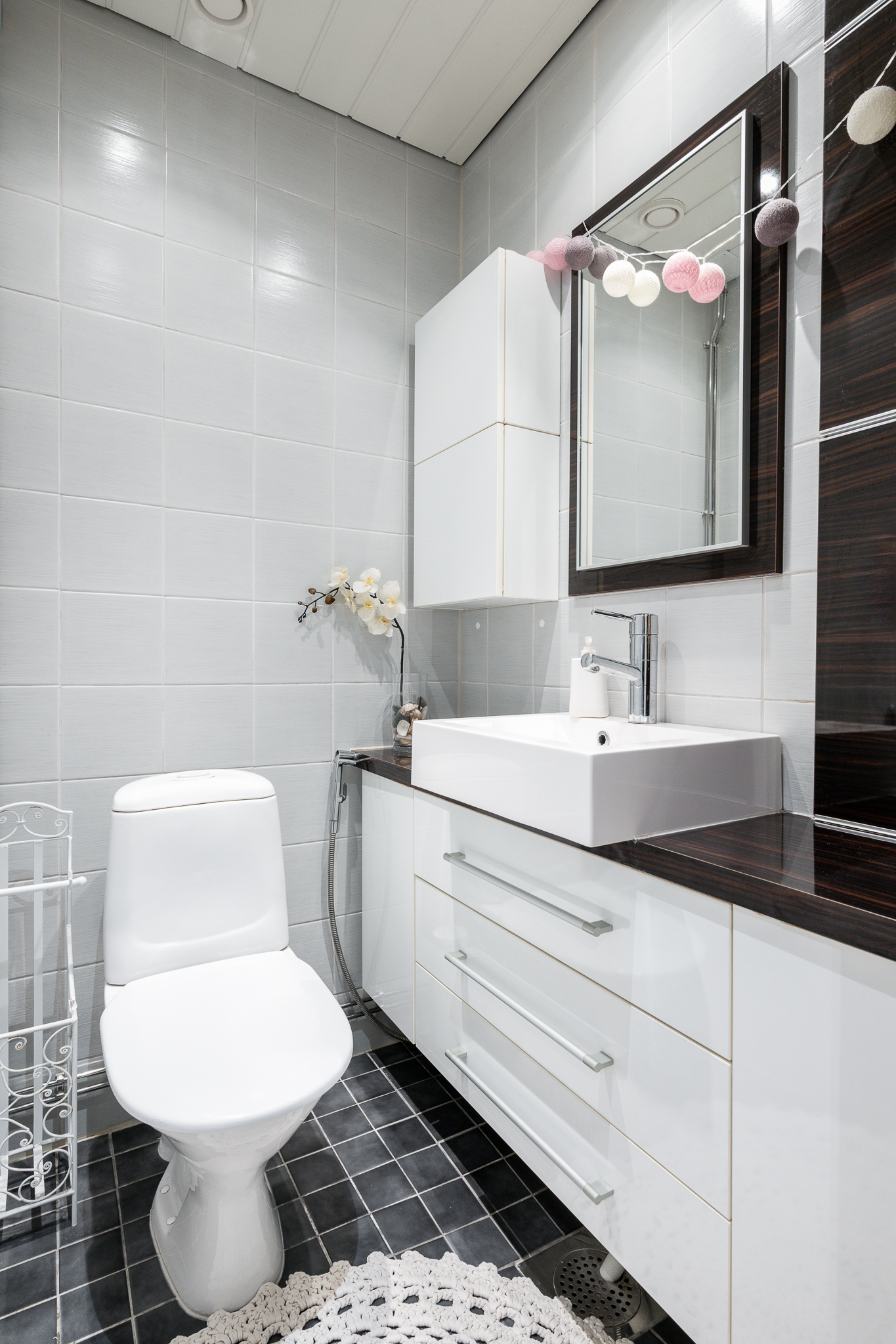 | WC-tilojen kuvaus | Lukumäärä: 1, WC-istuin, pesuallas, bidee-suihku ja seinällä kaapisto, seinät (Kaakeli), lattiat (Laatta) |