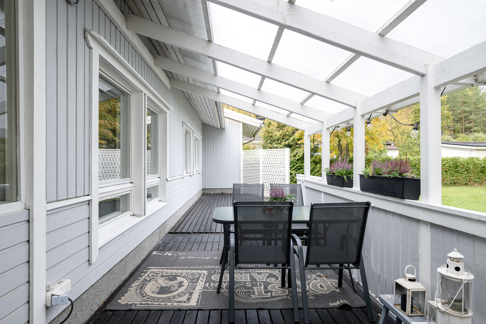 Autotalli, lämmin varasto ja tekninen tila lisäävät arjen sujuvuutta. Katettu terassi toimii toisena olohuoneena lämpiminä kuukausina, täydellinen paikka vapaa-ajan viettoon, grilliherkuille ja ystävien seurasta nauttimiseen.