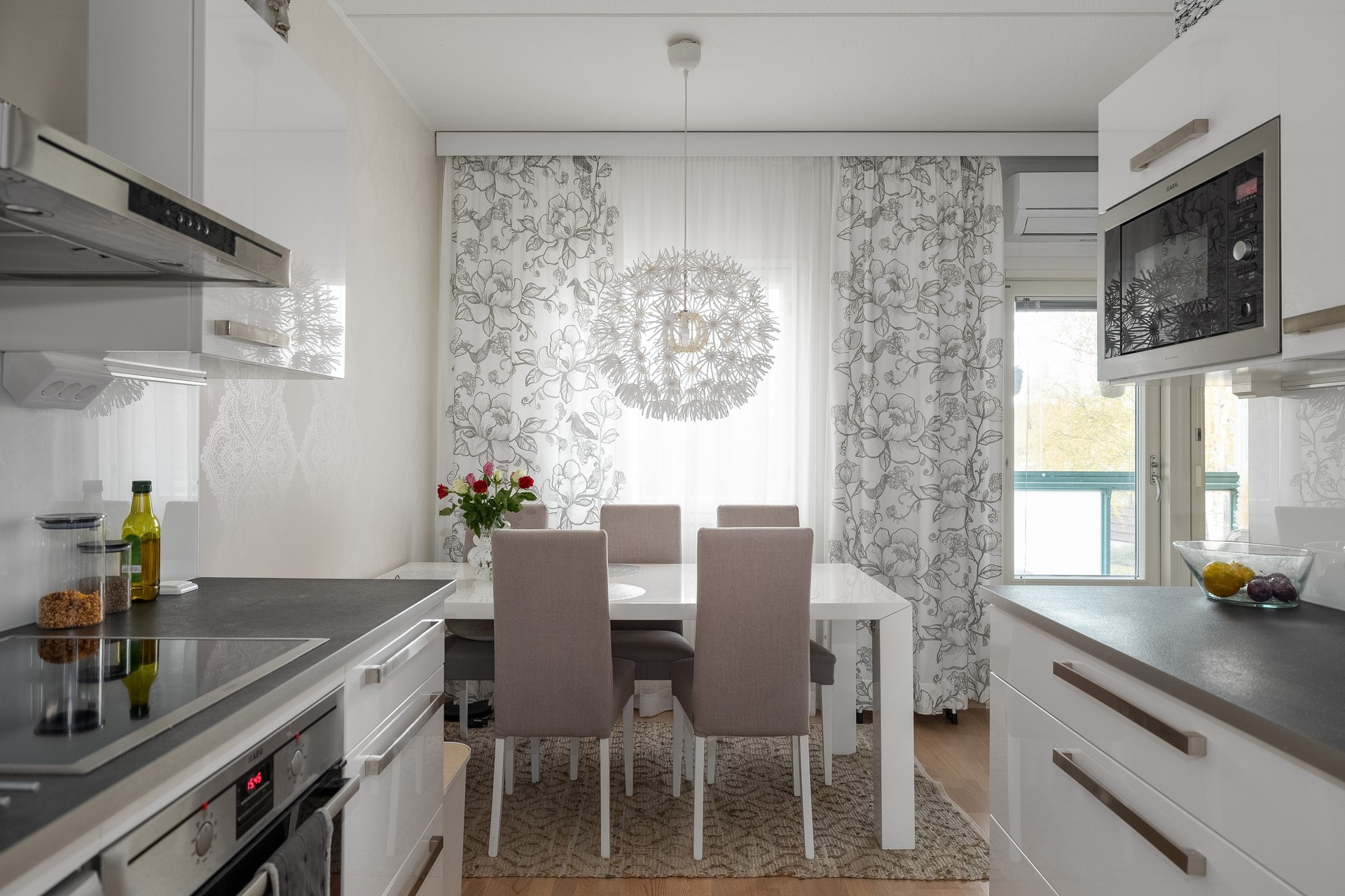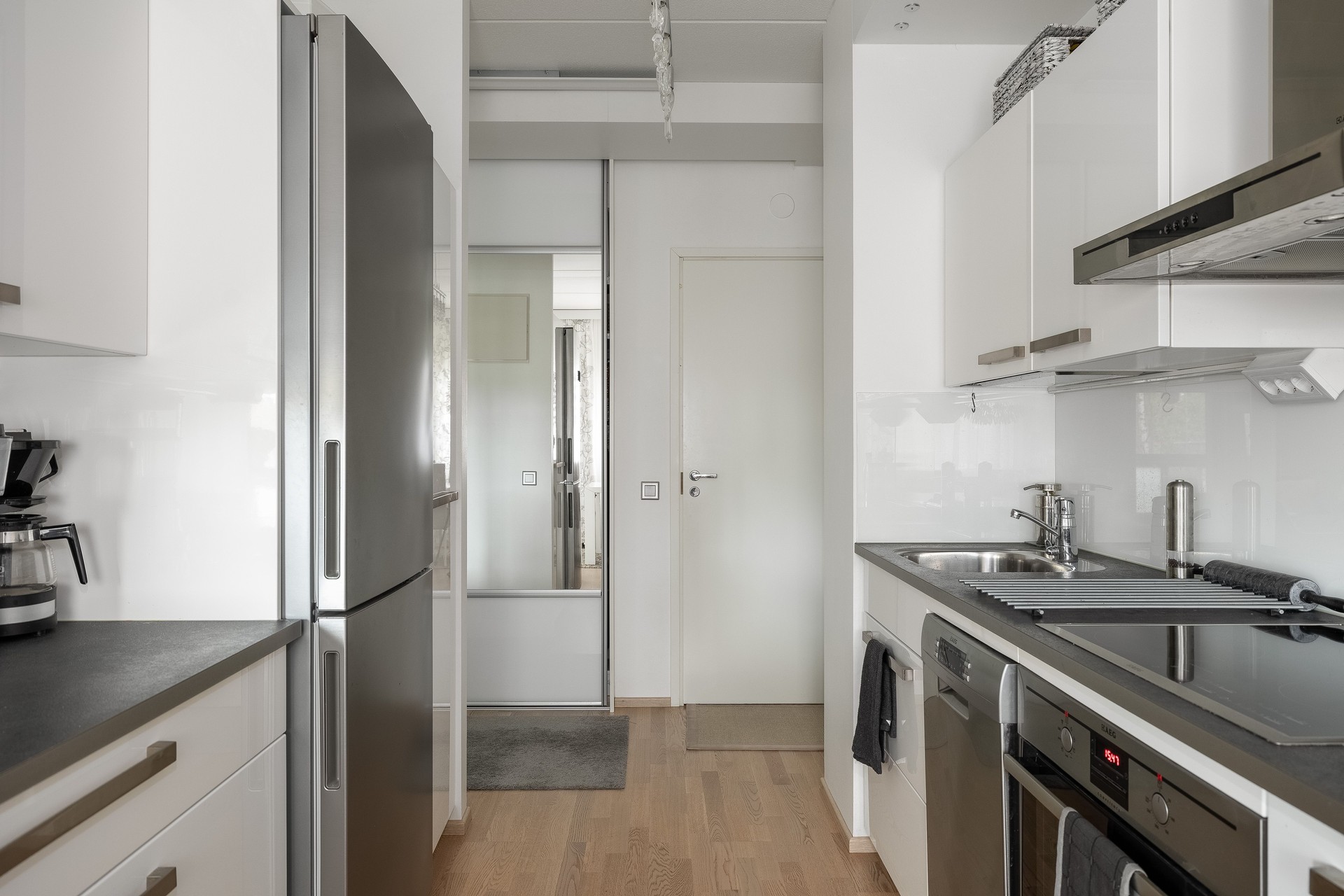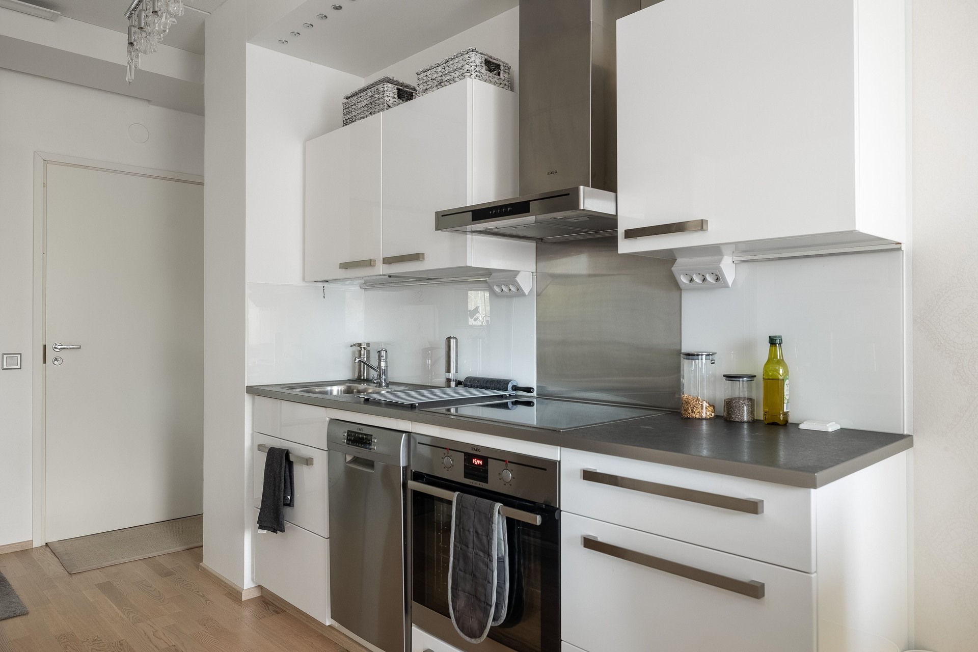 Keittiö on varusteltu modernisti, ja sieltä löytyy muun muassa induktioliesi ja astianpesukone. Olohuoneen ja makuuhuoneen parkettilattiat luovat asuntoon lämpimän tunnelman.