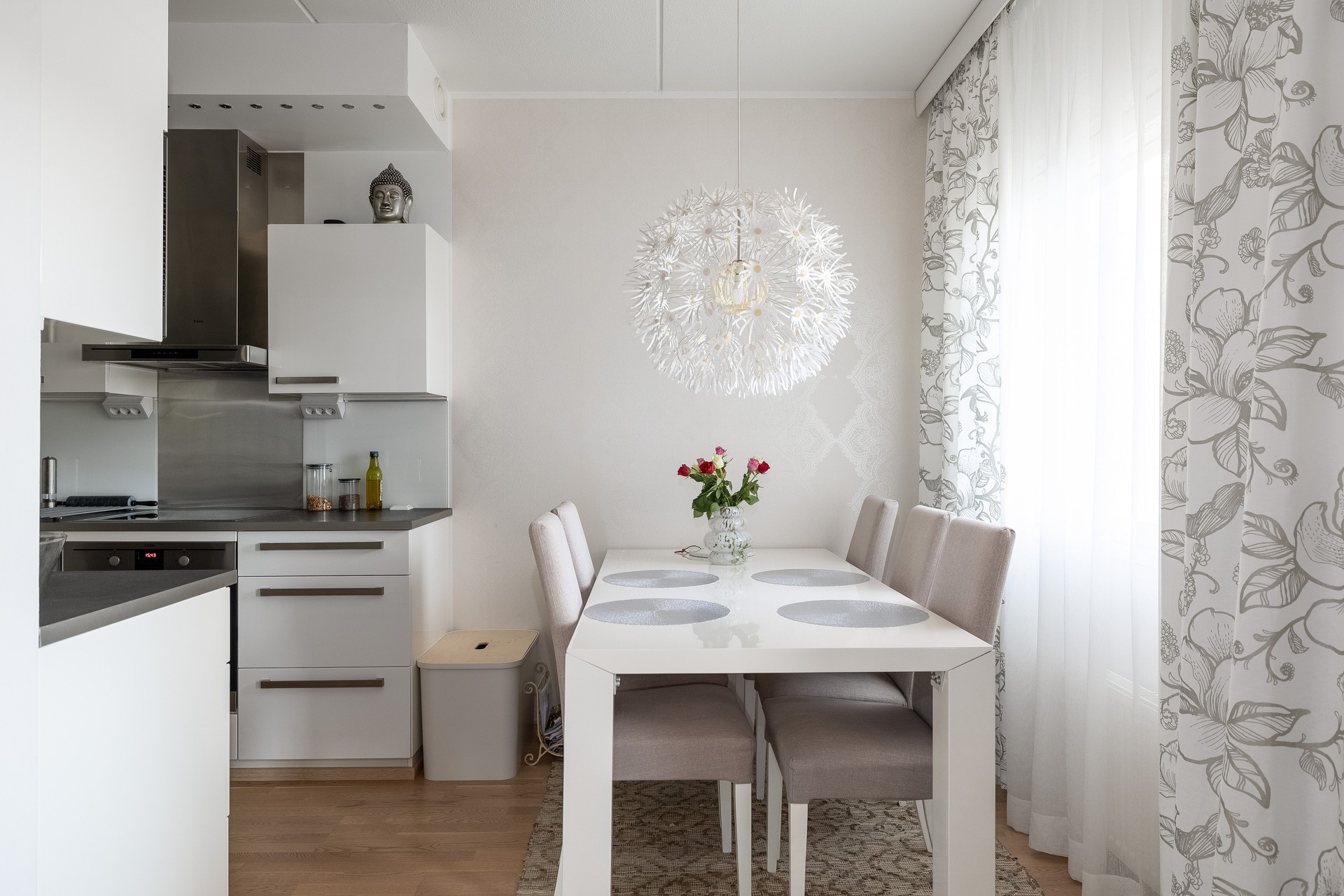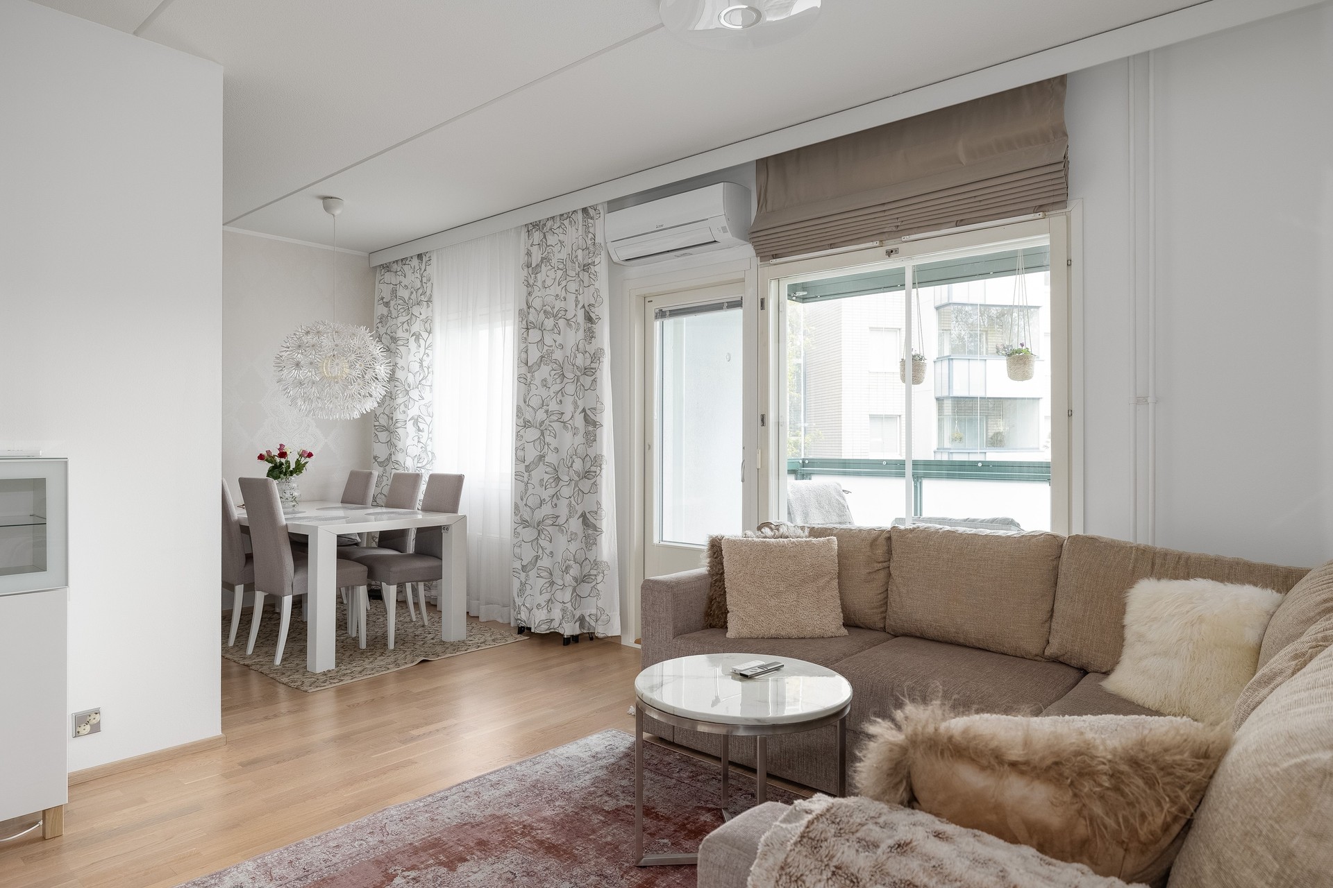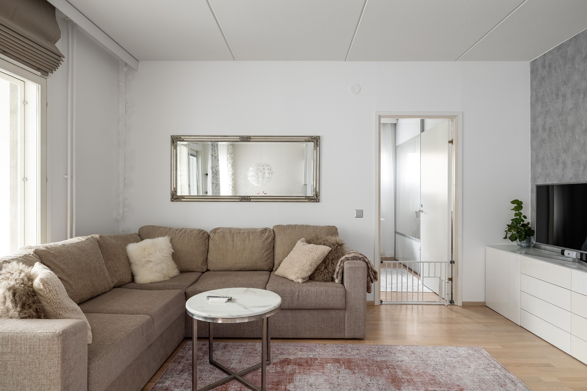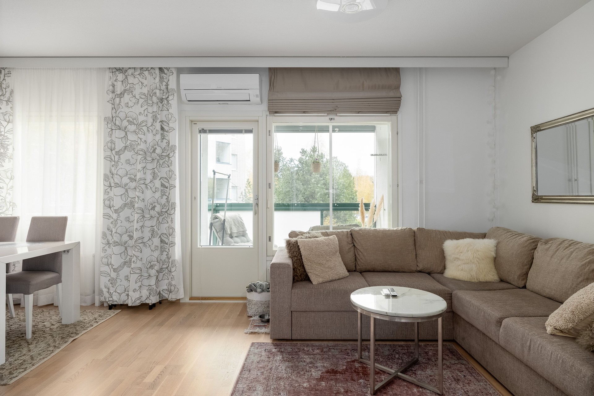 Keittiö on varusteltu modernisti, ja sieltä löytyy muun muassa induktioliesi ja astianpesukone. Olohuoneen ja makuuhuoneen parkettilattiat luovat asuntoon lämpimän tunnelman.