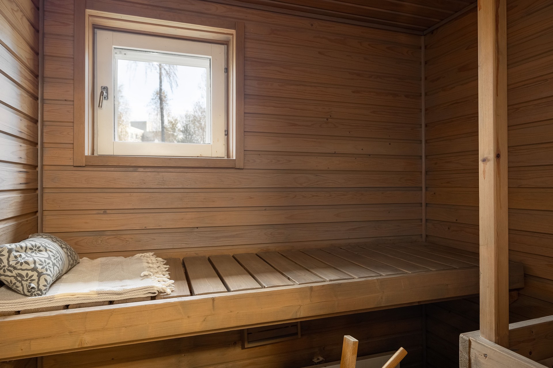 | Saunan kuvaus | Seinät (puu), lattiat (laatta), Sähkökiuas |
