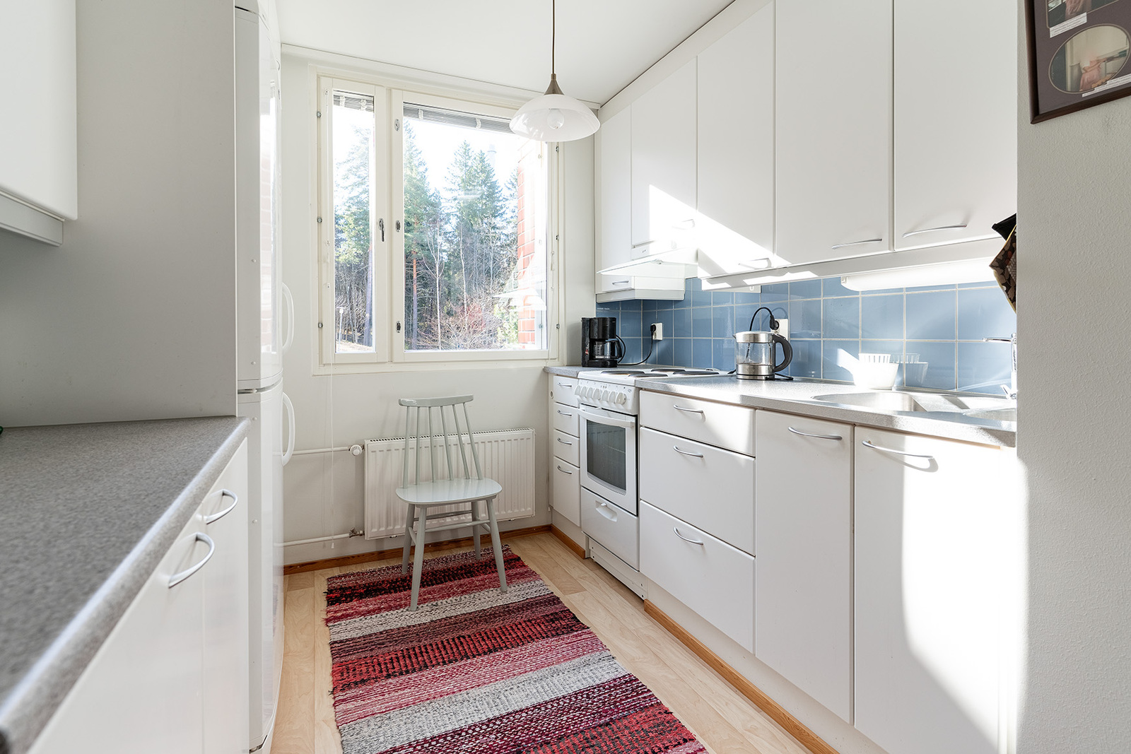 | Keittiön kuvaus | Liesi (sähköliesi), seinät (maali), lattiat (laminaatti), jääkaappipakastin, liesituuletin, liesi ja kiinteät valaisimet, varattu paikka astianpesukoneelle |