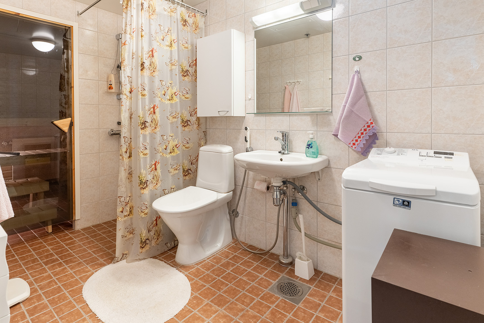 | Kylpyhuoneen kuvaus | WC-istuin, pesukoneliitäntä, peili, suihku ja kiinteät valaisimet, seinät (kaakeli), lattiat (laatta) |