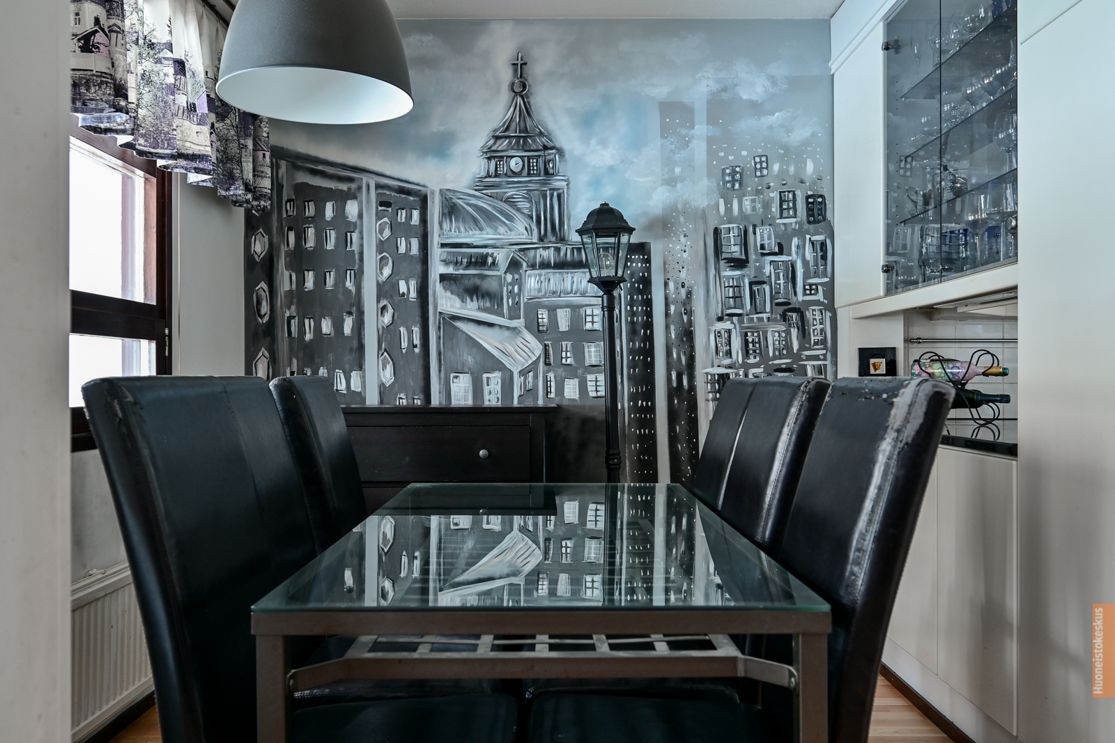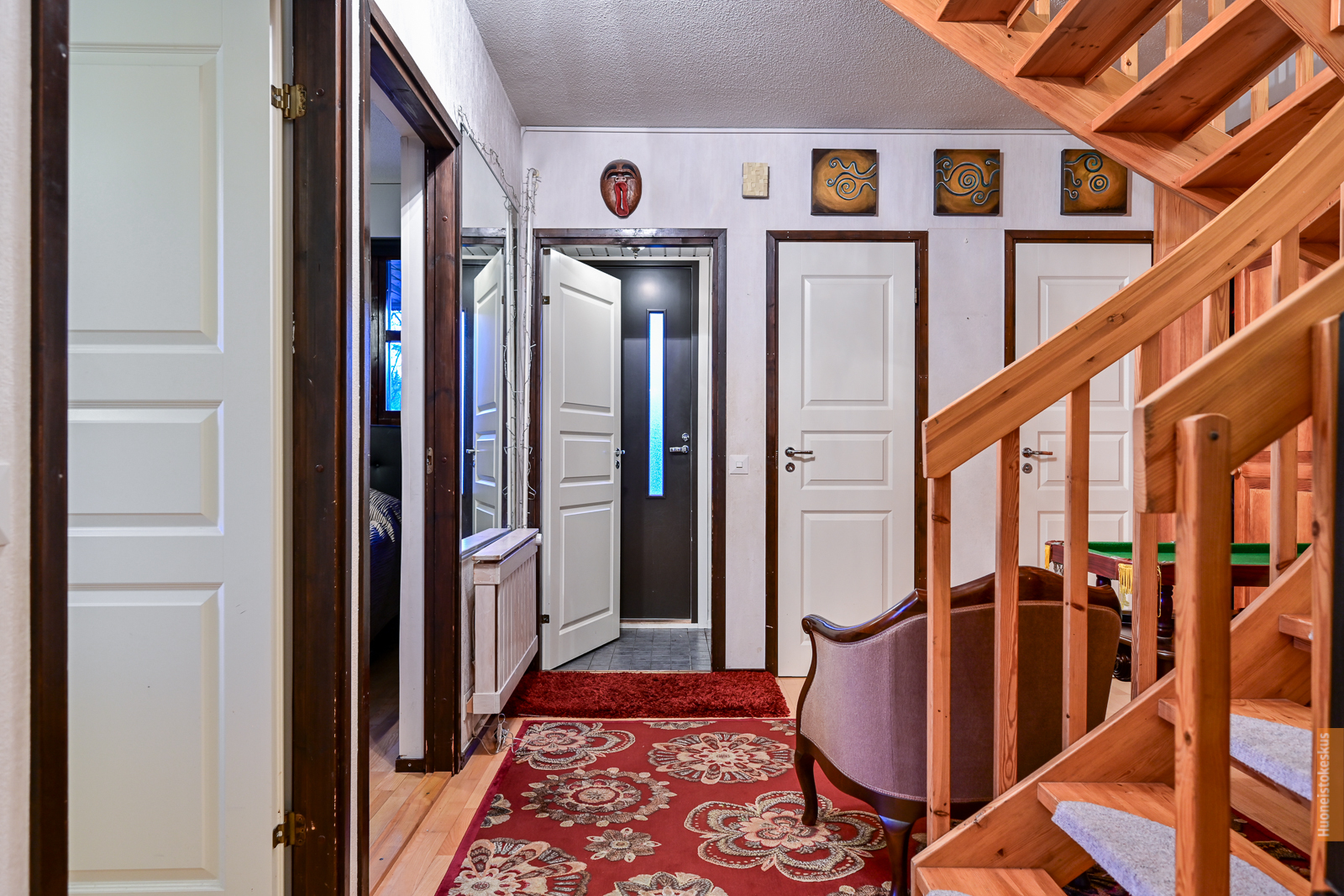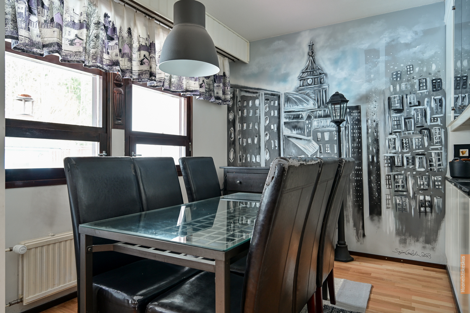 | Tilojen kuvaus | Ruokailutilassa maalattu taideseinä, samoin alakerran makuuhuoneessa maalattu taideseinä sekä pimennysverhot. Yhdessä yläkerran makuuhuoneessa taideseinä. Molemmissa kerroksissa vaatehuoneet. Yläkerrassa 2 kpl ja toinen todella iso, muovimattolattiat. Alakerran vaatehuoneessa laattalattia. |