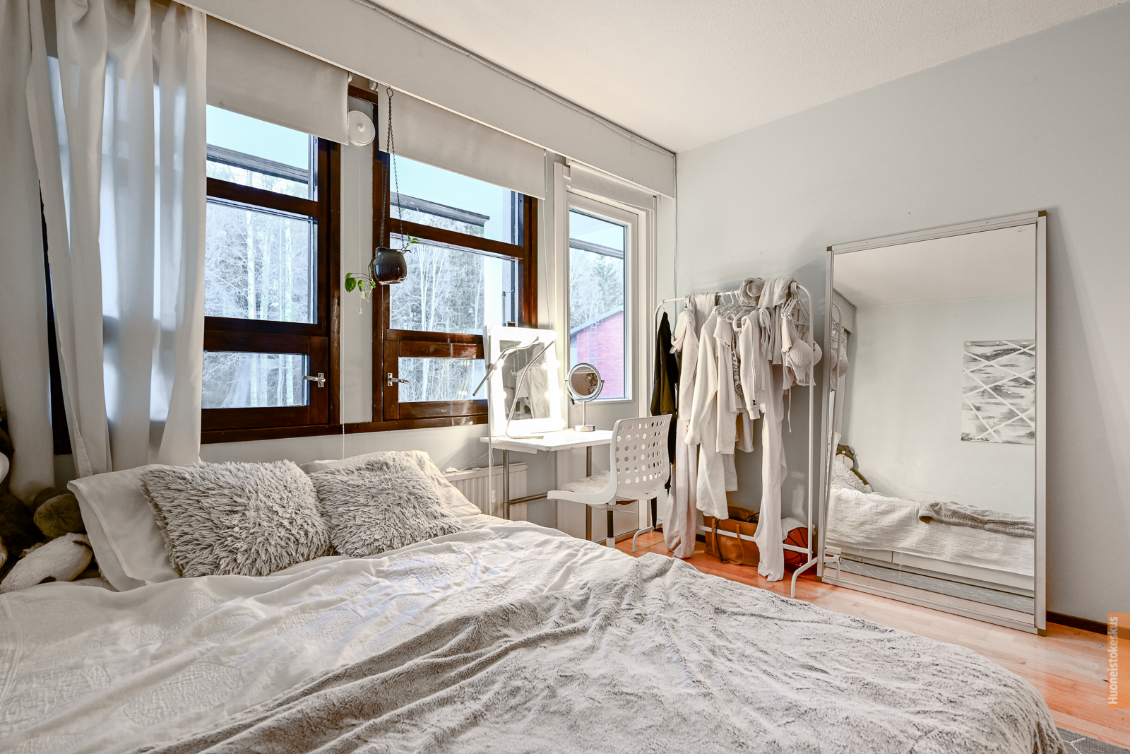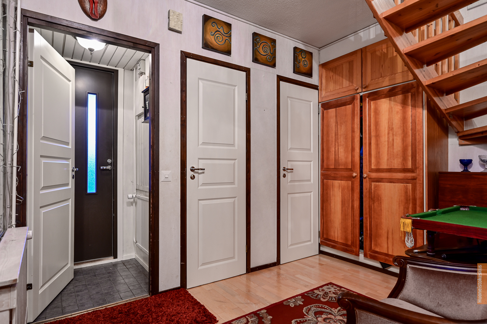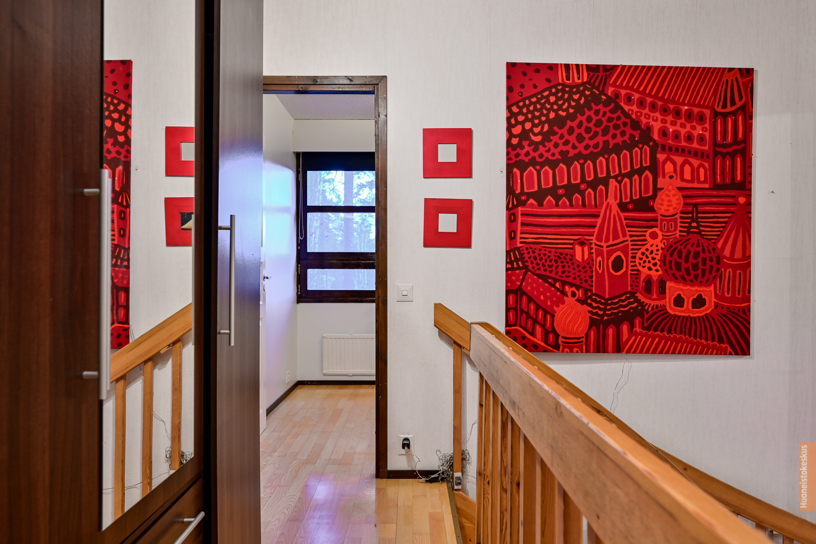 | Muut huoneet ja tilat | Ruokailutilassa maalattu taideseinä, samoin alakerran makuuhuoneessa maalattu taideseinä sekä pimennysverhot. Yhdessä yläkerran makuuhuoneessa taideseinä. Molemmissa kerroksissa vaatehuoneet. Yläkerrassa 2 kpl ja toinen todella iso, muovimattolattiat. Alakerran vaatehuoneessa laattalattia. |