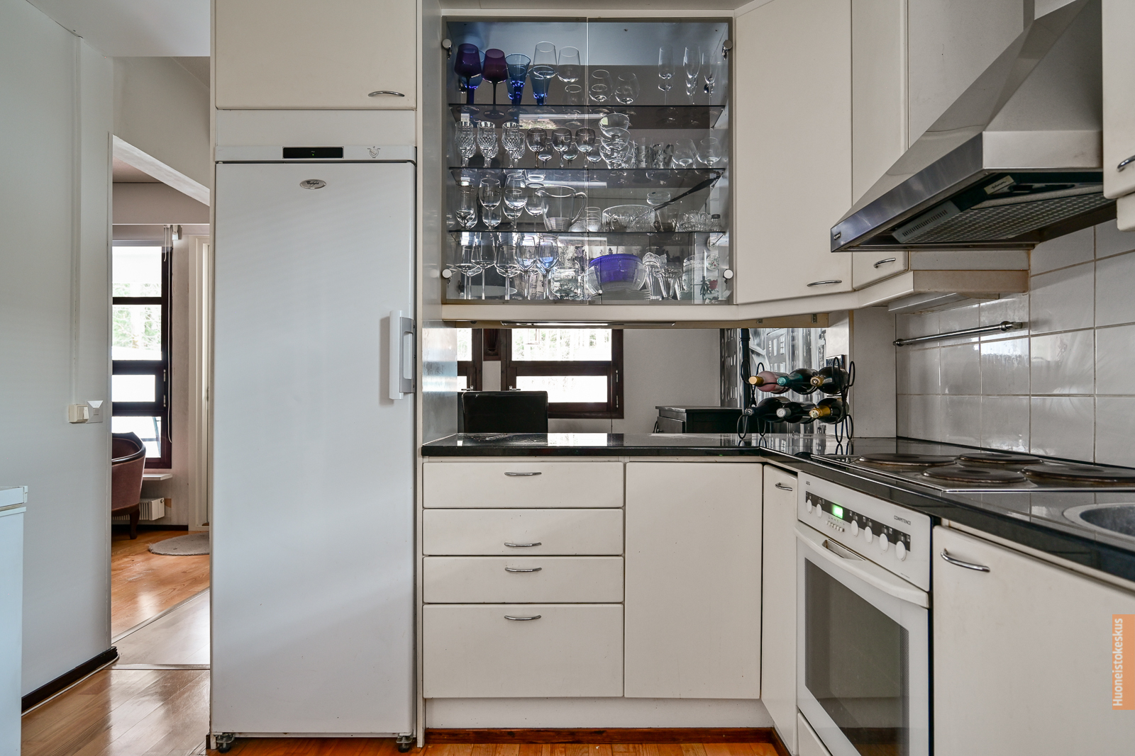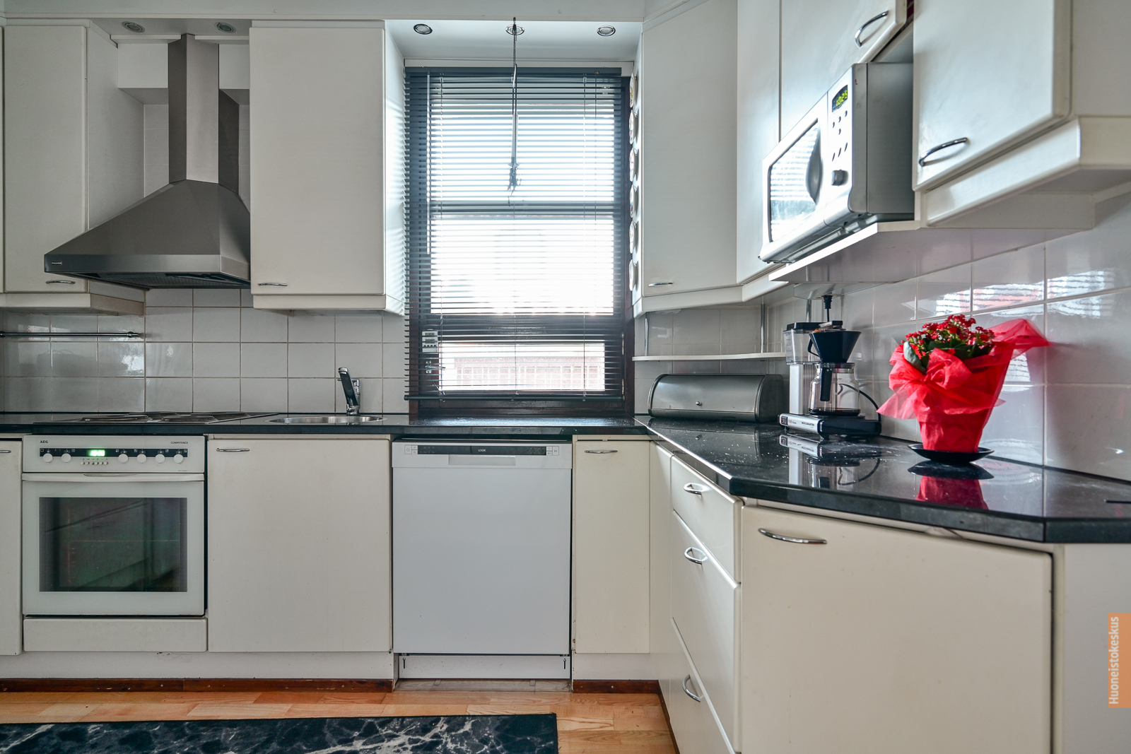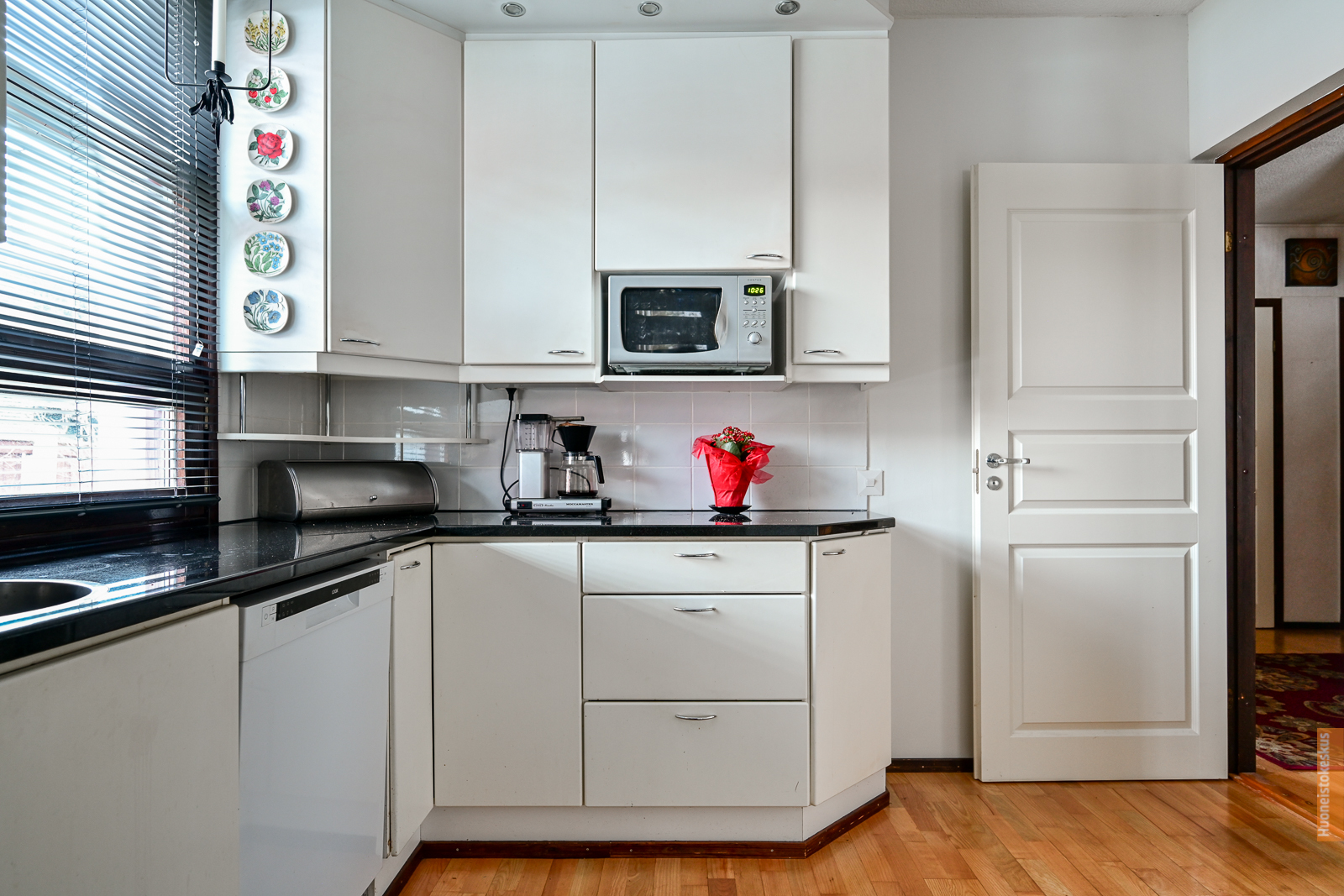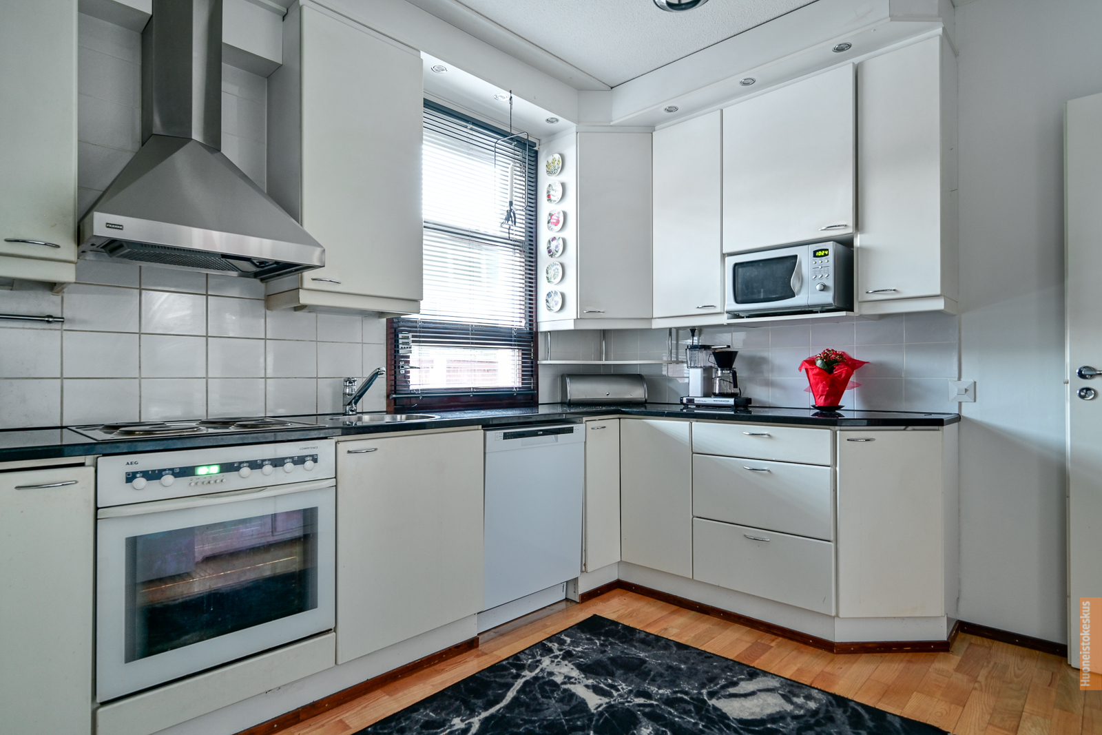 | Keittiön kuvaus | Liesi (liesitaso), työtasot (kivi), seinät (maali), lattiat (parketti), liesituuletin, jääkaappi, astianpesukone ja liesitaso |