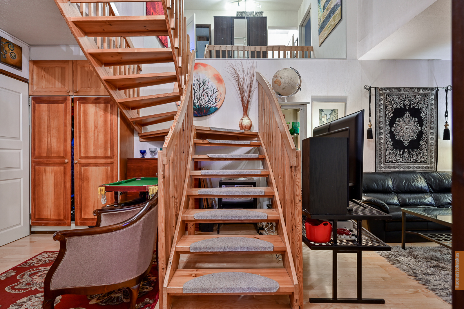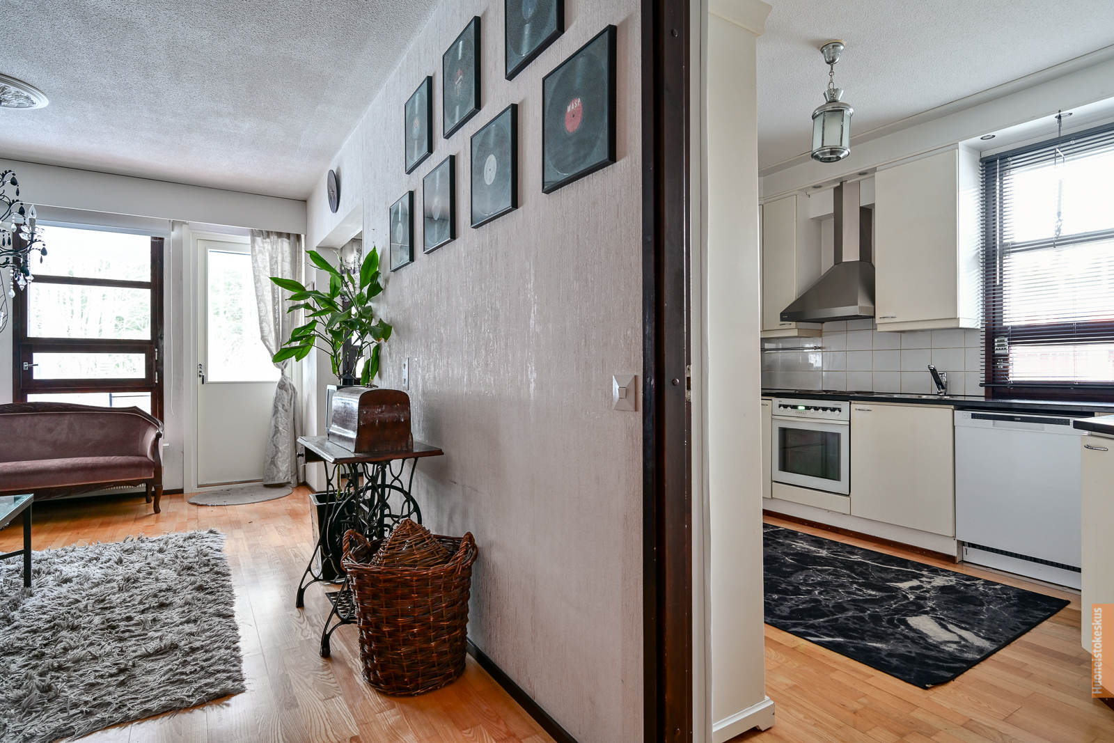 Alakerrassa on olohuone, keittiö ja ruokailutila sekä yksi makuuhuone, vaatehuone ja erillinen wc.