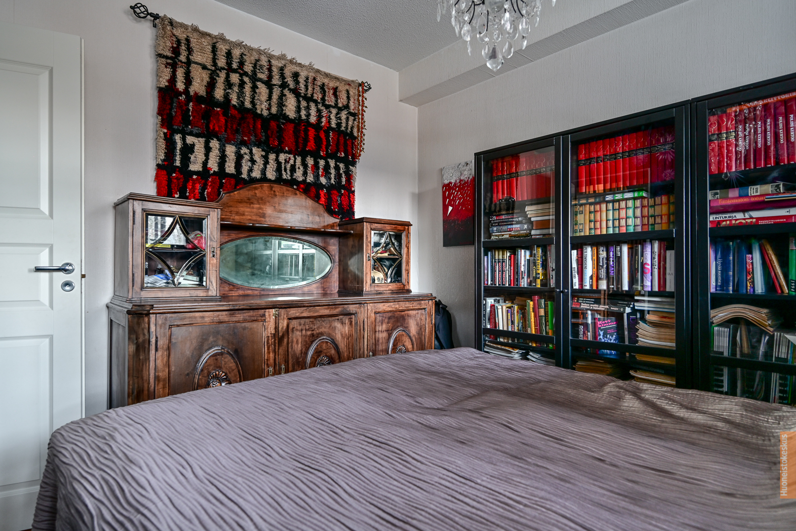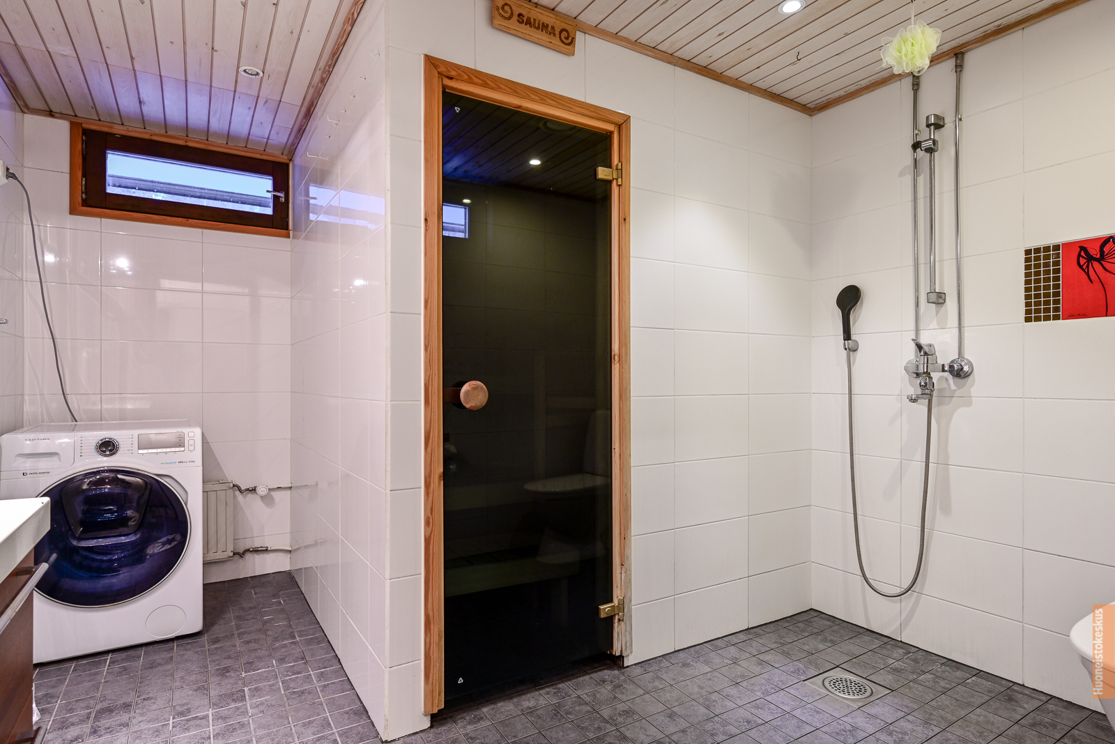 Leveät portaat vievät yläkertaan, jossa kolme makuuhuonetta sekä kylpyhuone ja sauna. Kylpyhuoneessa on kodinhoitotila. Kaksi vaatehuonetta eli säilytystilaa löytyy tosi hyvin. Iso parveke toimii lisähuoneena kesäisin.