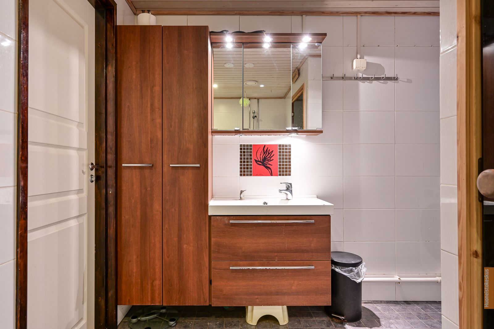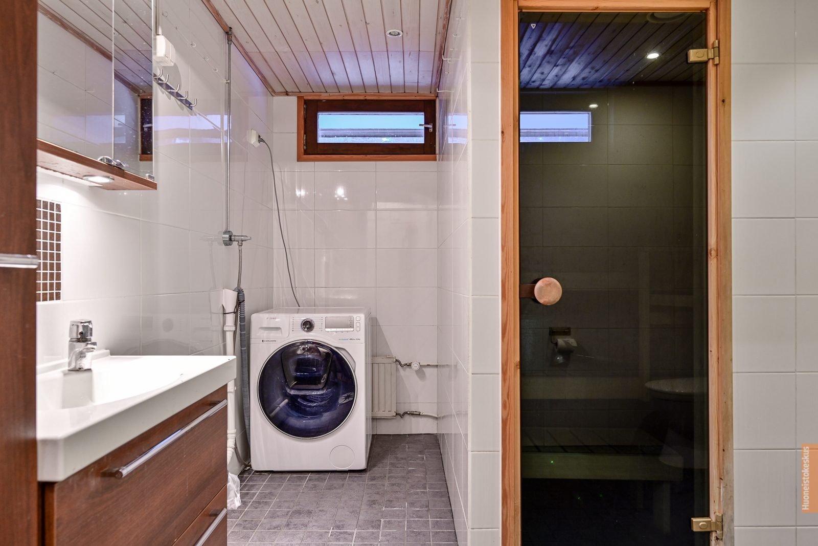 | Kylpyhuoneen kuvaus | WC-istuin, lattialämmitys, allaskaappi, pesukoneliitäntä ja suihku, seinät (kaakeli), lattiat (laatta) |