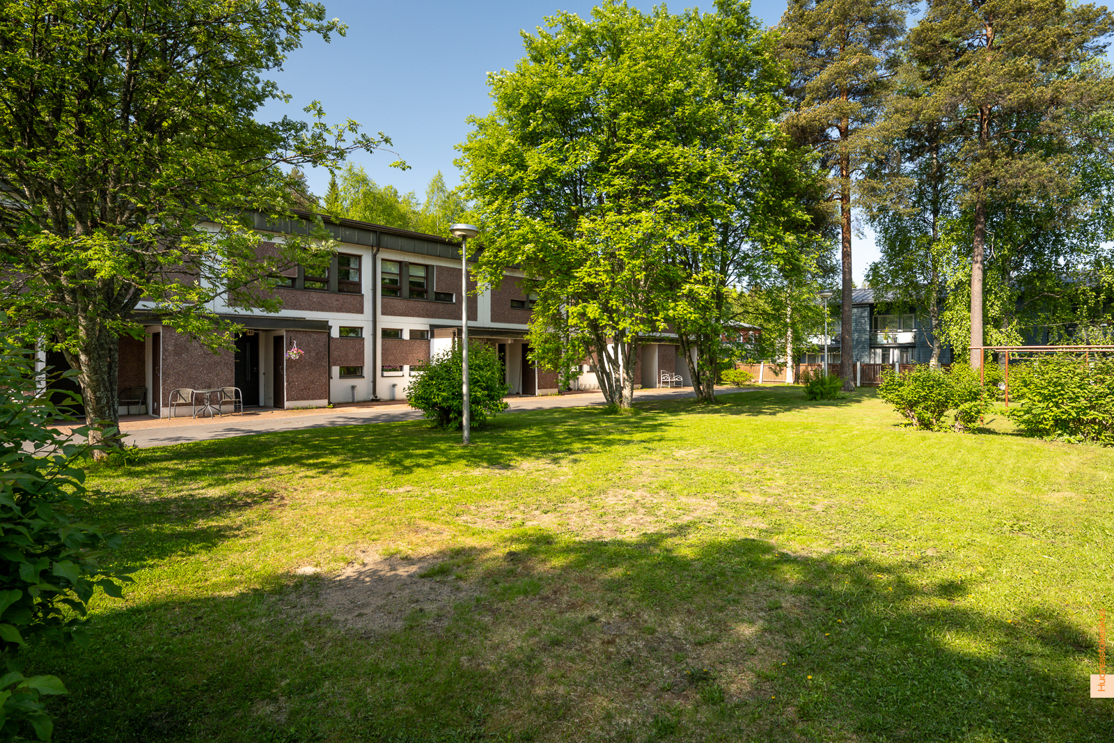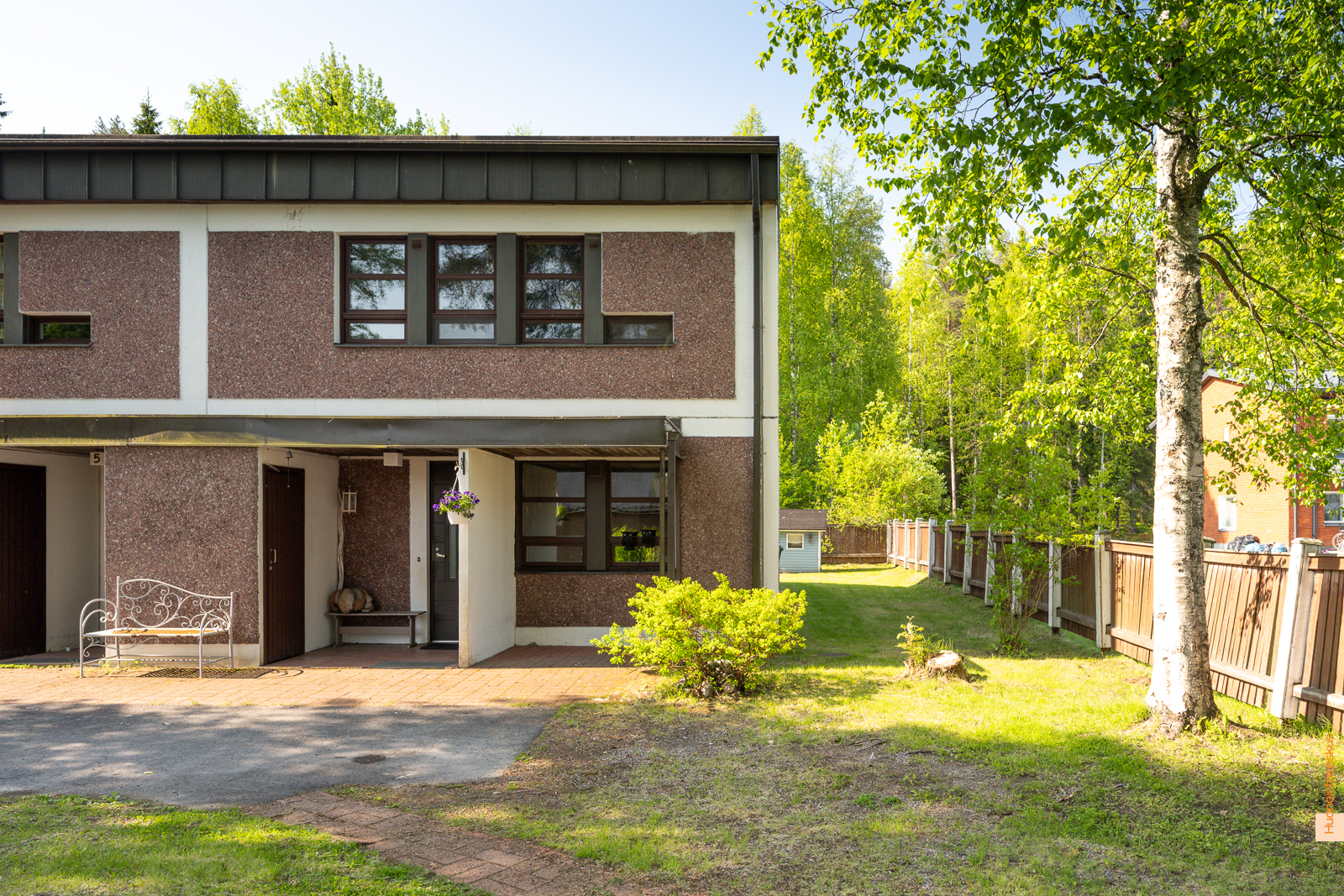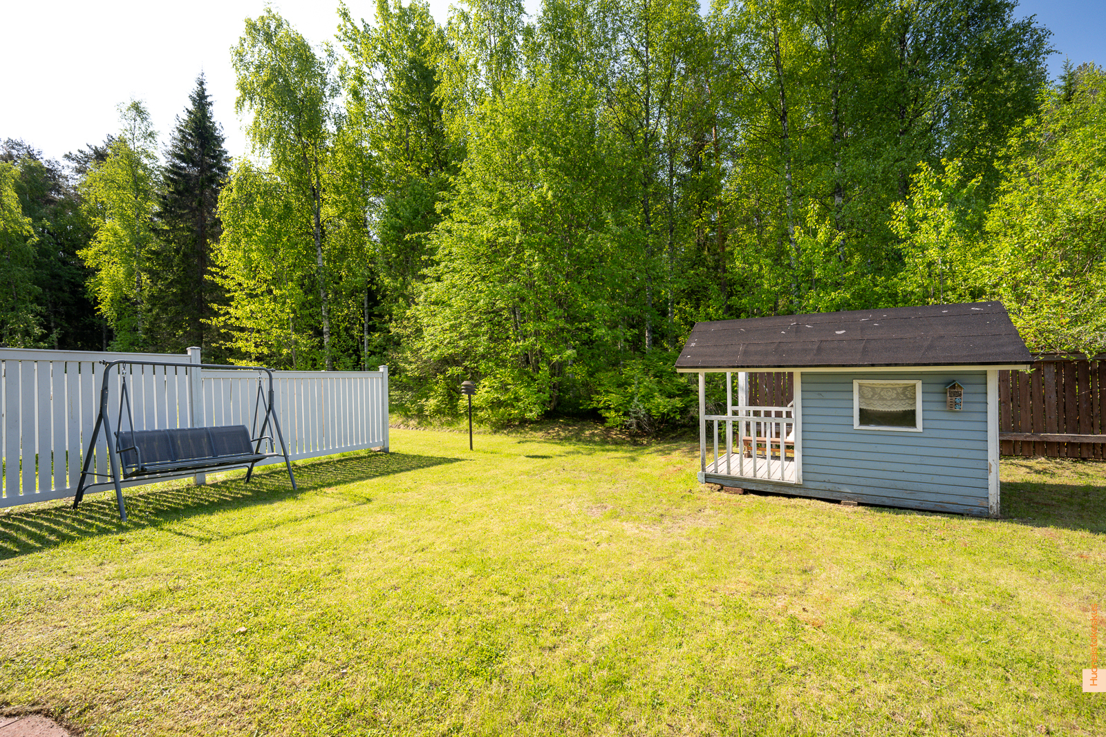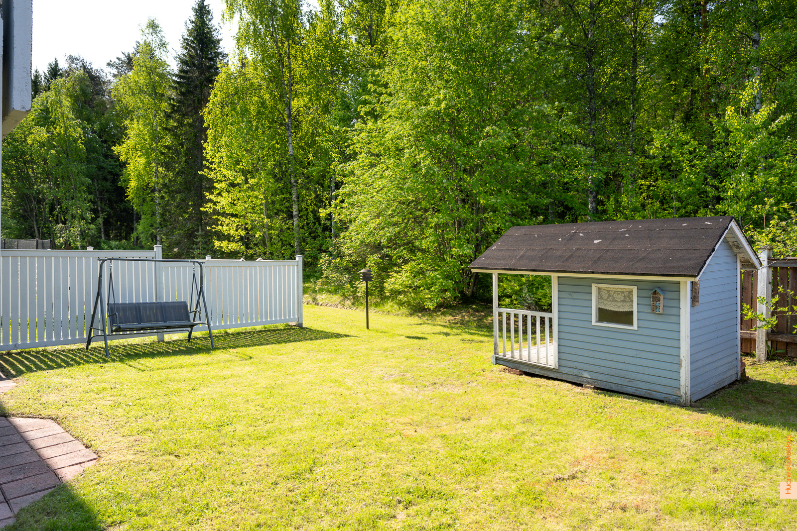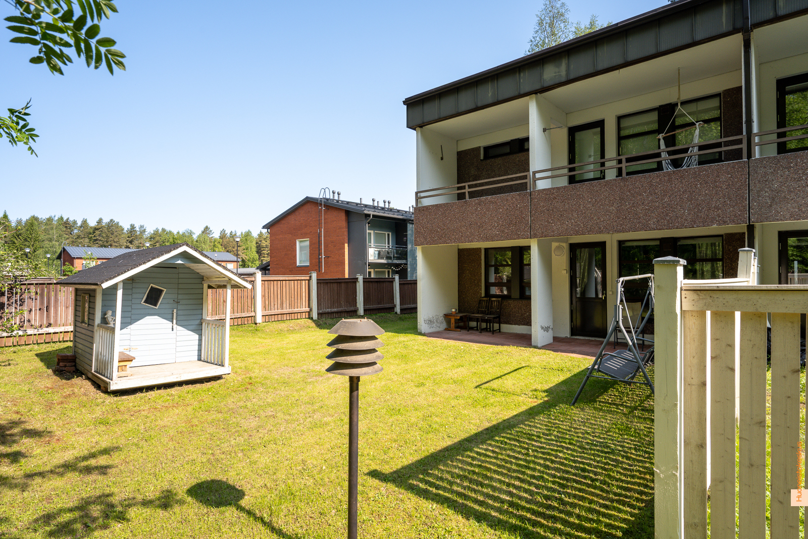 Päätyhuoneisto ja mahtava takapiha leikkimökkeineen metsään päin.