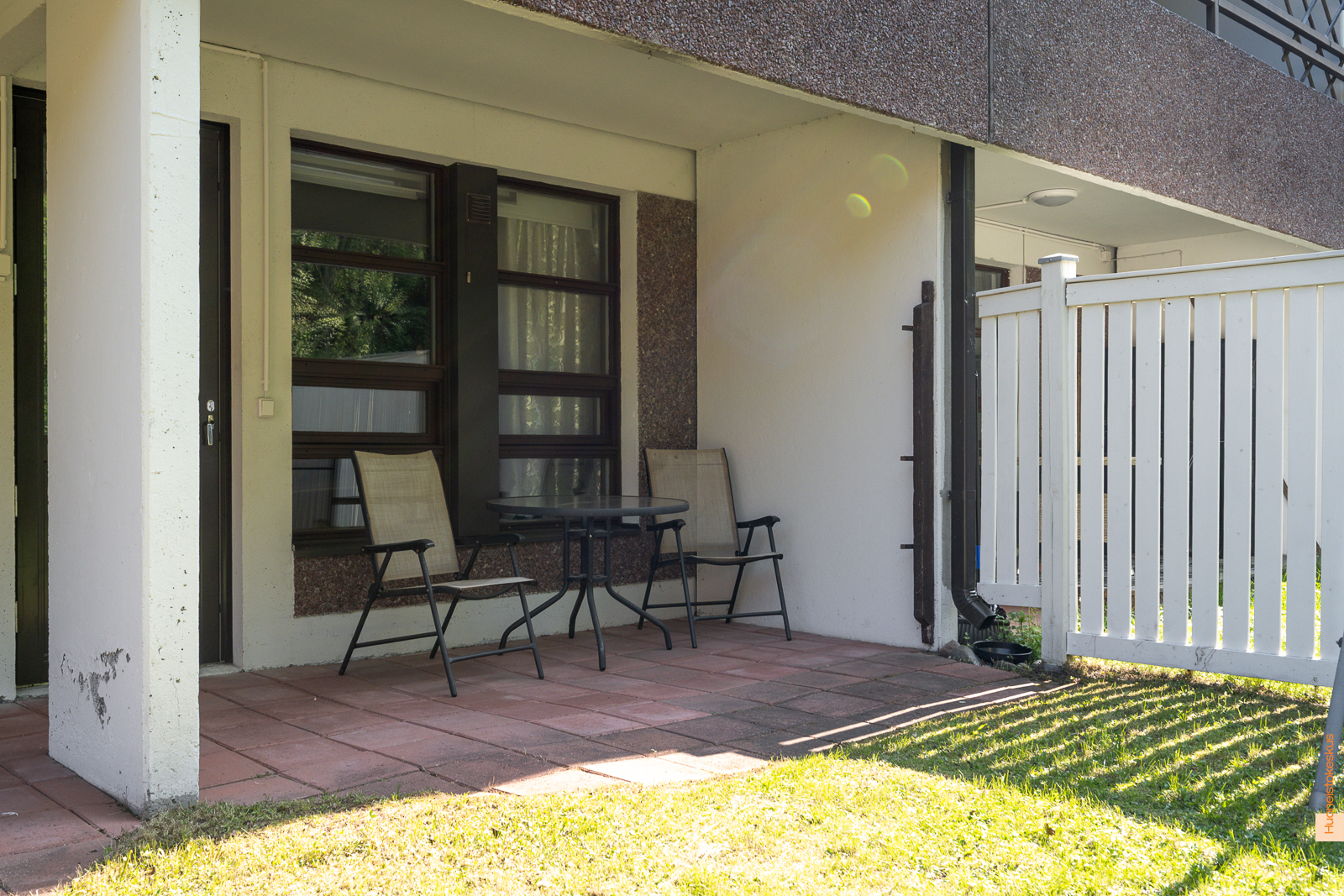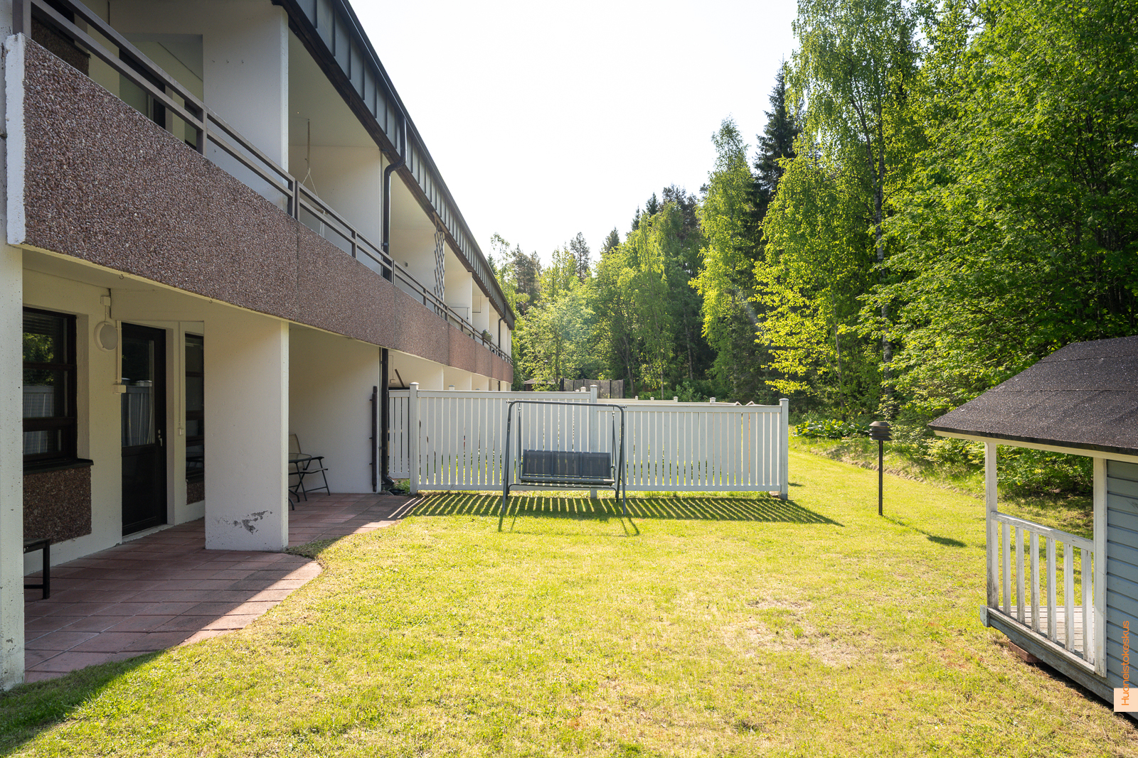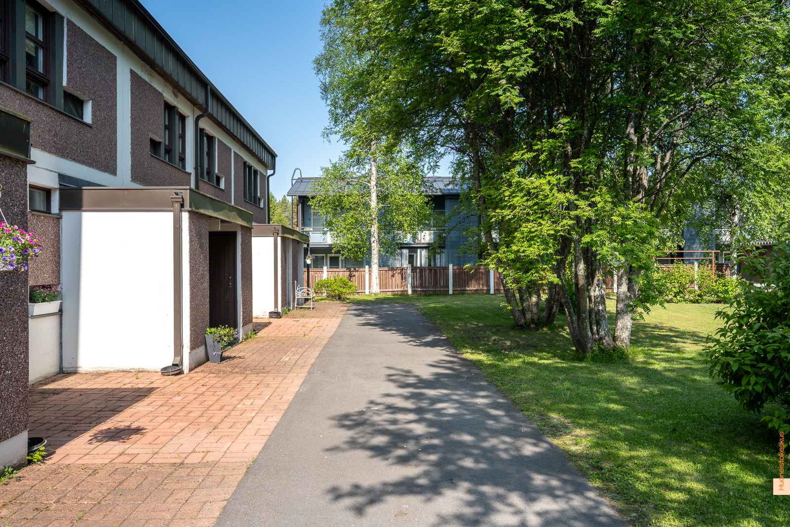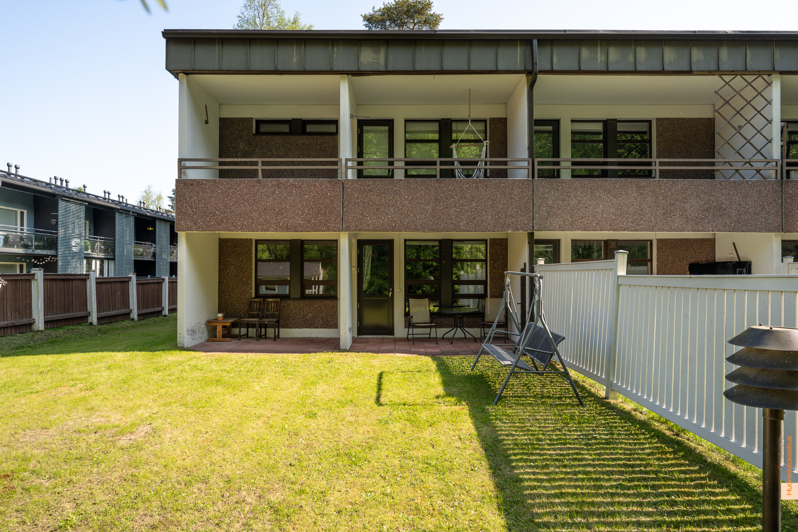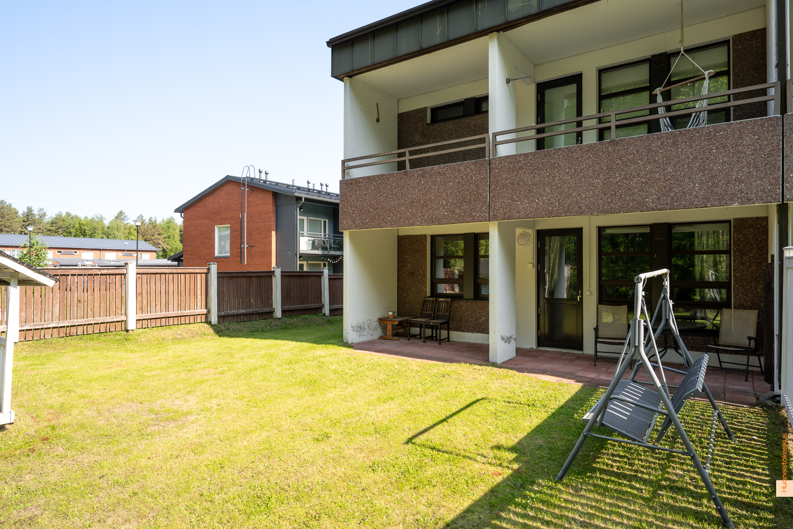 Päätyhuoneisto ja mahtava takapiha leikkimökkeineen metsään päin.