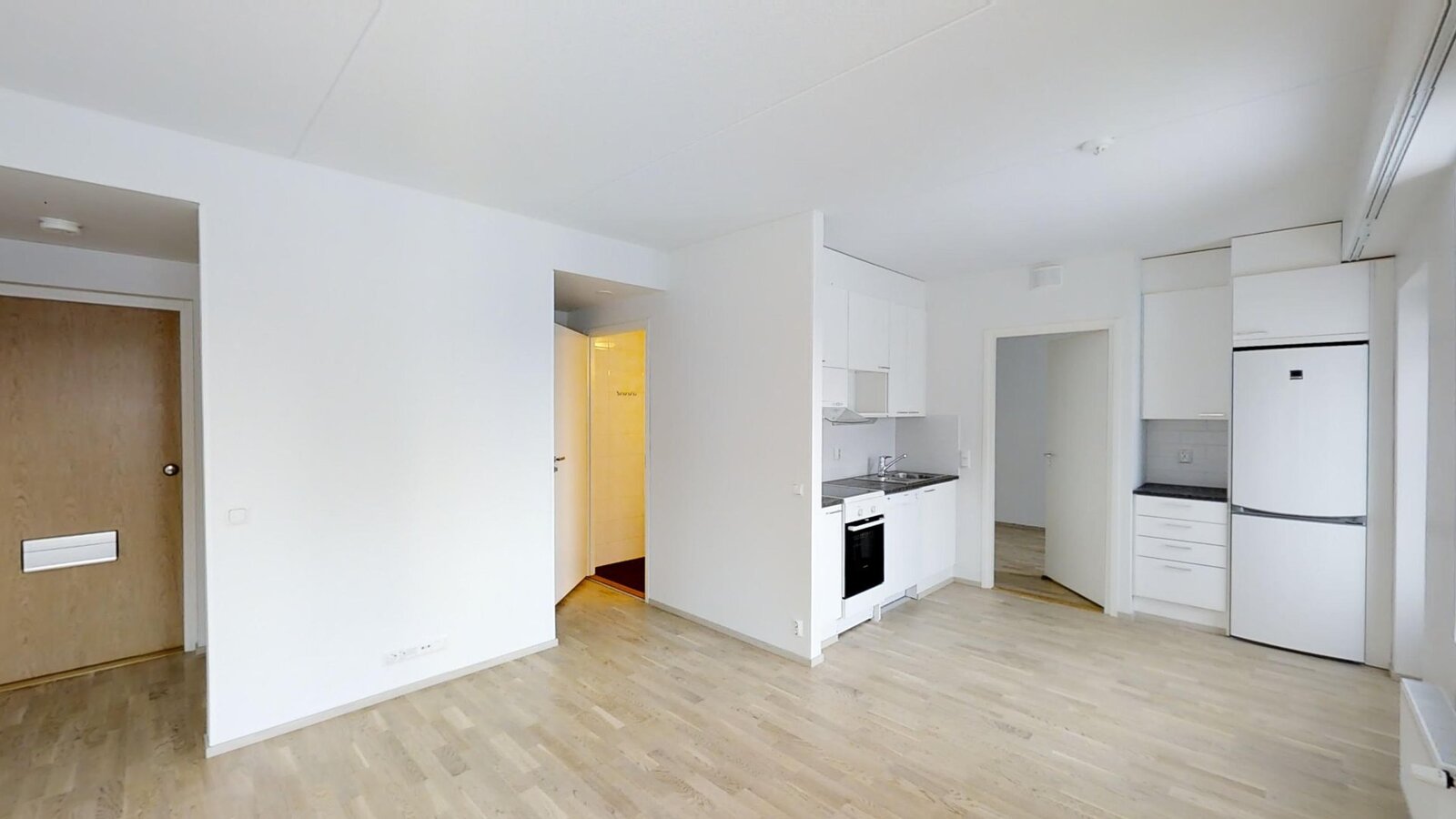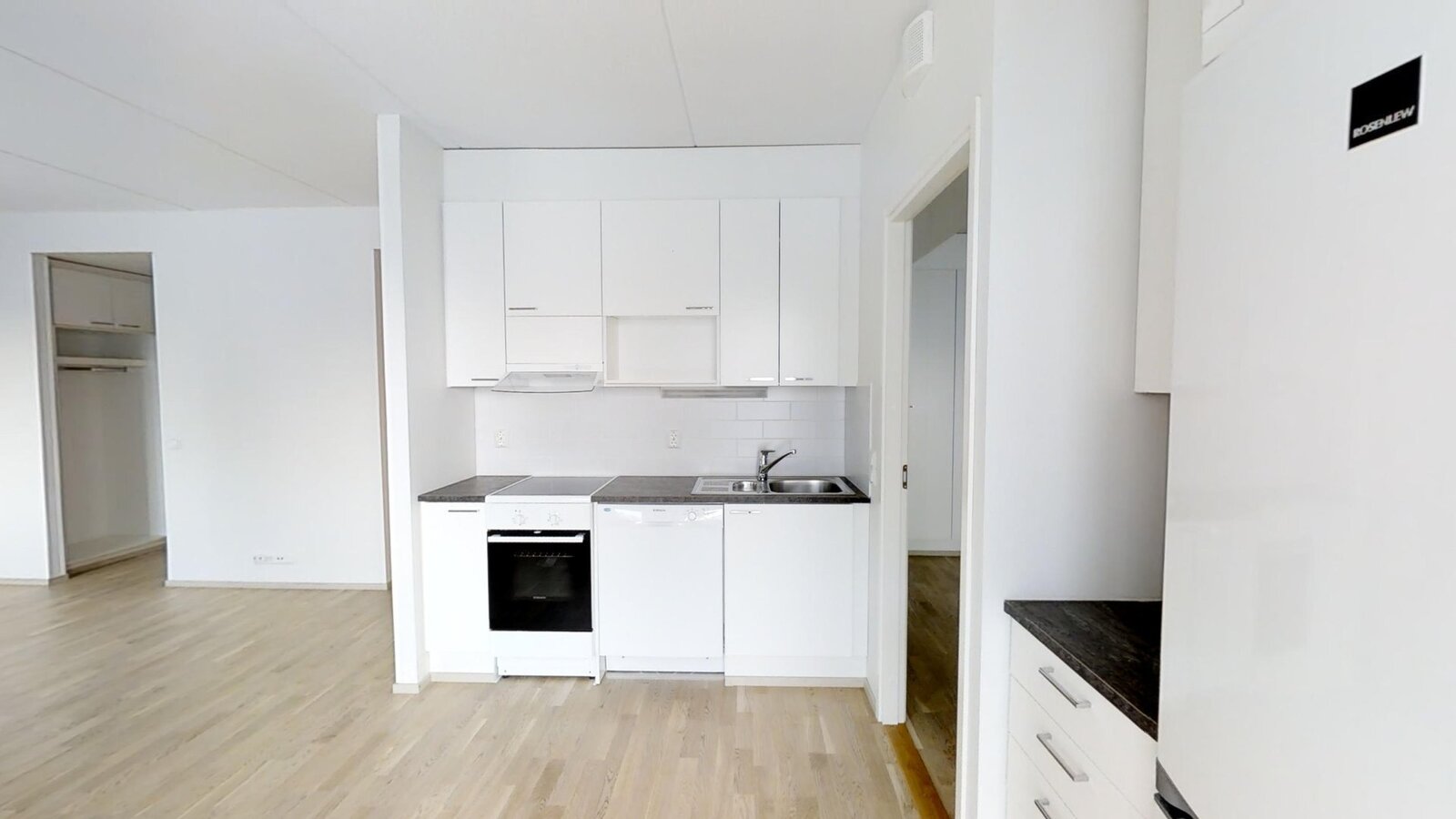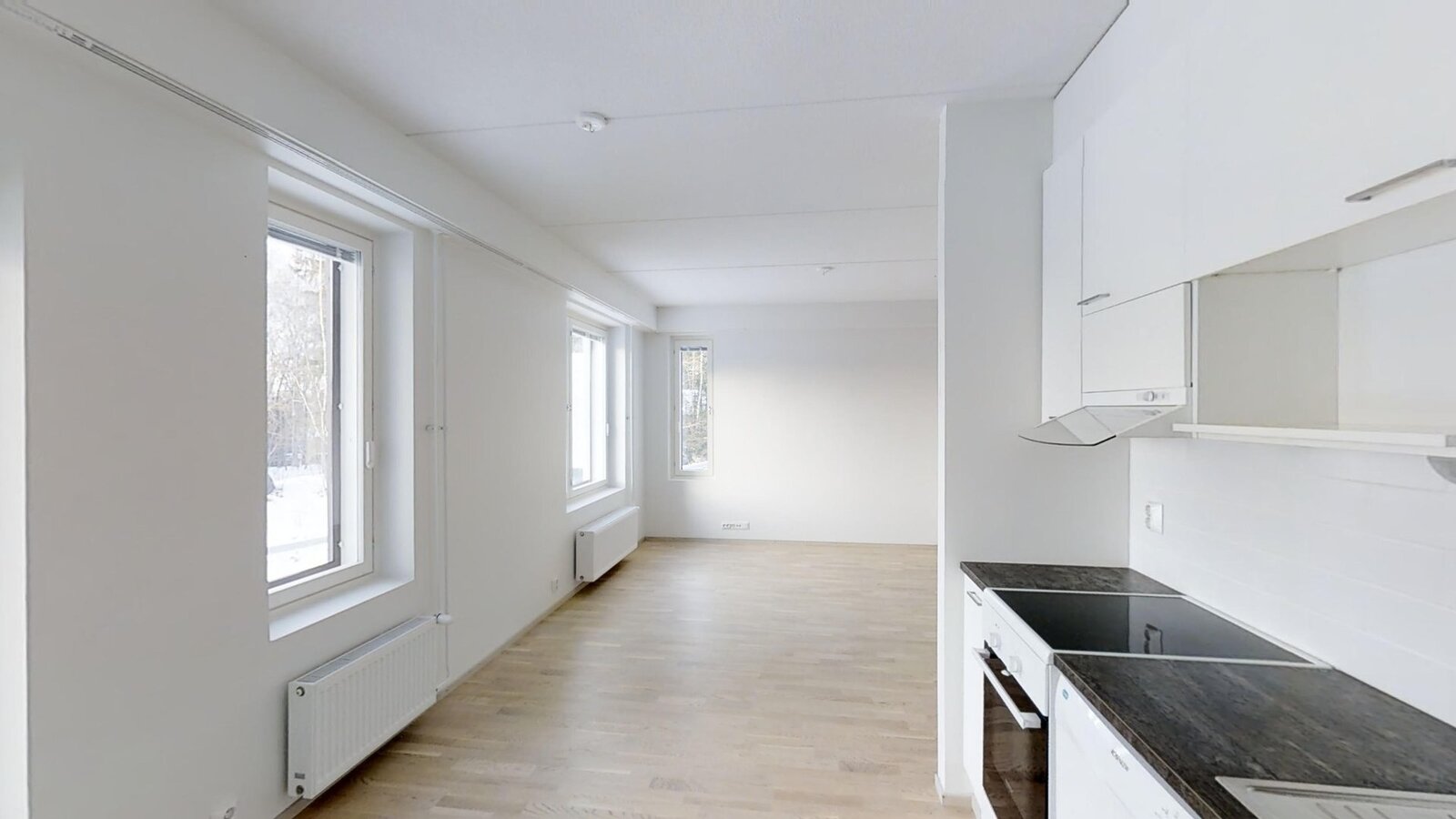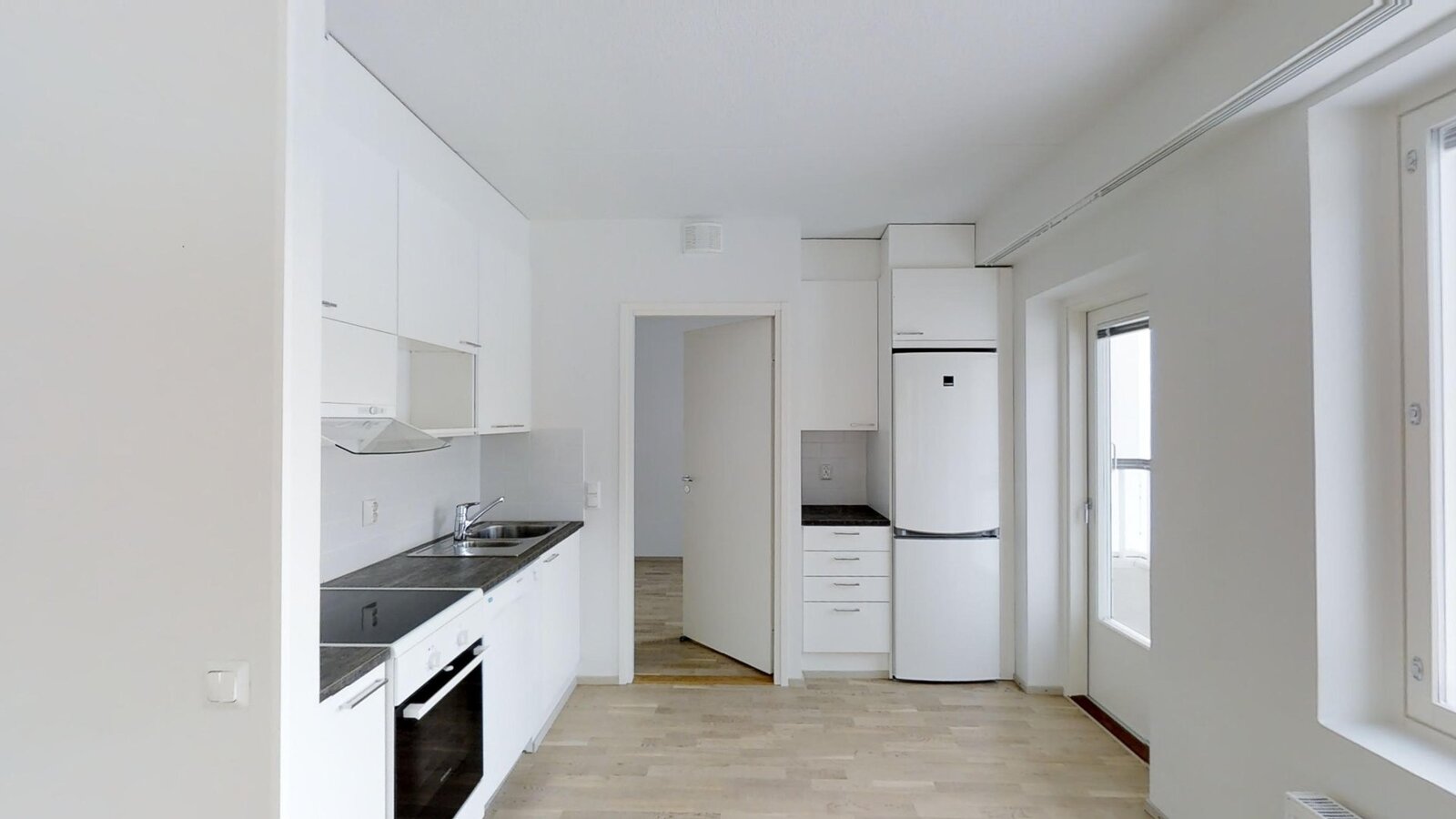 Liesi (Induktioliesi), työtasot (laminaatti), seinät (maali ja osalaatoitus), lattiat (parketti), liesi, jääkaappipakastin, astianpesukone ja kiinteät valaisimet, liesituuletin / hormi |