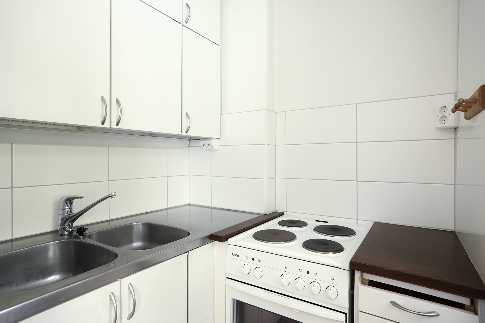 Liesi (sähköliesi), seinät (laatta ja maali), lattiat (muovimatto), liesi, jenkkikaappi ja kiinteät valaisimet, Kaapistot alkuperäiset. Kodinkoneet eivät ole uusia eikä niiden toimivuudesta ole tietoa. |