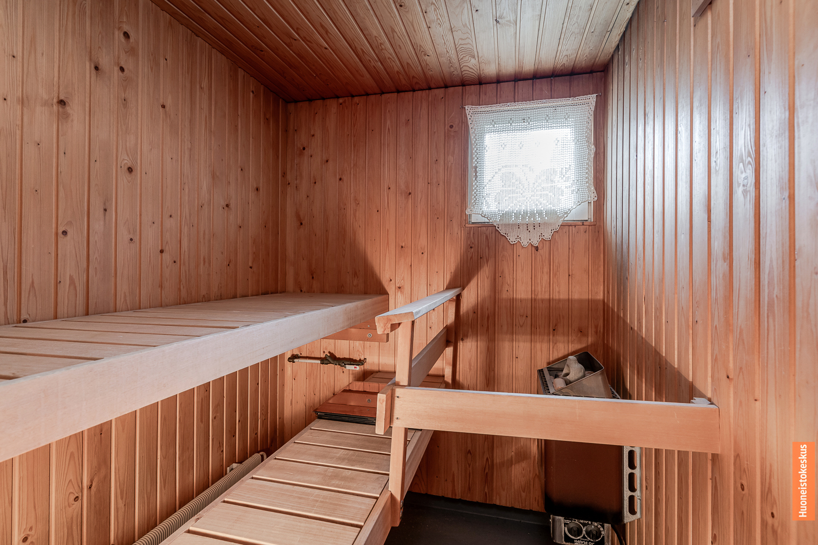 | Saunan kuvaus | Seinät (puu), lattiat (muovimatto), Sähkökiuas |