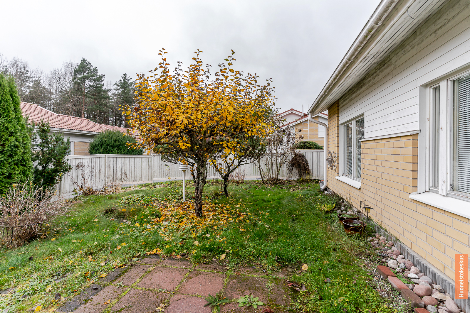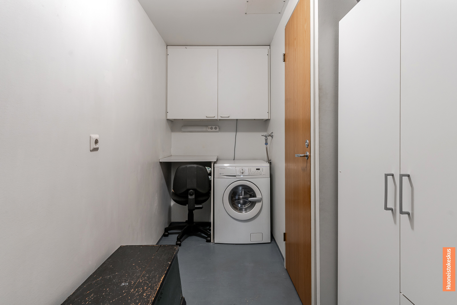 | Kodinhoitohuoneen kuvaus | Pyykkikaapit, pesukoneliitäntä ja pöytätaso, lattiat (muovimatto), seinät (maali) |
