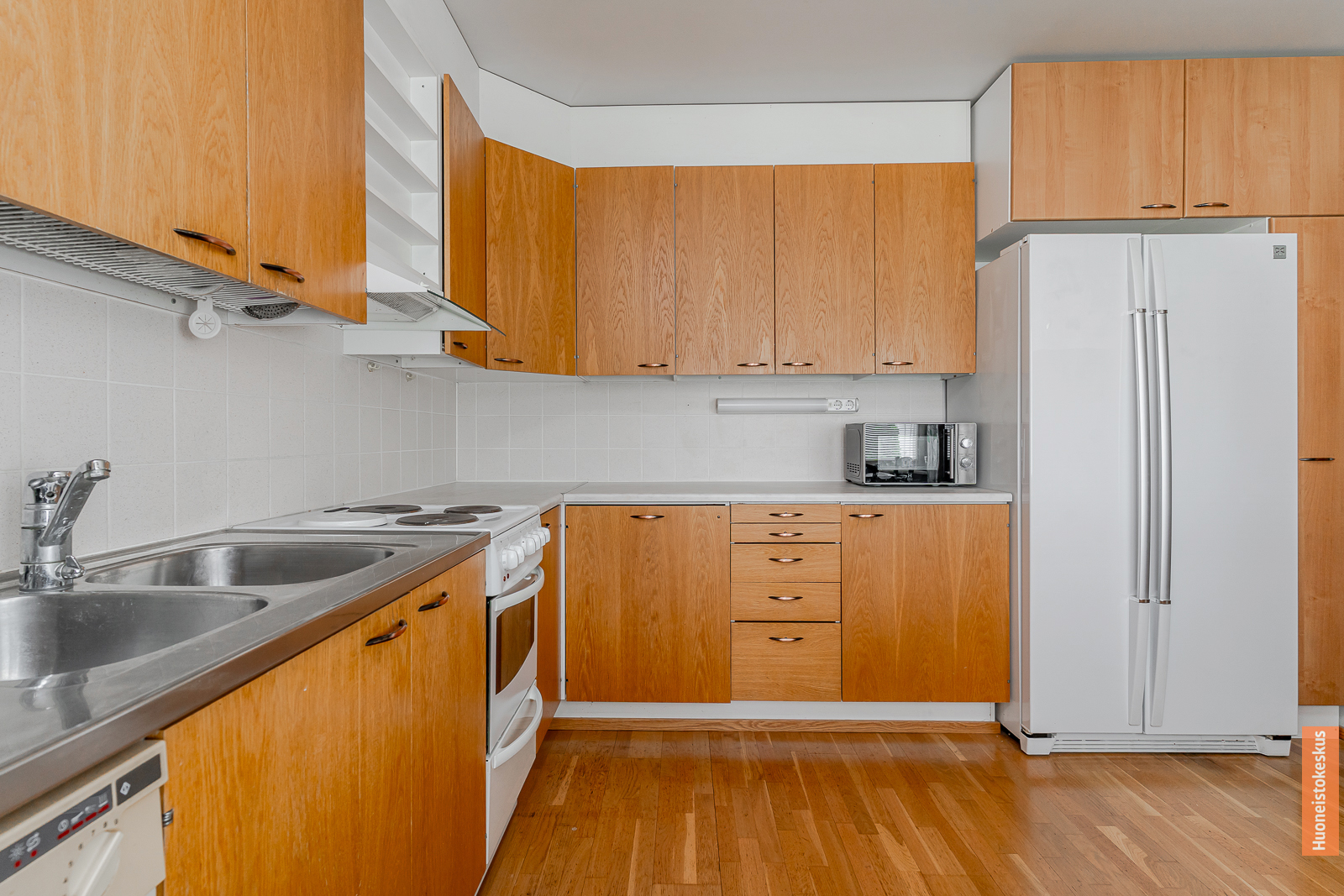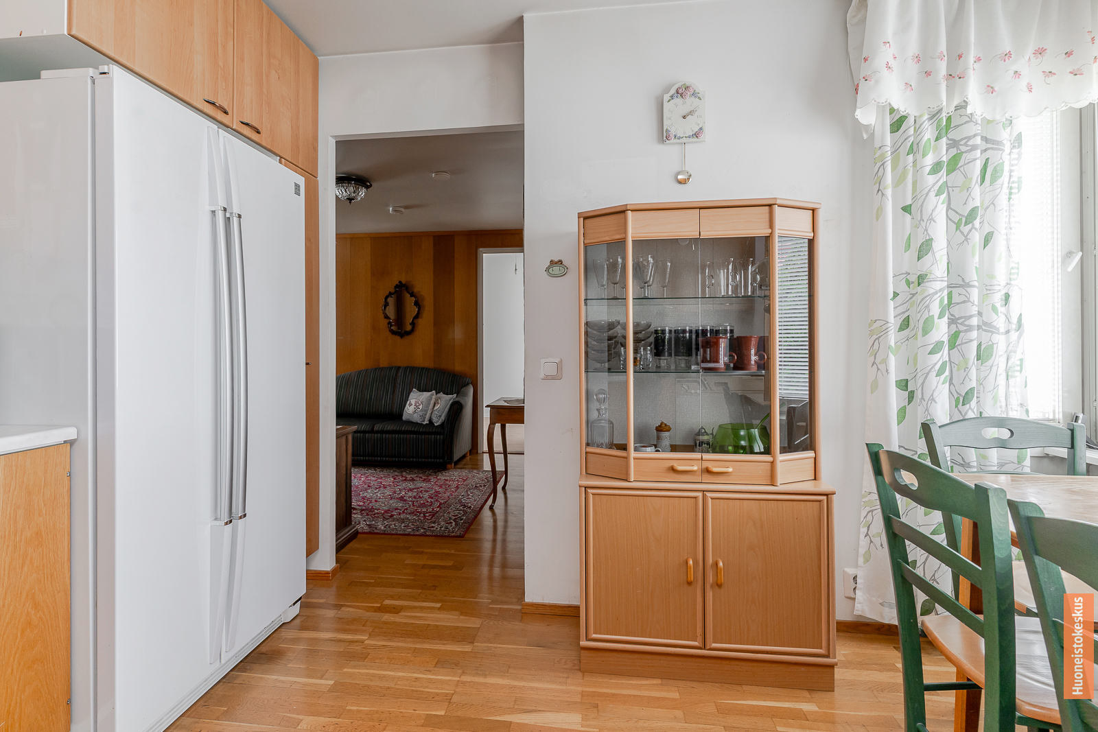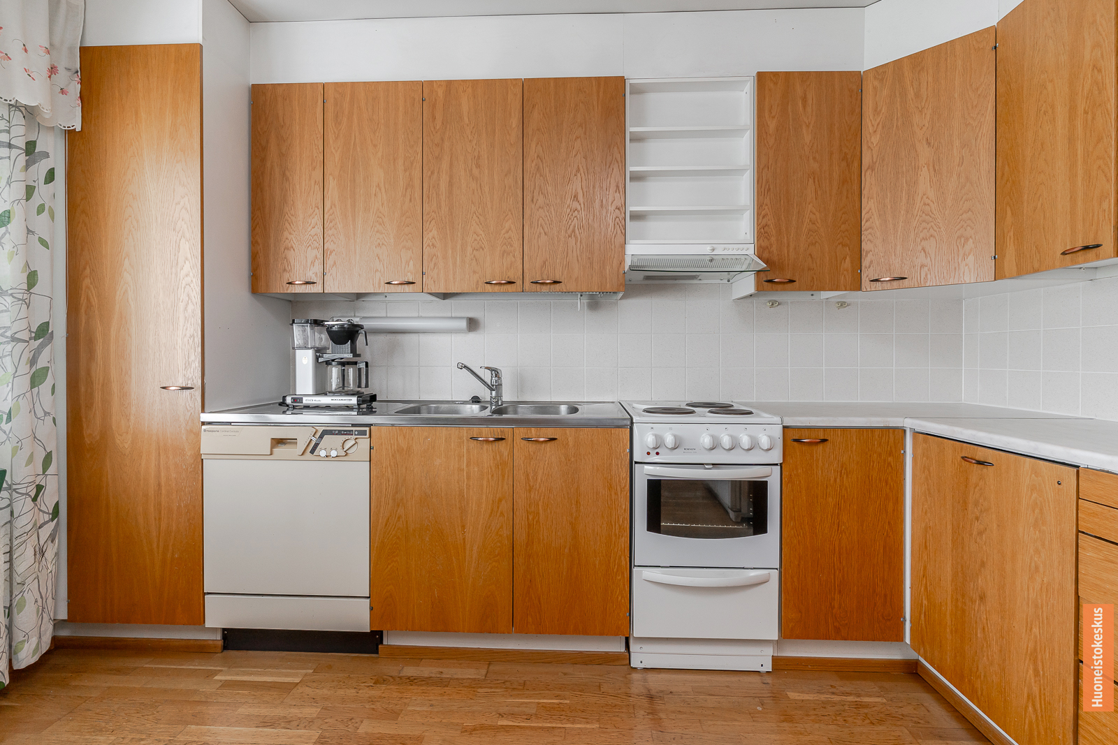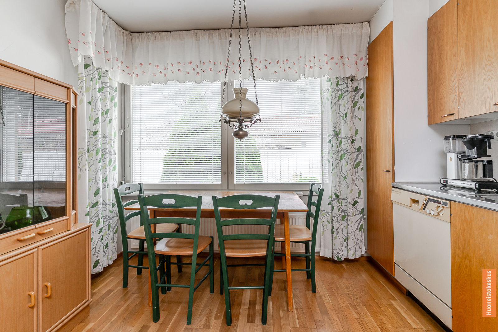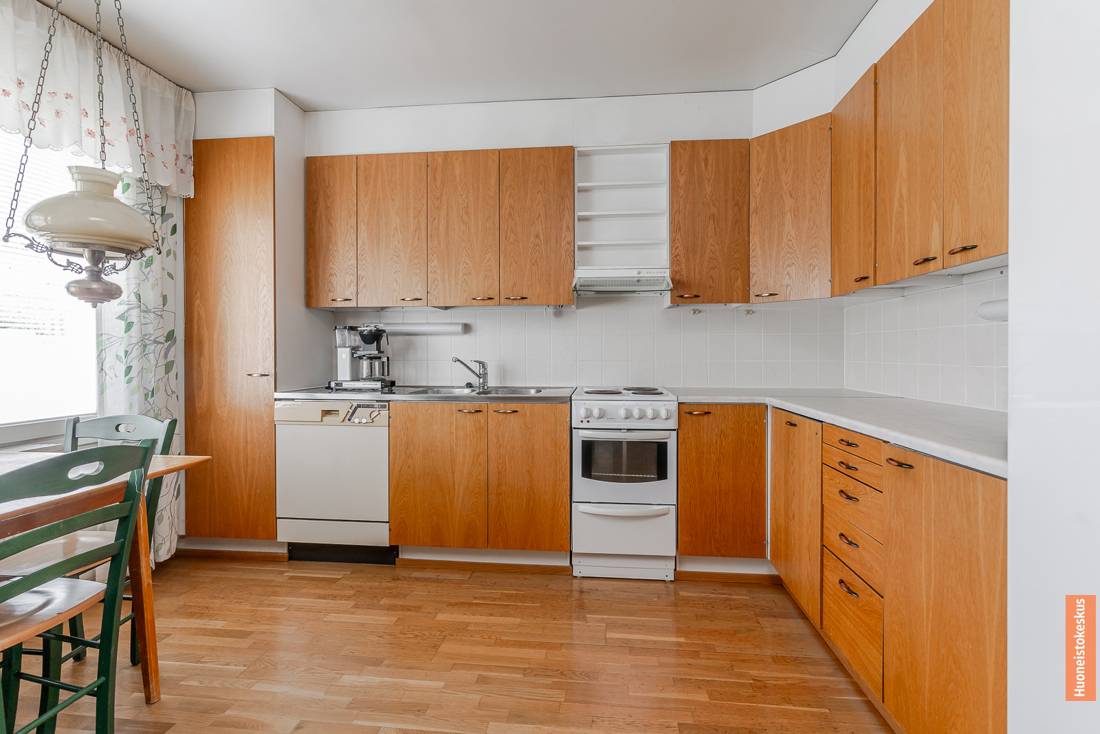 | Keittiön kuvaus | Liesi (Valurautaliesi), työtasot (laminaatti), seinät (kaakeli ja maali), lattiat (parketti), jääkaappipakastin, liesi, liesituuletin ja astianpesukone |