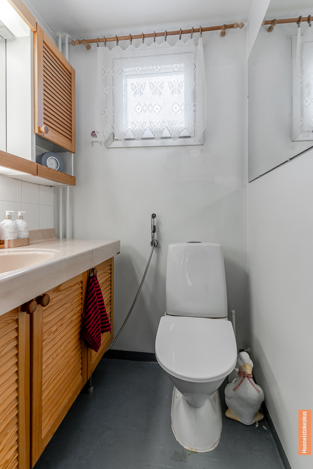 | Kylpyhuoneen kuvaus | WC-istuin, suihku, pesukoneliitäntä, bidee-suihku ja peili, lattiat (muovimatto) |