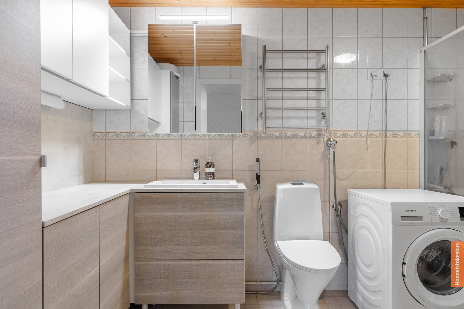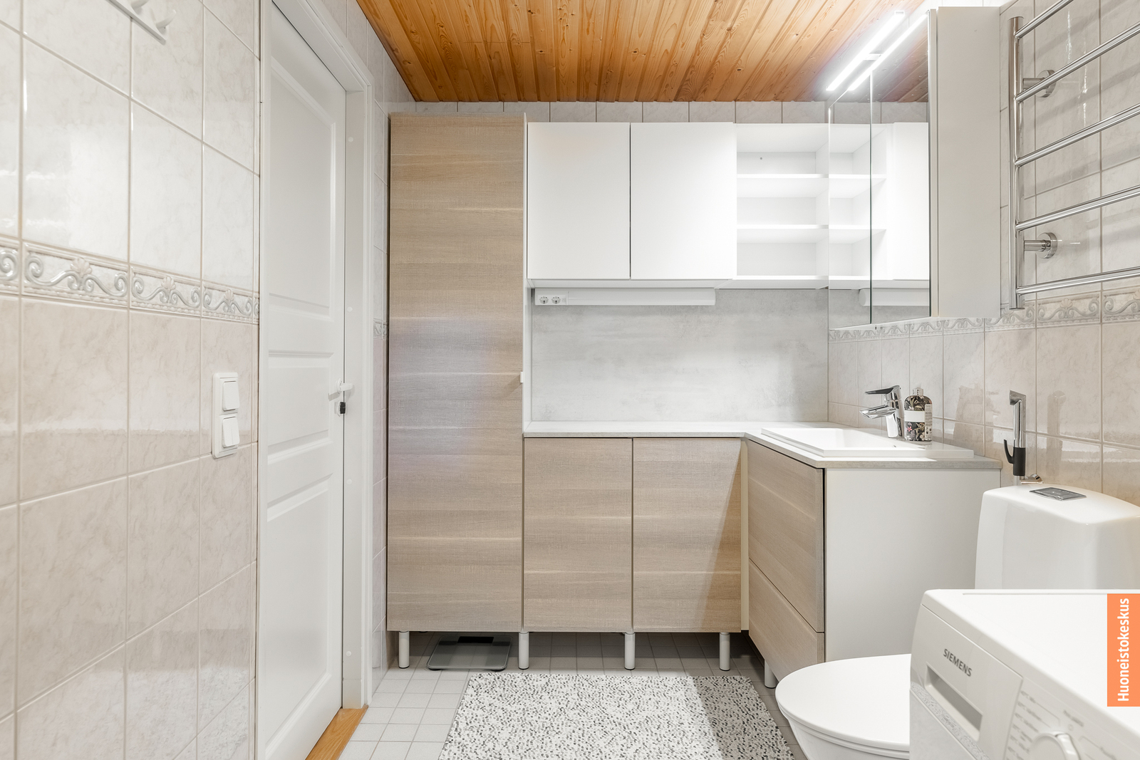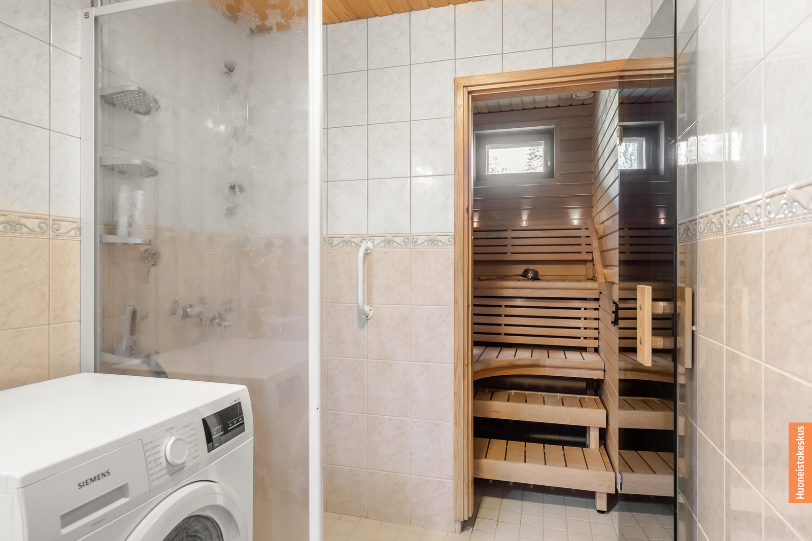 Kylpyhuone on alkuperäinen mutta edelleen siisti – kalusteet ja sauna on uusittu vuonna 2021, joten kokonaisuus palvelee vielä pitkään. Eteisen yhteydestä löytyy vaatehuone tarjoamaan runsaasti säilytystilaa.