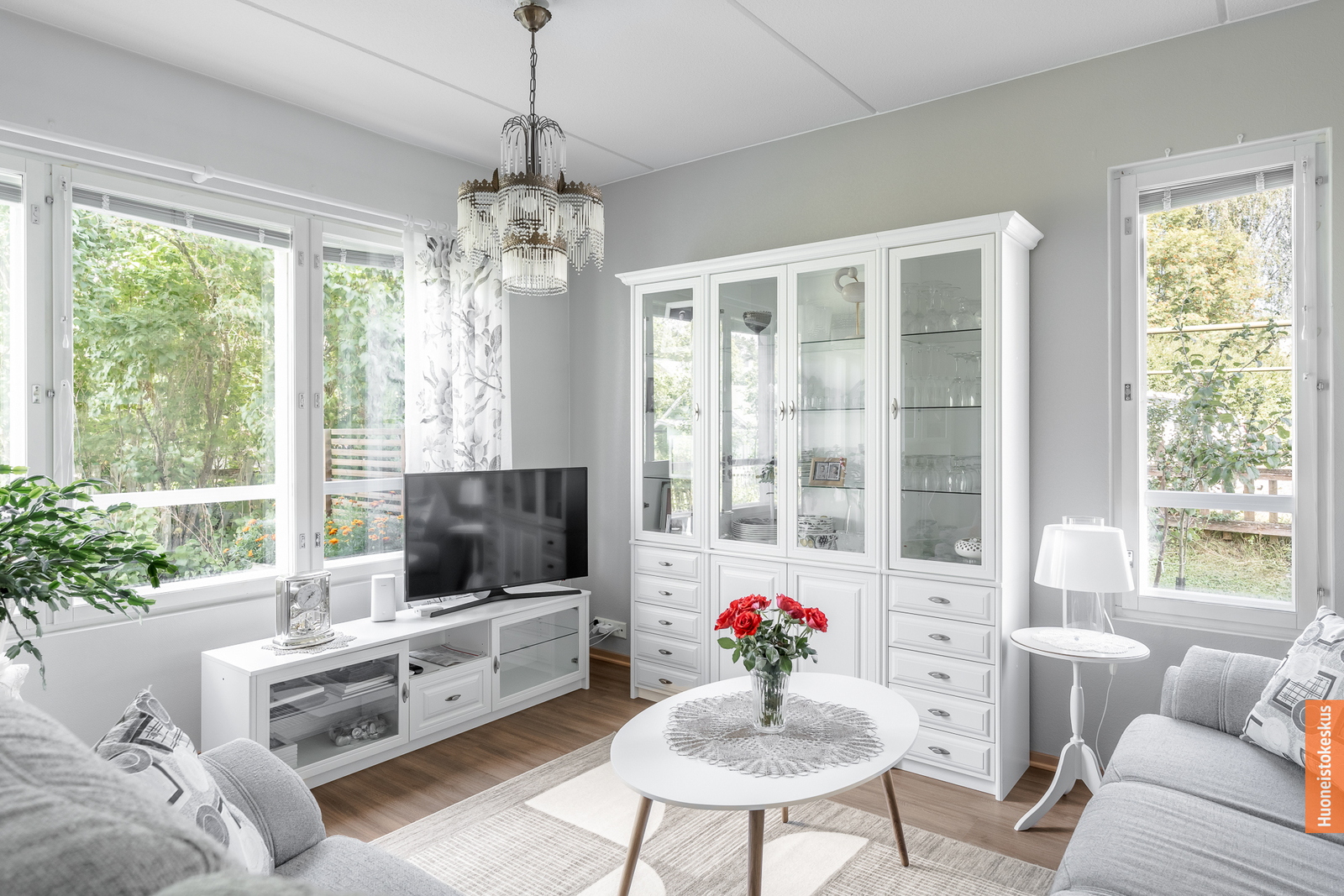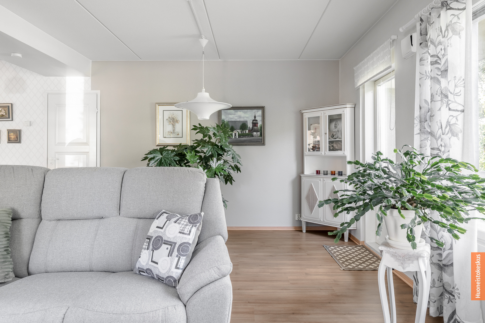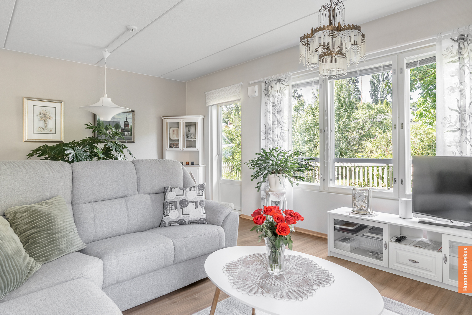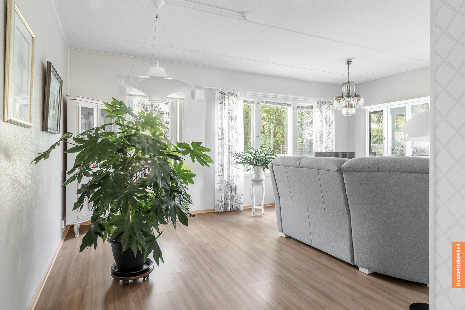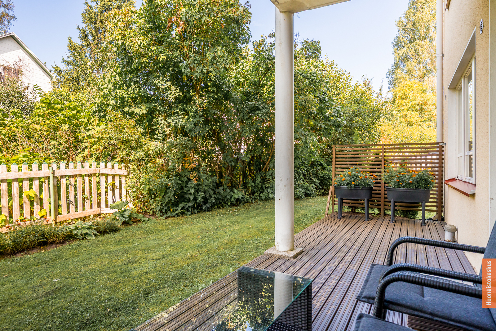 Olohuoneen suuret ikkunat tuovat tilaan valoa ja avaruutta, ja sieltä avautuu käynti suojaisalle takapihalle. Takapihalta löytyy terassi grillihetkiin, pieni kukkamaa viherpeukalolle sekä juuri sopivasti tilaa rentoutumiseen.