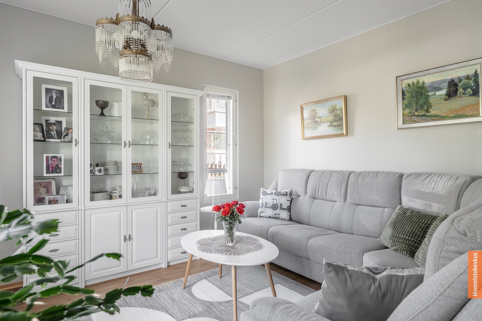 | Olohuoneen kuvaus | Seinät (tapetti ja maali), lattiat (laminaatti) |