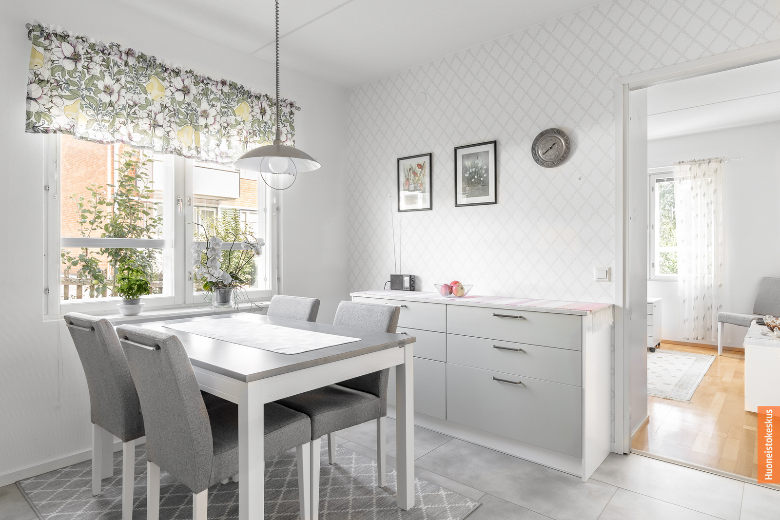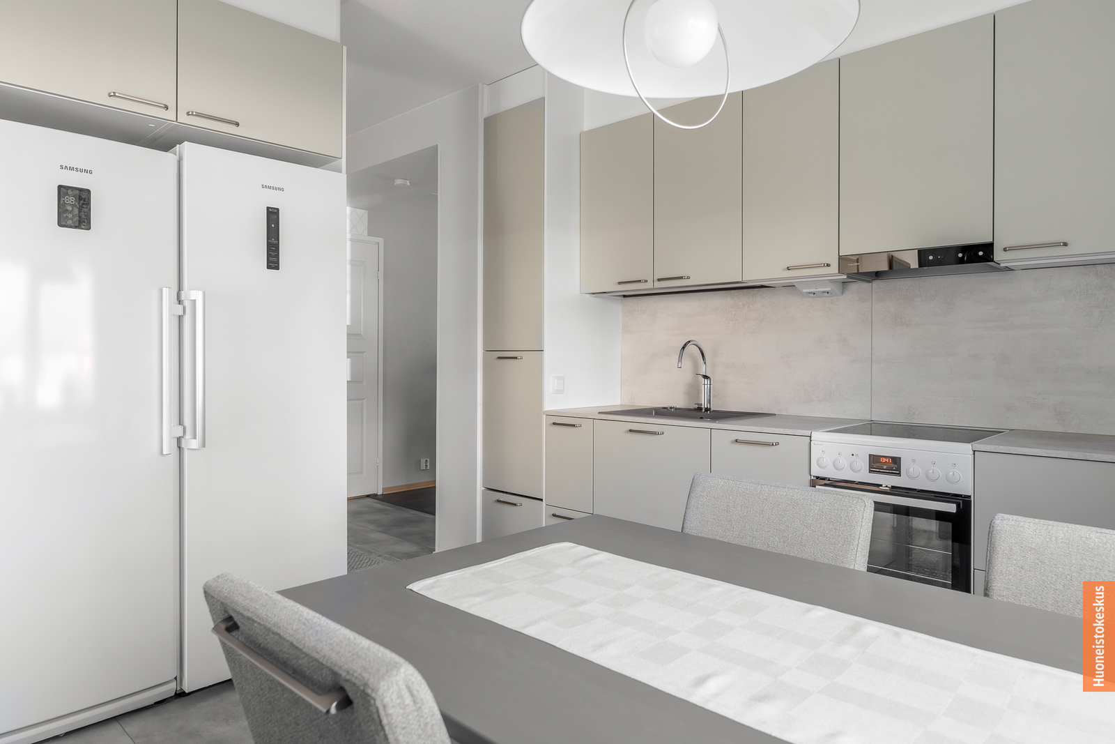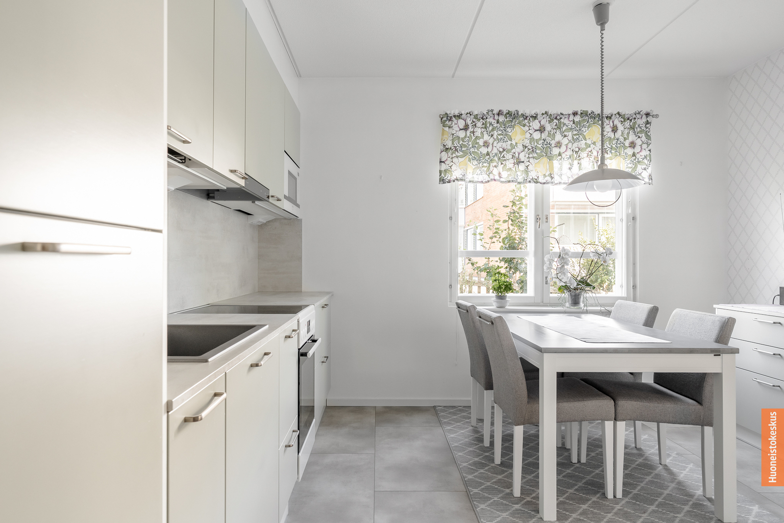 | Keittiön kuvaus | Liesi (Induktioliesi), työtasot (laminaatti), seinät (tapetti ja lasikuitutapetti), lattiat (vinyyli), erillinen pakastin, mikroaaltouuni, liesituuletin, liesi, jääkaappi ja astianpesukone |
