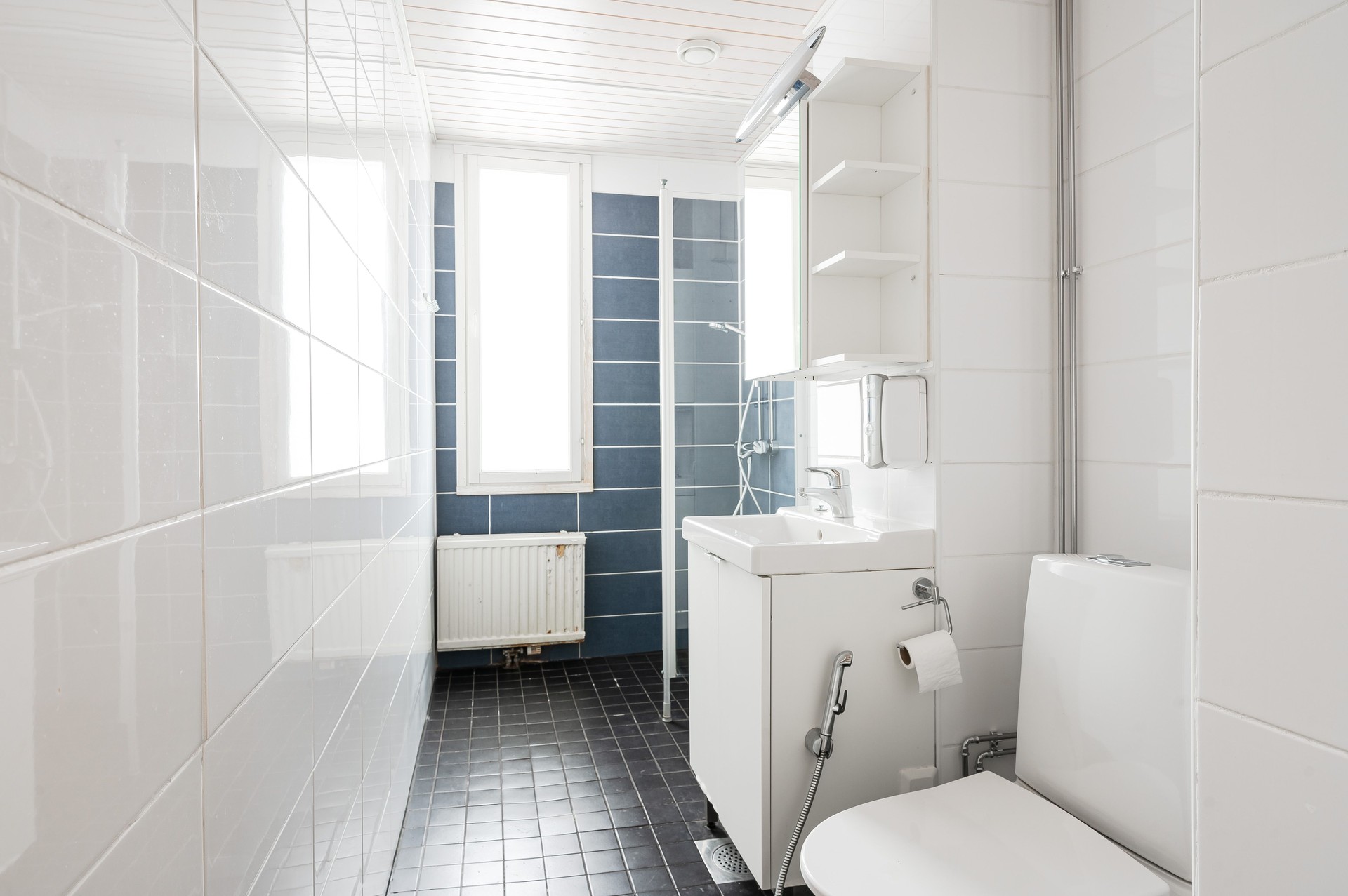 | Kylpyhuoneen kuvaus | WC-istuin, suihku, suihkuseinä, pesukoneliitäntä, peilikaappi ja bidee-suihku, seinät (kaakeli), lattiat (laatta) |