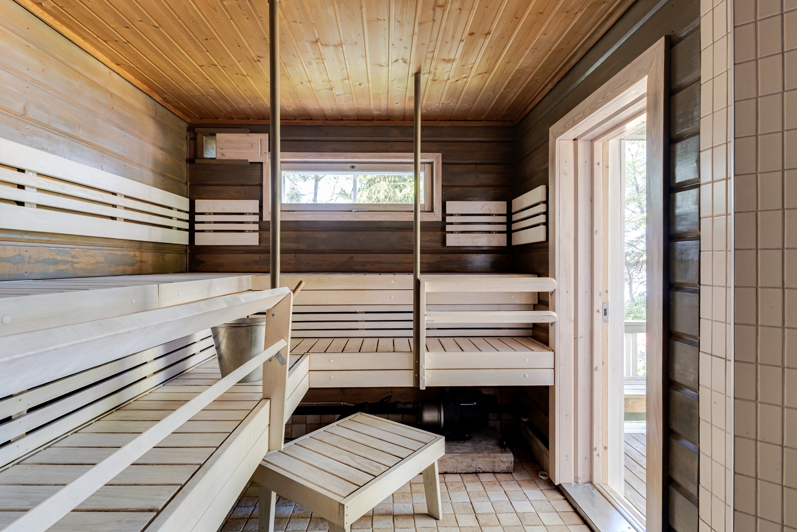 | Saunan kuvaus | Seinät (puu), lattiat (laatta), Puukiuas |