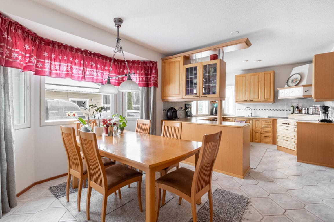 | Keittiön kuvaus | Liesi (Induktioliesi), työtasot (laminaatti), seinät (laatta ja maali), lattiat (laatta), liesituuletin, liesi, jääkaappi, astianpesukone ja erillinen pakastin |