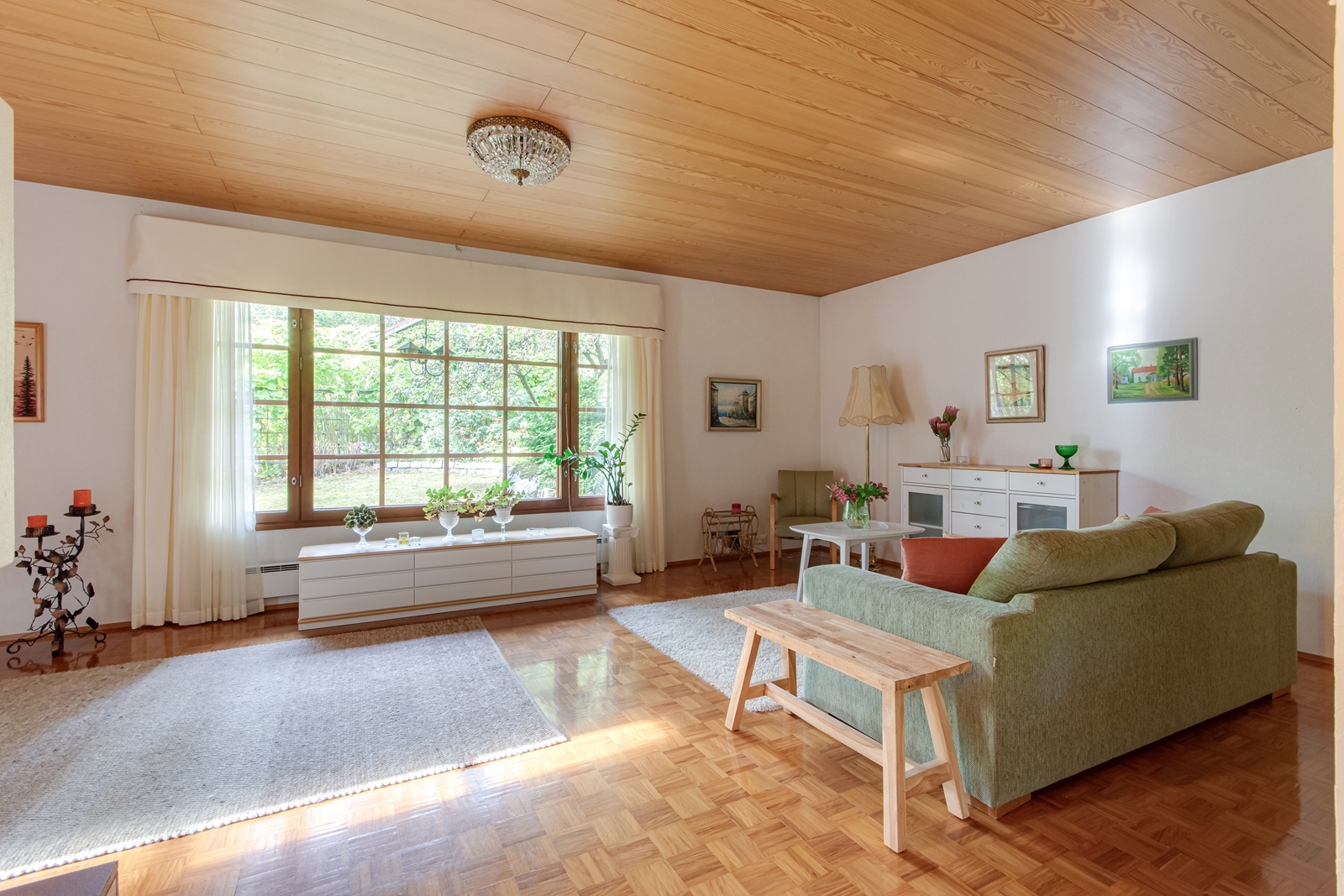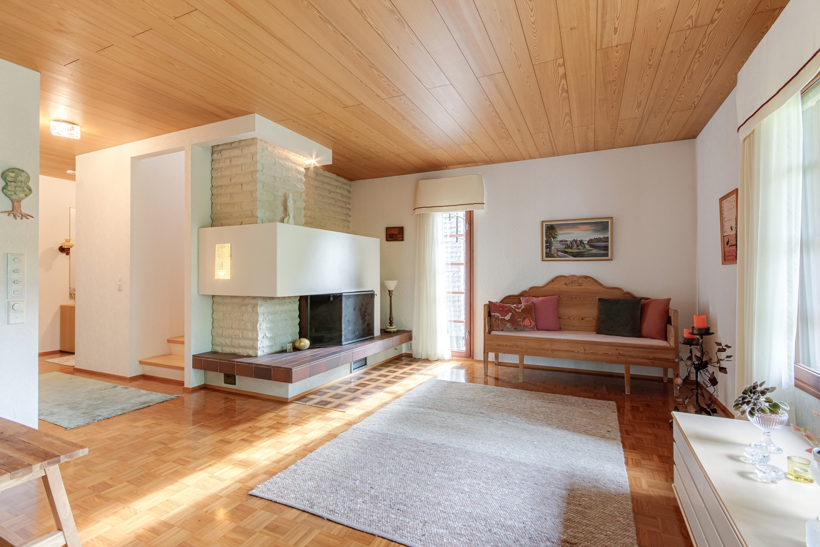 Tilavasta olohuoneesta on vehreät rauhaisat luontonäkymät, avotakan luodessa tunnelmaa. Olohuoneeseen mahtuu myös ruokailuryhmä. Eteiskäytävässä on hyvin säilytystilaa. Ensimmäisessä kerroksessa on lisäksi kylpyhuone, sauna, wc sekä kodinhoitohuone, josta on käynti takapihan terassille.