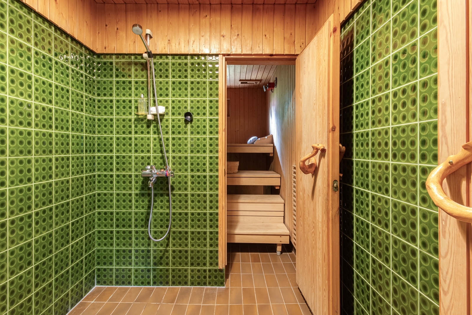 | Saunan kuvaus | Seinät (puu ja kaakeli), Sähkökiuas, ikkunallinen |