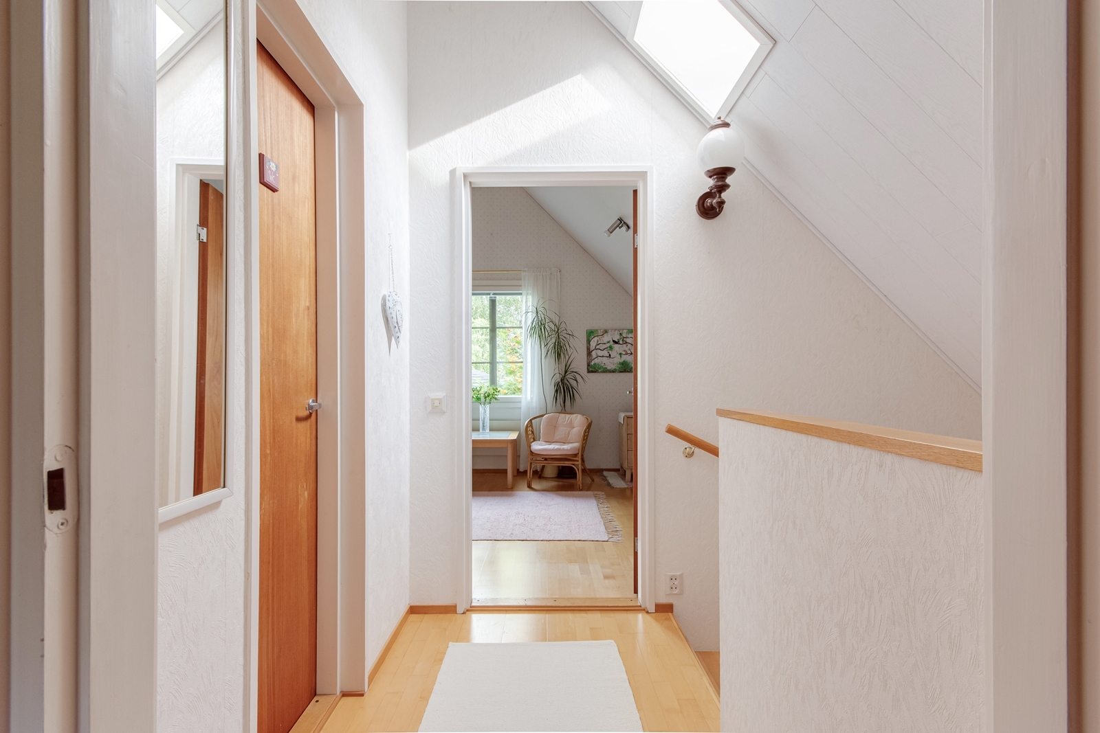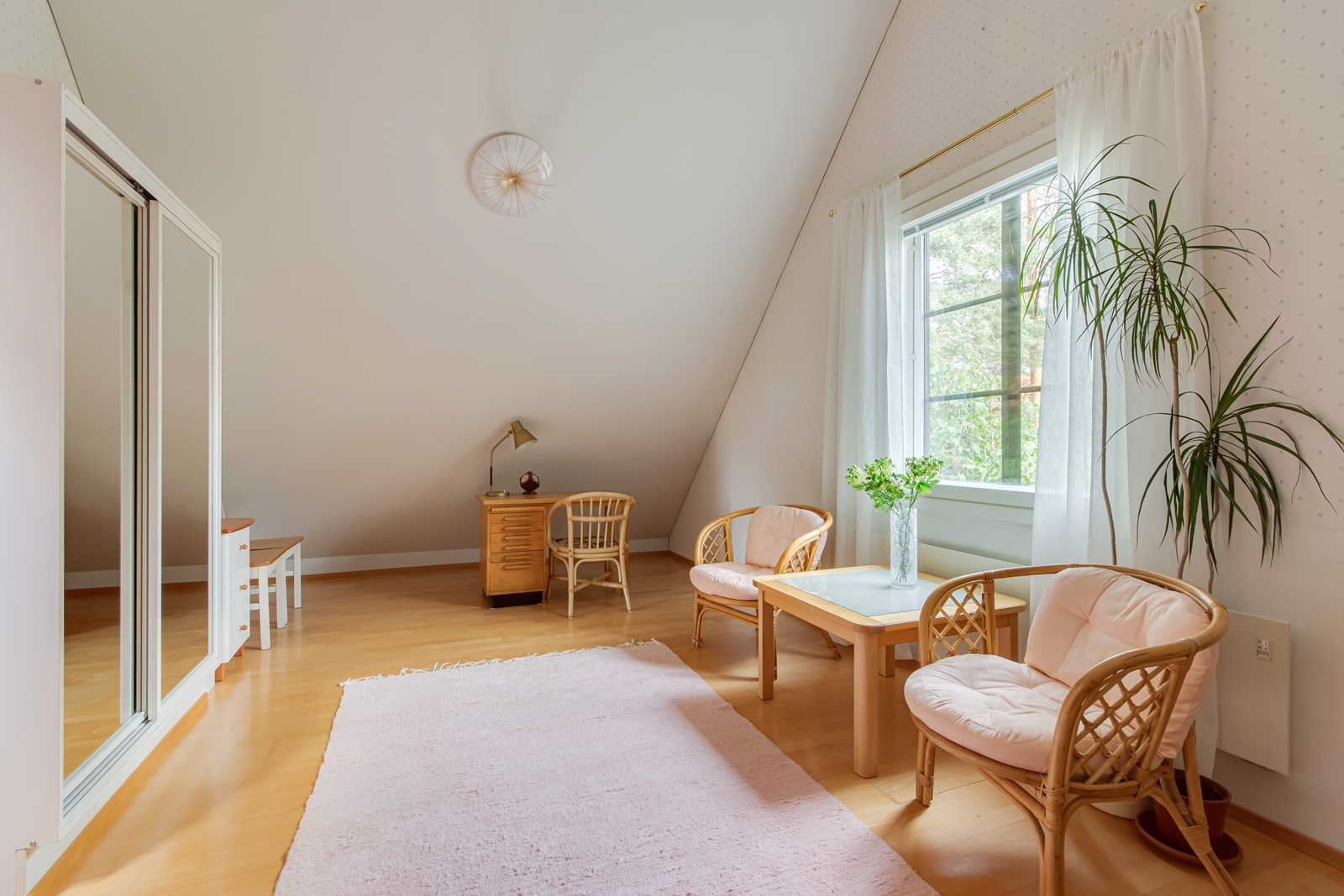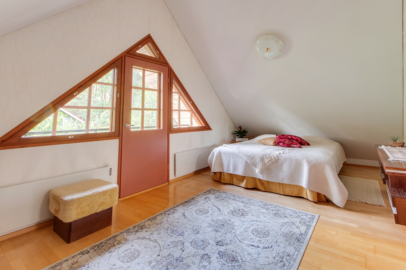 Kaksi isoa makuuhuonetta, joista toisen yhteydessä on tulisija, vaatehuone ja käynti parvekkeelle. Toisessa kerroksessa on talon toinen wc.