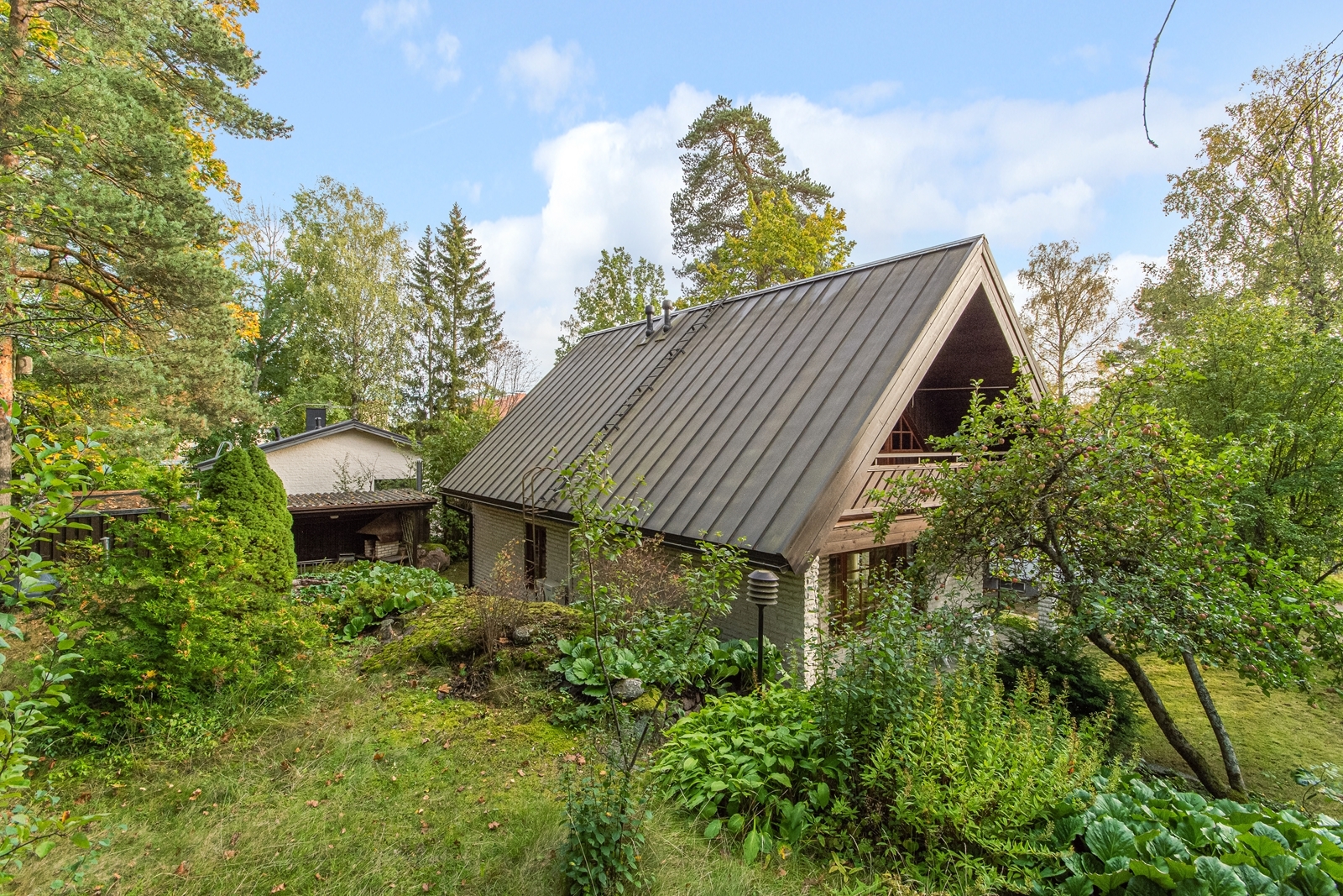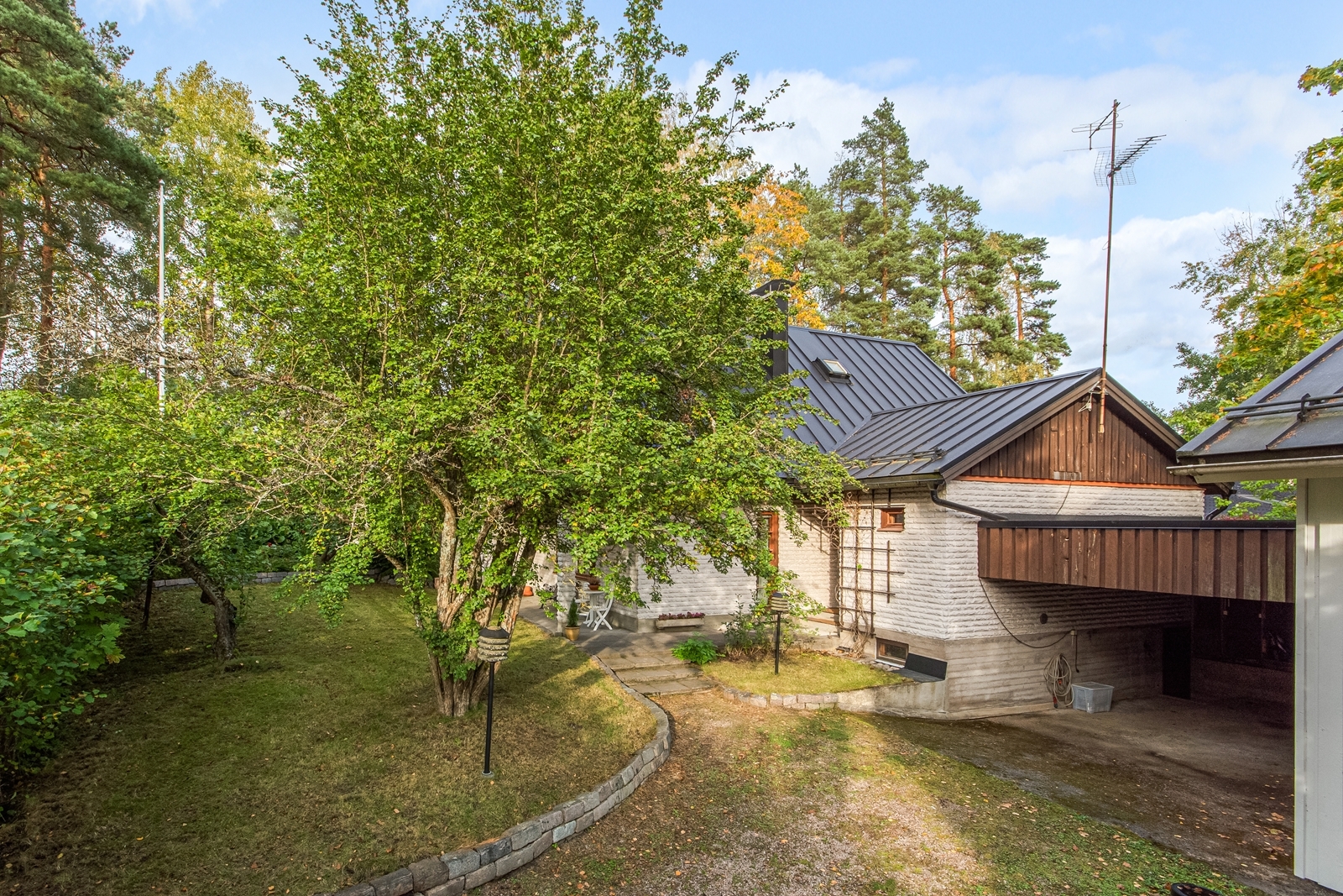 Tämä autokatoksella kytketty omakotitalo sijaitsee rauhallisen kadun varrella, luonnontilaisena säilytettävän alueen vieressä, ostoskeskuksen ja koulun läheisyydessä. Taloa ympäröivä suojaisa puutarhamainen rinnetontti tarjoaa tilaa istutuksille, puutarhanhoidolle ja lasten leikeille. Oma 634 m² tonttiosuus, talon tarkistusmitattu kokonaispinta-ala 153,5 m².