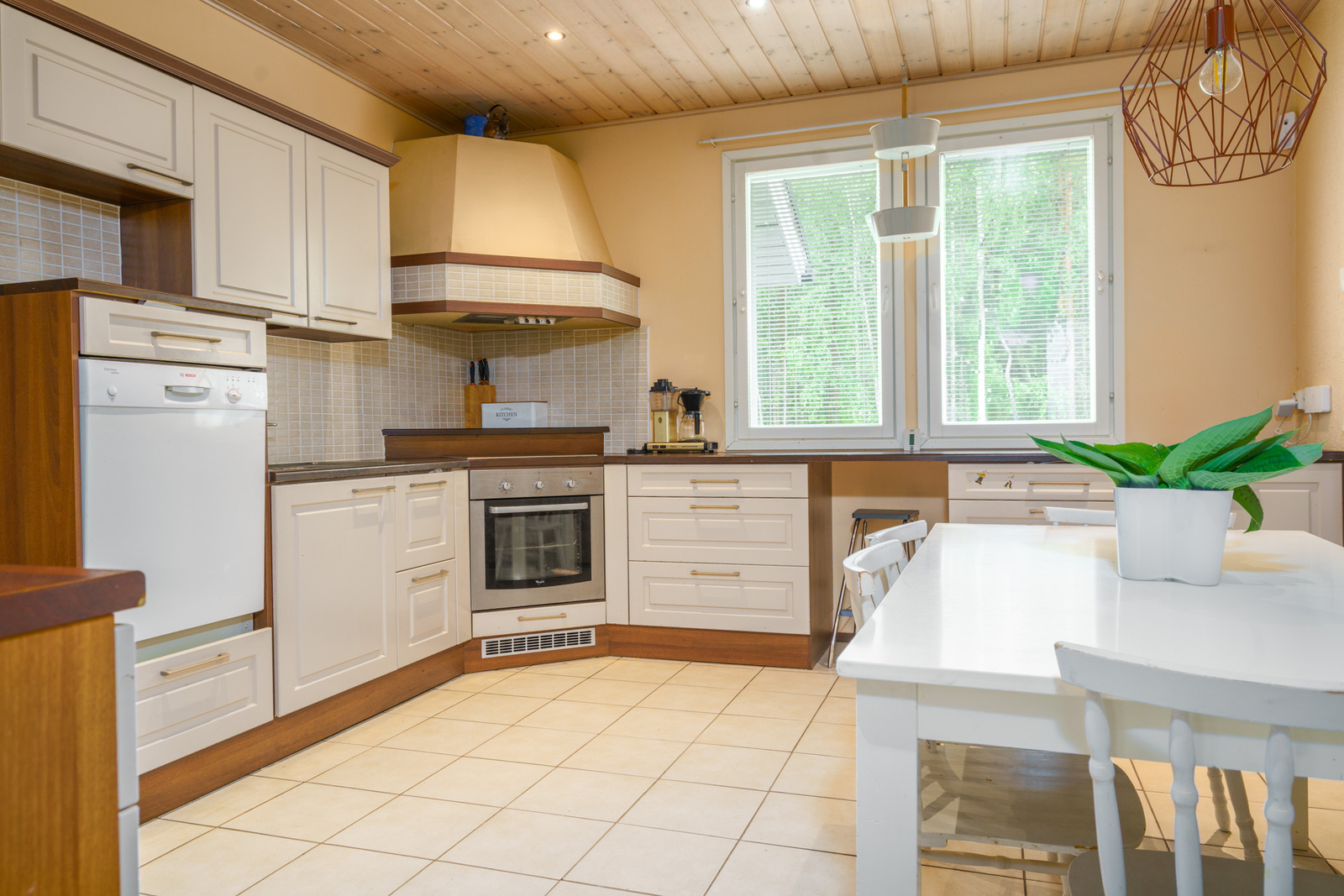 Liesi (Keraaminen liesi), työtasot (laminaatti), seinät (maali), lattiat (laatta), liesituuletin, jääkaappi, astianpesukone ja erillinen pakastin |